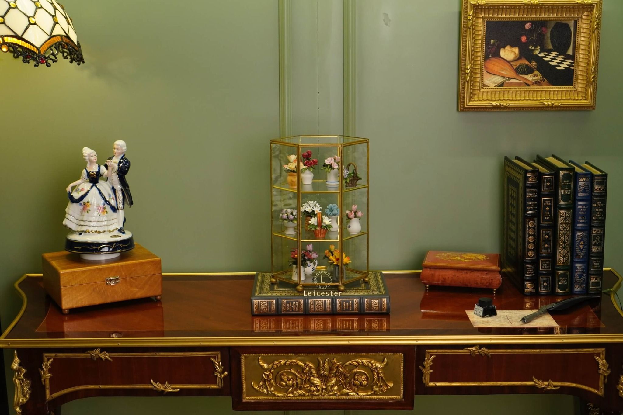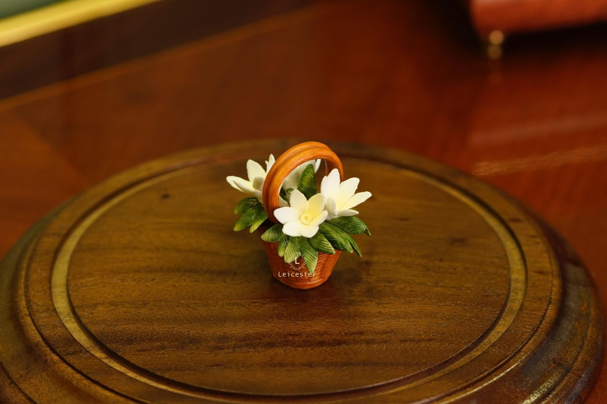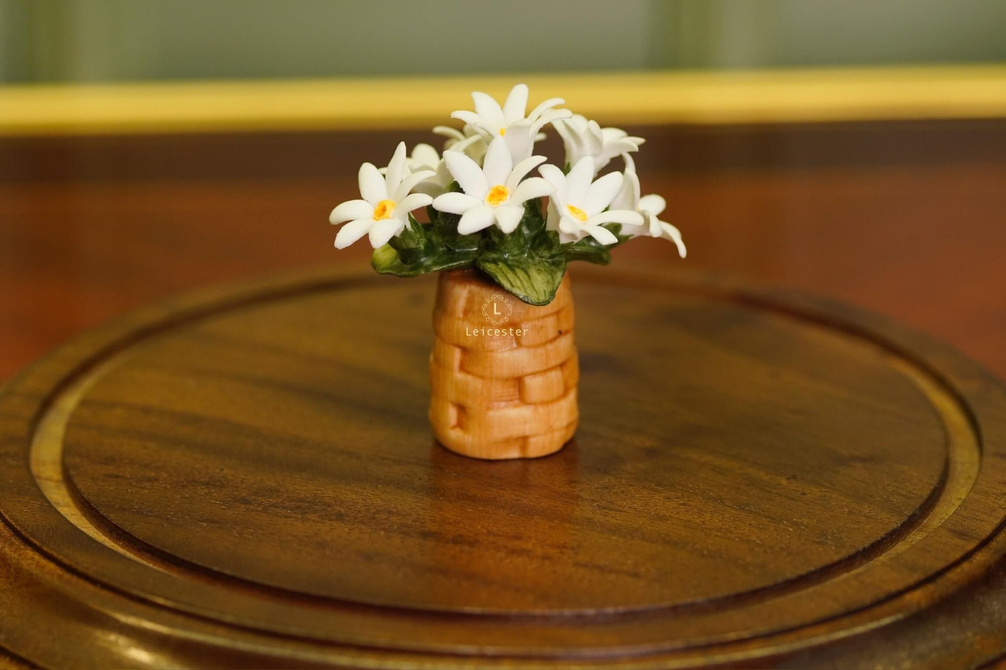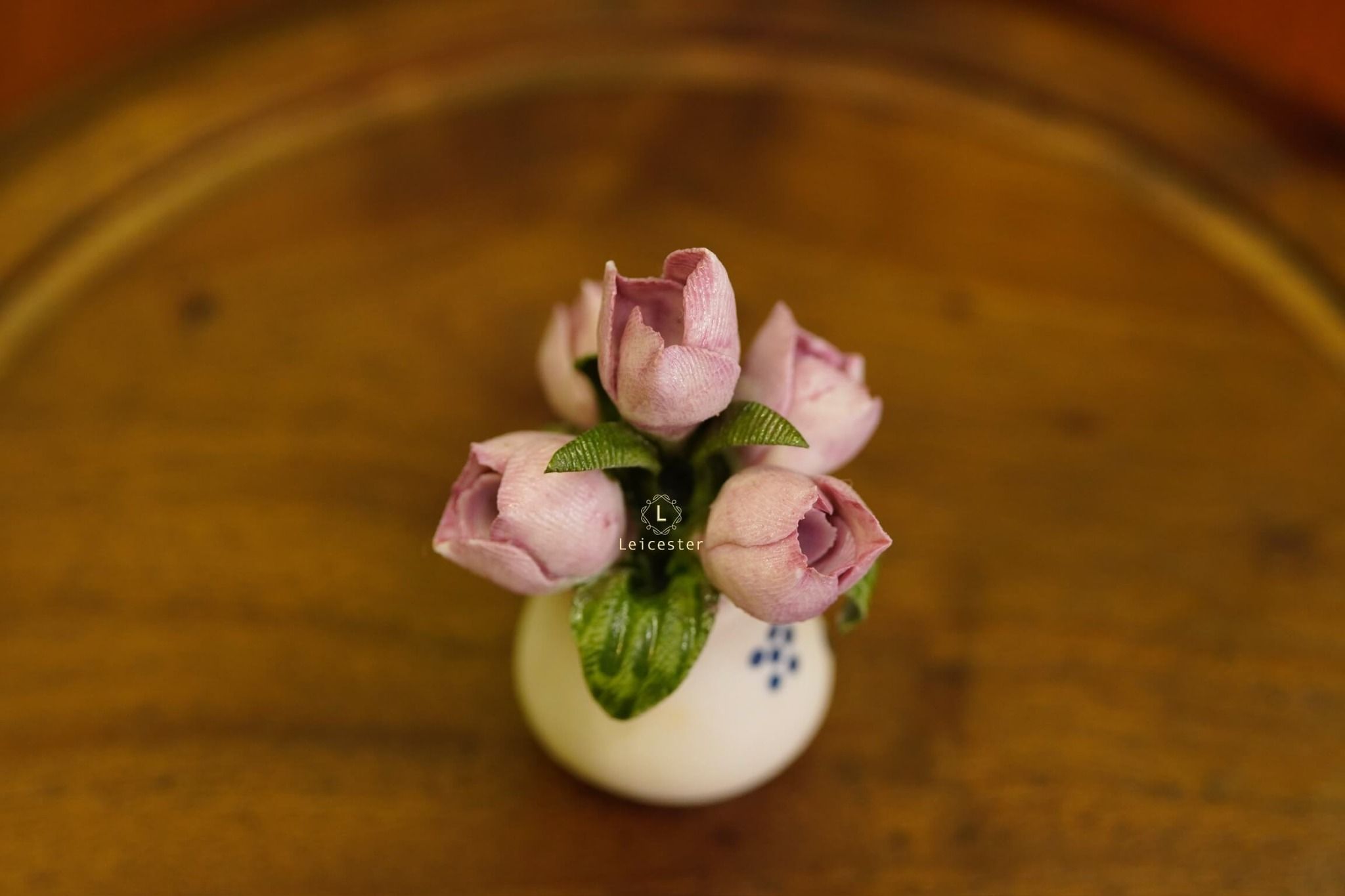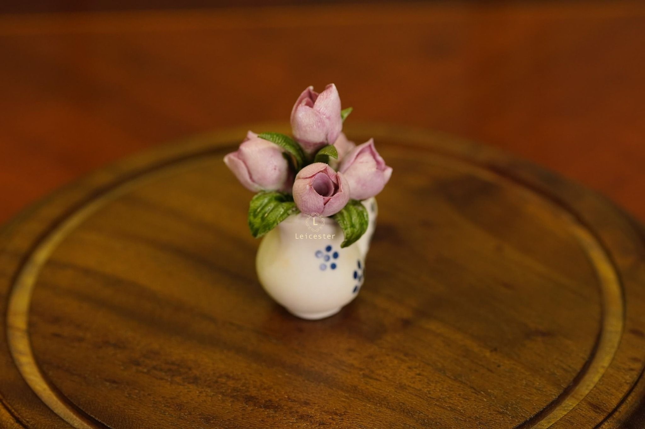 Bộ sưu tập gồm 13 mô hình hoa sứ thủ công, đại diện cho 12 tháng trong năm, được chế tác bằng gốm sứ cao cấp, nhuộm màu thủ công và tạo hình mềm mại đến từng cánh hoa. Từ giỏ hoa thủ công đến những chiếc bình mini, mỗi mẫu đều mang sắc thái riêng biệt, như một lát cắt tinh tế của bốn mùa. Tất cả được trưng bày trong một tủ kính 6 cạnh viền đồng ánh kim, tạo nên bố cục trang nhã và thanh lịch như một góc triển lãm thu nhỏ giữa đời sống hiện đại.