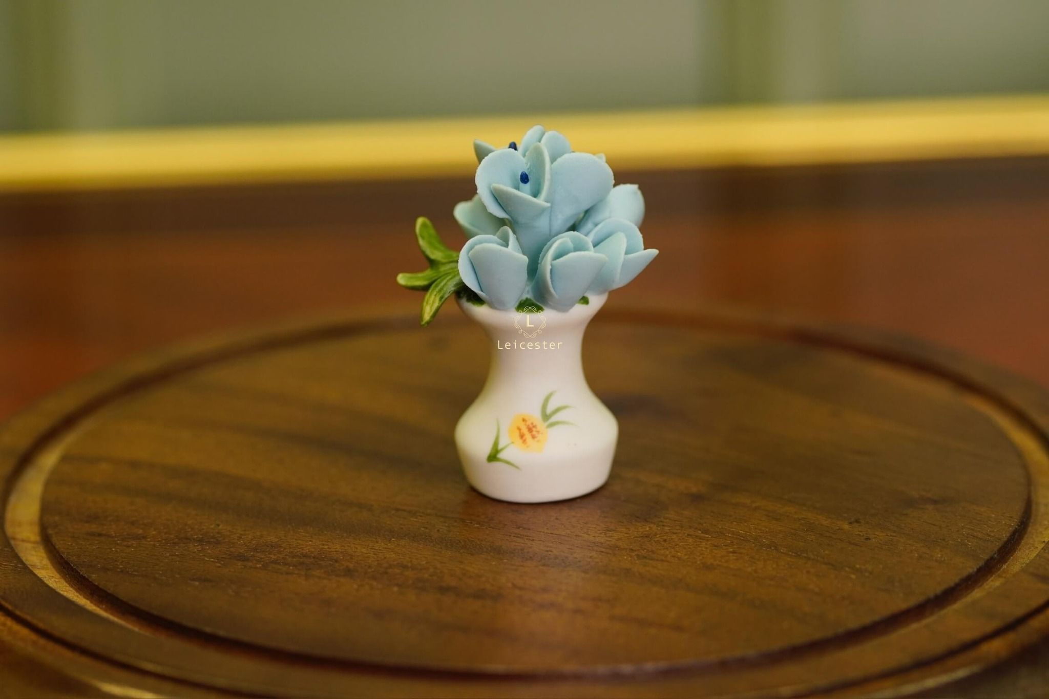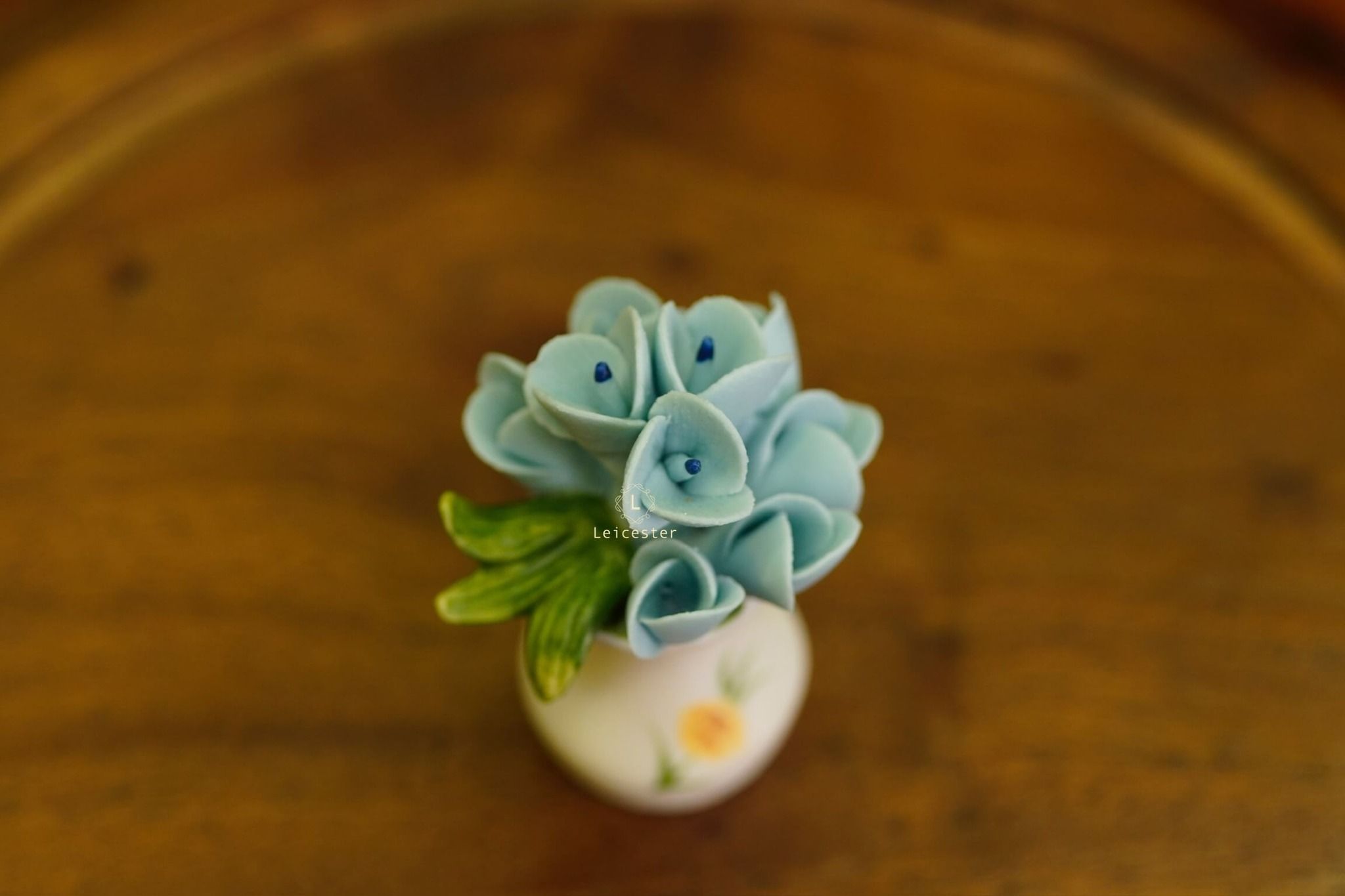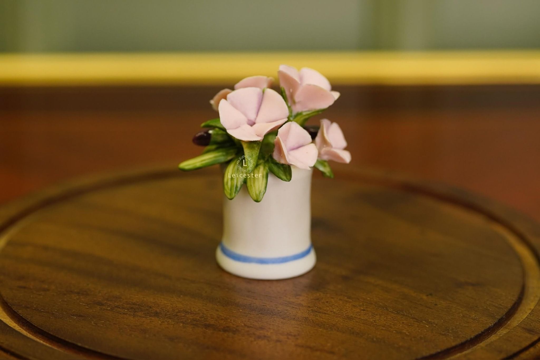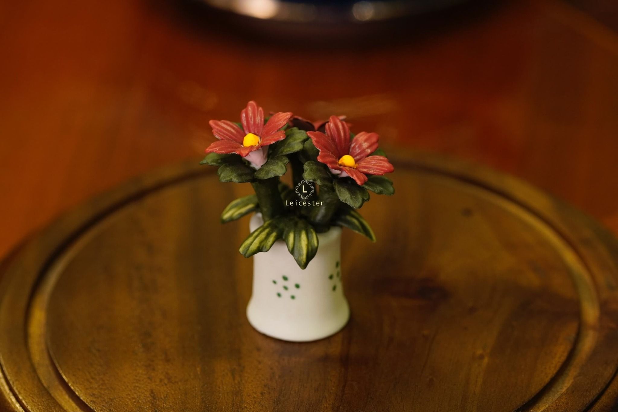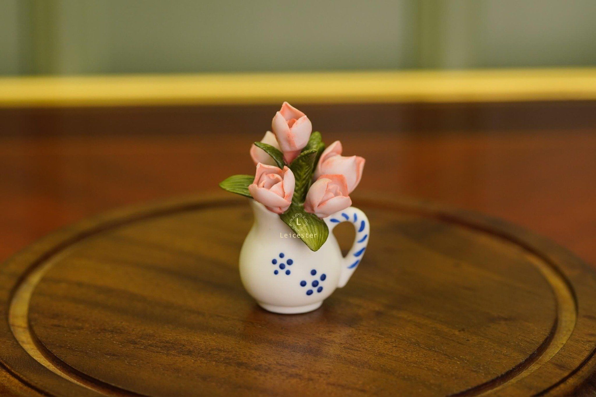 Bộ sưu tập gồm 13 mô hình hoa sứ thủ công, đại diện cho 12 tháng trong năm, được chế tác bằng gốm sứ cao cấp, nhuộm màu thủ công và tạo hình mềm mại đến từng cánh hoa. Từ giỏ hoa thủ công đến những chiếc bình mini, mỗi mẫu đều mang sắc thái riêng biệt, như một lát cắt tinh tế của bốn mùa. Tất cả được trưng bày trong một tủ kính 6 cạnh viền đồng ánh kim, tạo nên bố cục trang nhã và thanh lịch như một góc triển lãm thu nhỏ giữa đời sống hiện đại.