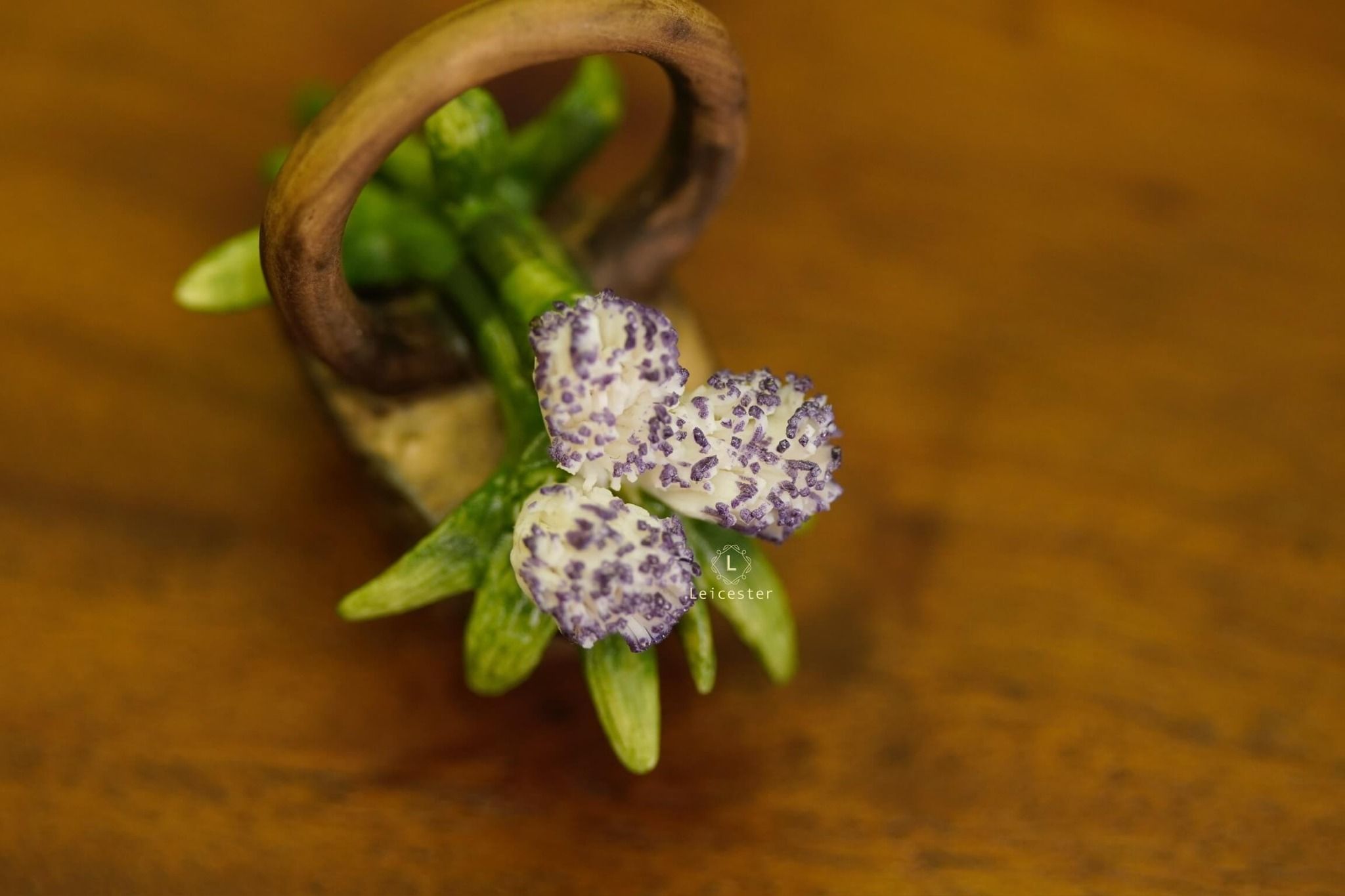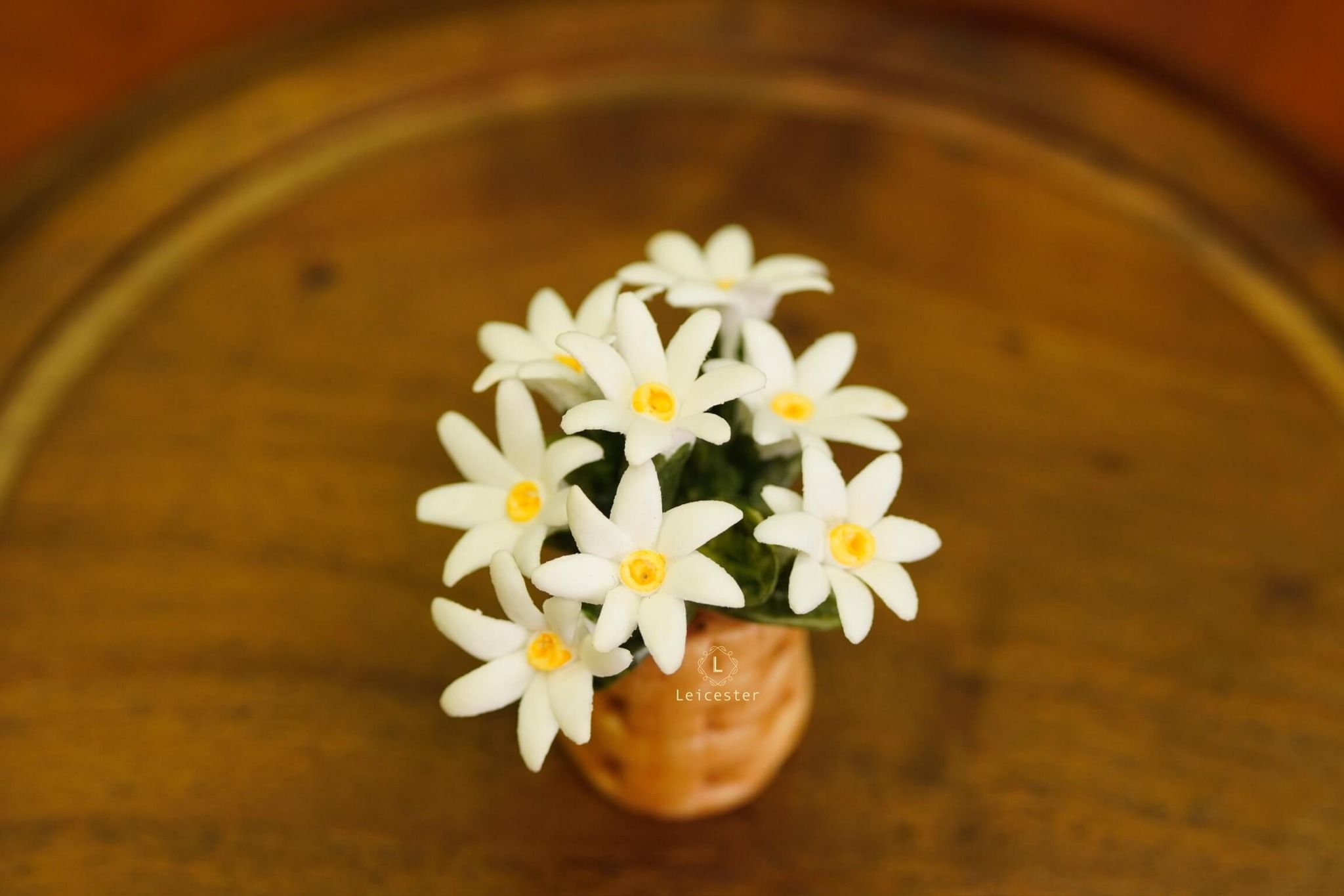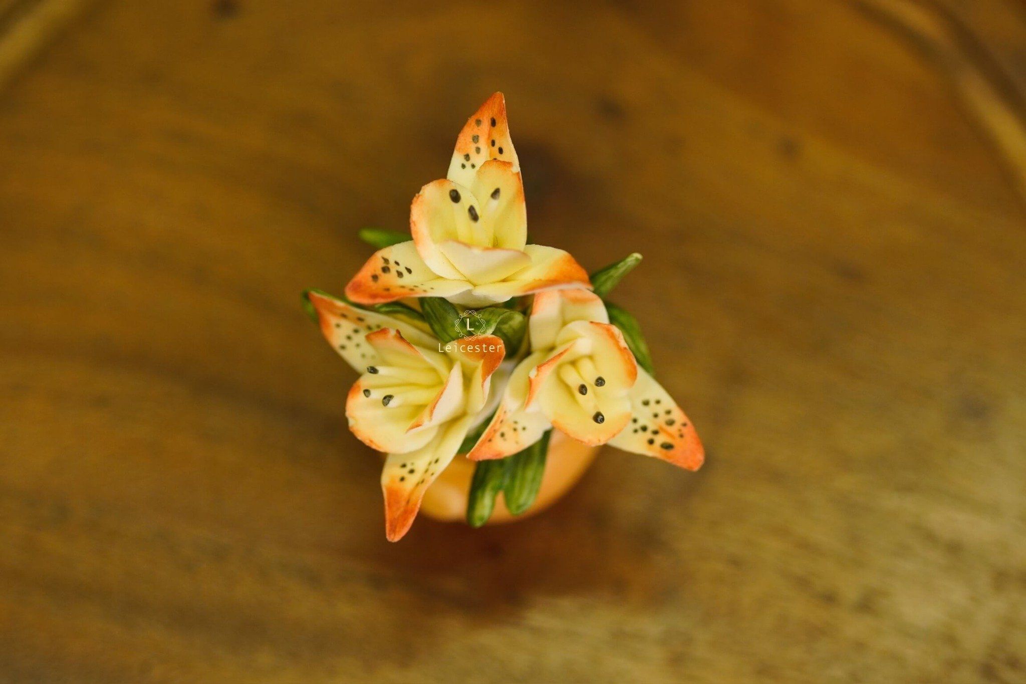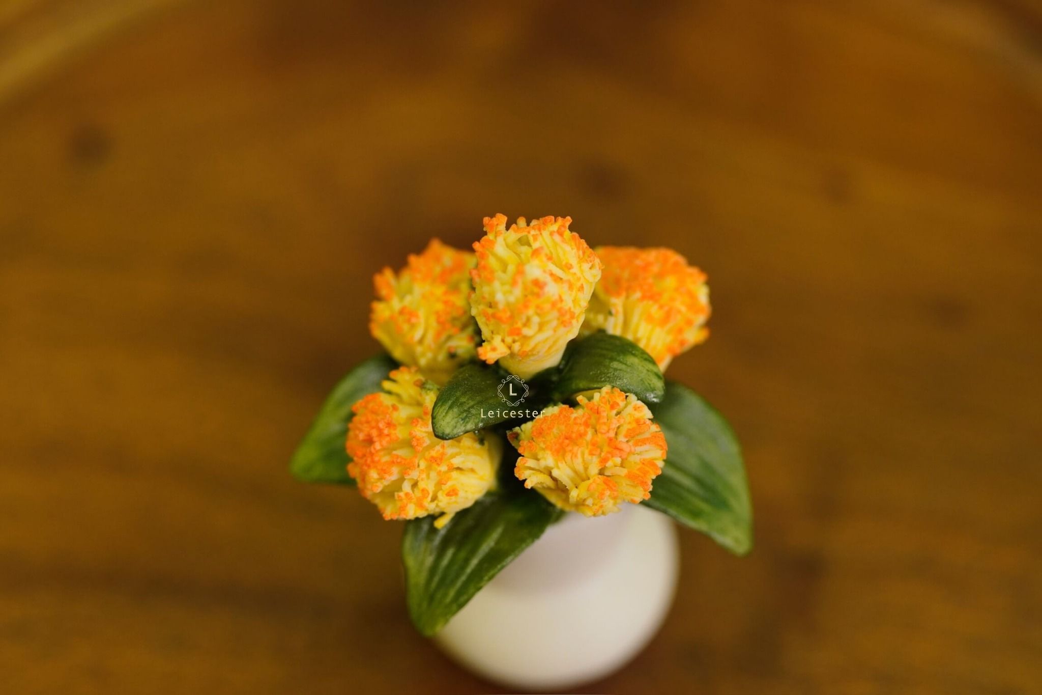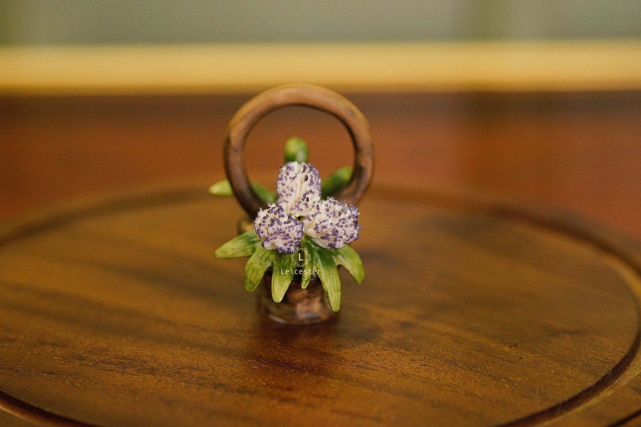 Bộ sưu tập gồm 13 mô hình hoa sứ thủ công, đại diện cho 12 tháng trong năm, được chế tác bằng gốm sứ cao cấp, nhuộm màu thủ công và tạo hình mềm mại đến từng cánh hoa. Từ giỏ hoa thủ công đến những chiếc bình mini, mỗi mẫu đều mang sắc thái riêng biệt, như một lát cắt tinh tế của bốn mùa. Tất cả được trưng bày trong một tủ kính 6 cạnh viền đồng ánh kim, tạo nên bố cục trang nhã và thanh lịch như một góc triển lãm thu nhỏ giữa đời sống hiện đại.