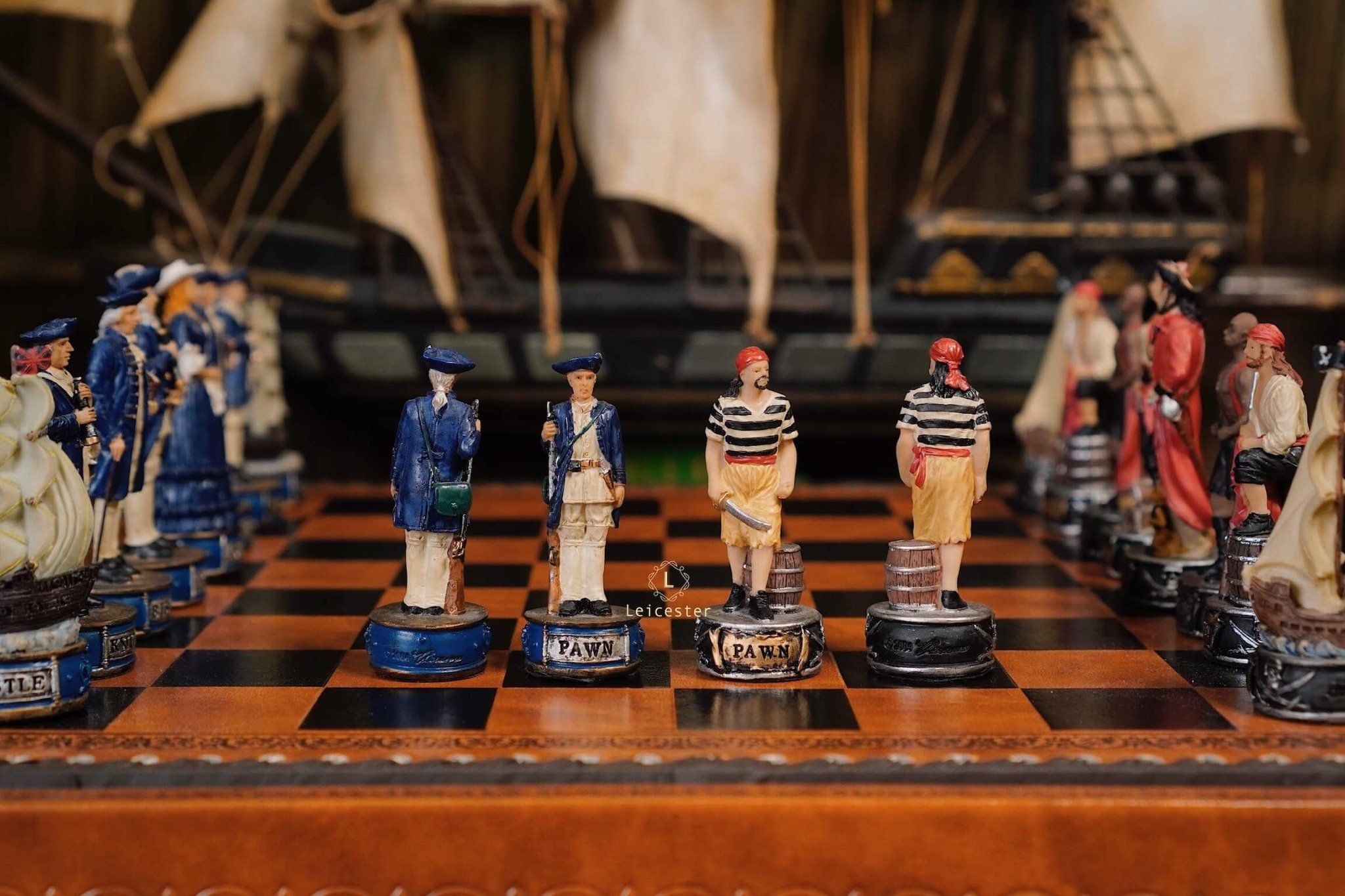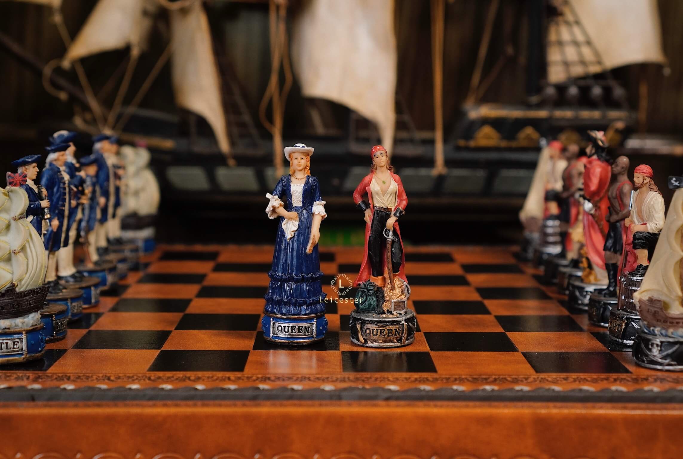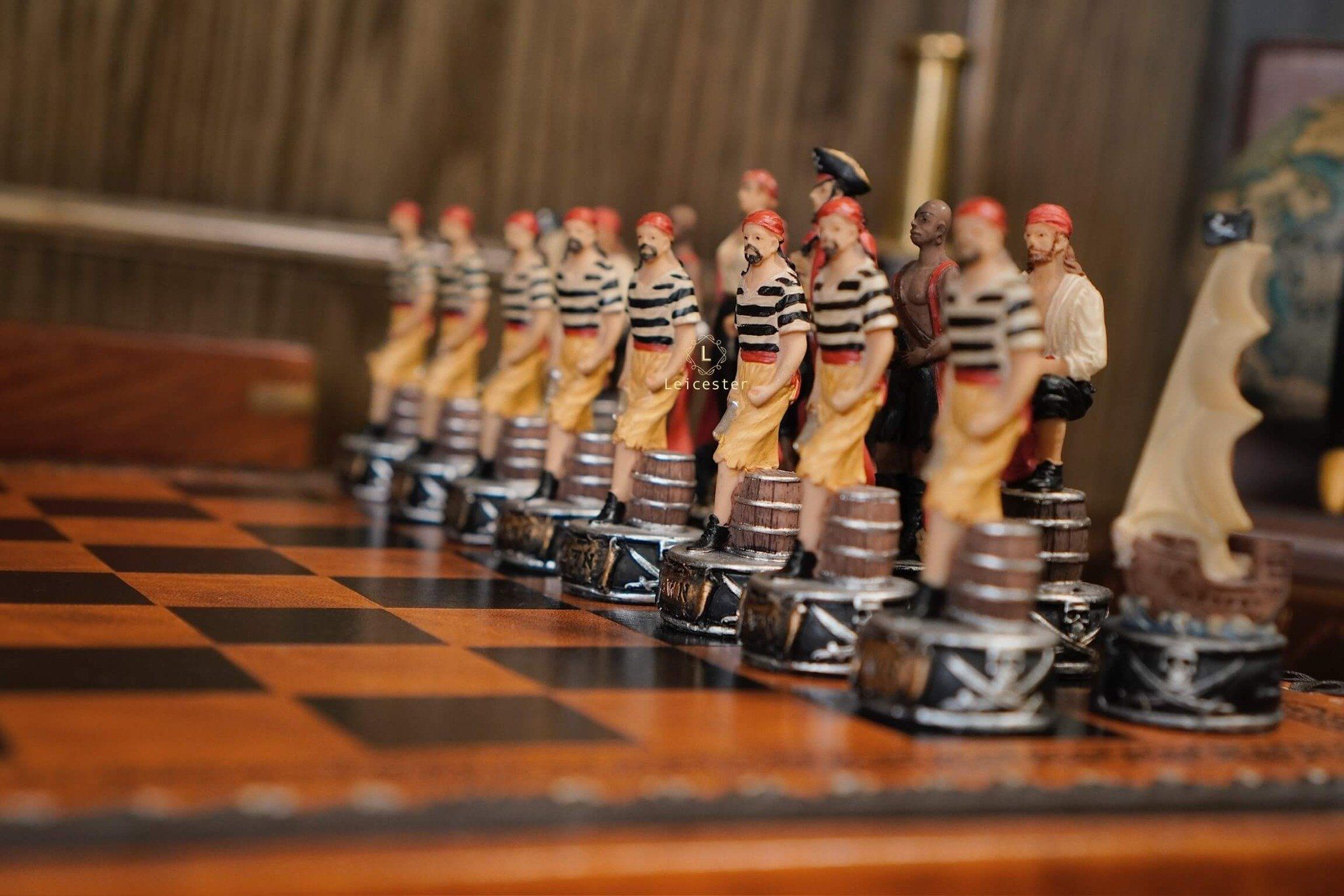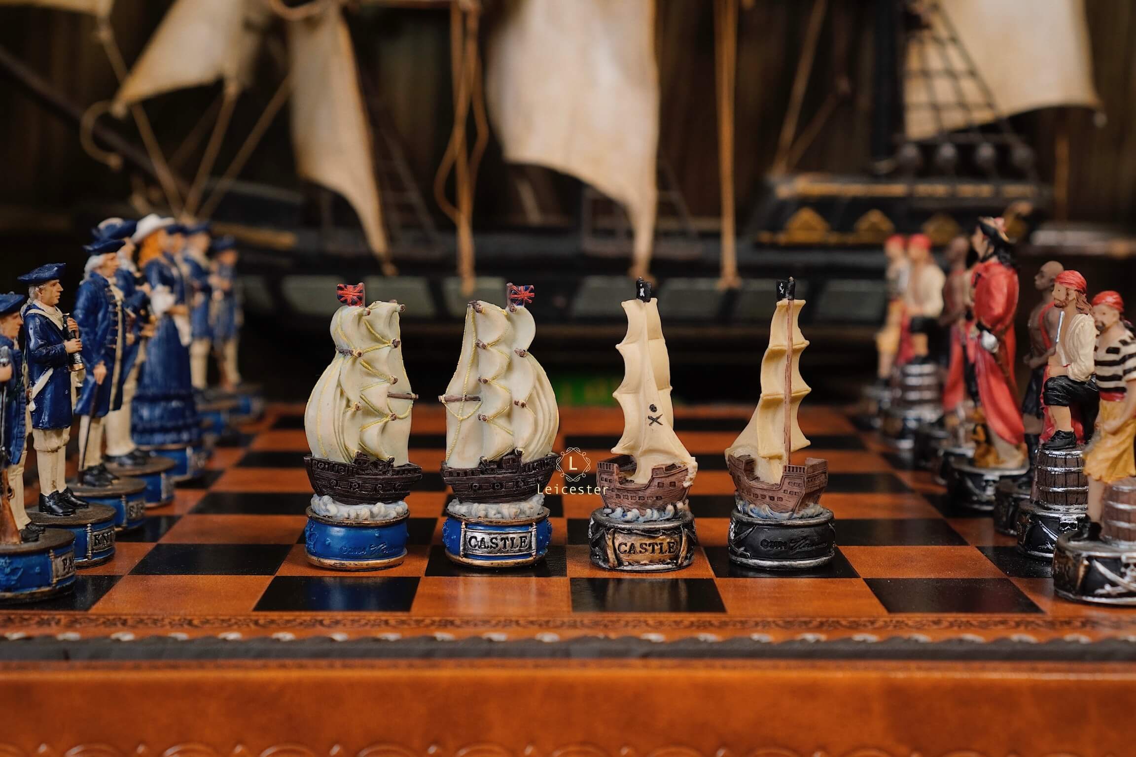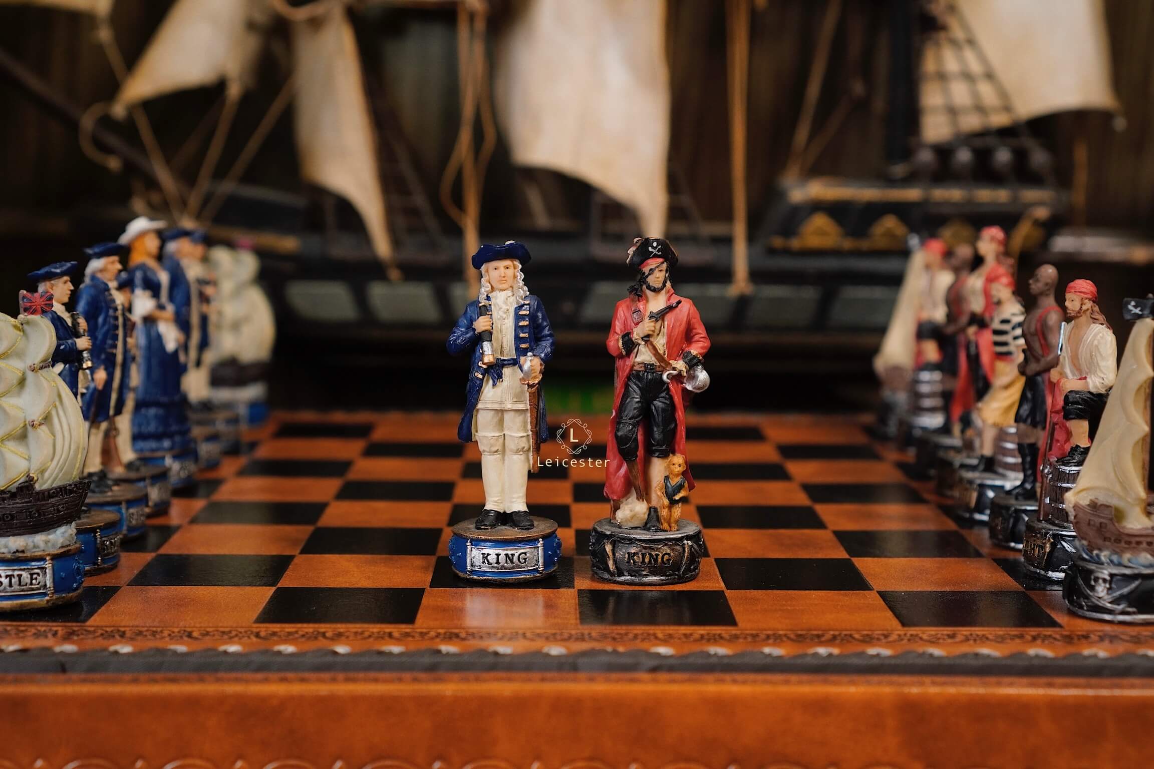 Bộ cờ được chế tác tinh xảo với chất liệu polyresin cao cấp, bàn cờ viền gỗ nâu đỏ sang trọng, mặt phối tông đen cam cùng các chi tiết được sơn thủ công để tạo hiệu ứng cổ điển. Phe Hải quân khoác áo xanh lam đậm, mang dáng đứng kỷ luật và ánh mắt quyết đoán. Phe Hải tặc nổi bật với khăn quấn đỏ, toát lên vẻ liều lĩnh của những kẻ làm chủ bão tố. Mỗi quân cờ như mang trong mình một câu chuyện, một khoảnh khắc của bản hùng ca giữa trật tự và hỗn loạn trên đại dương.
