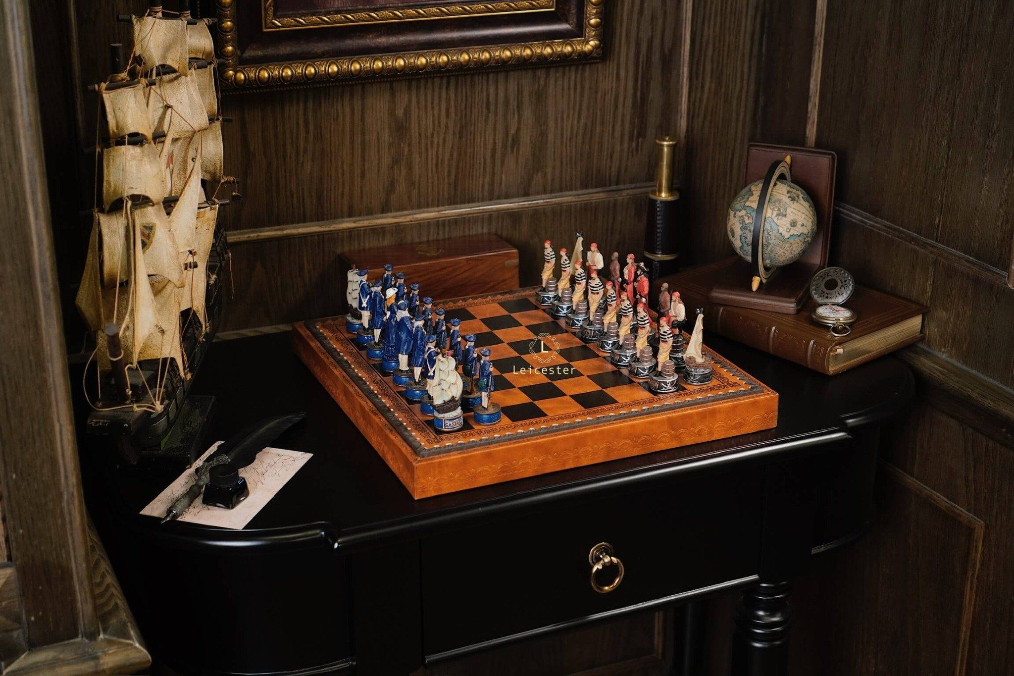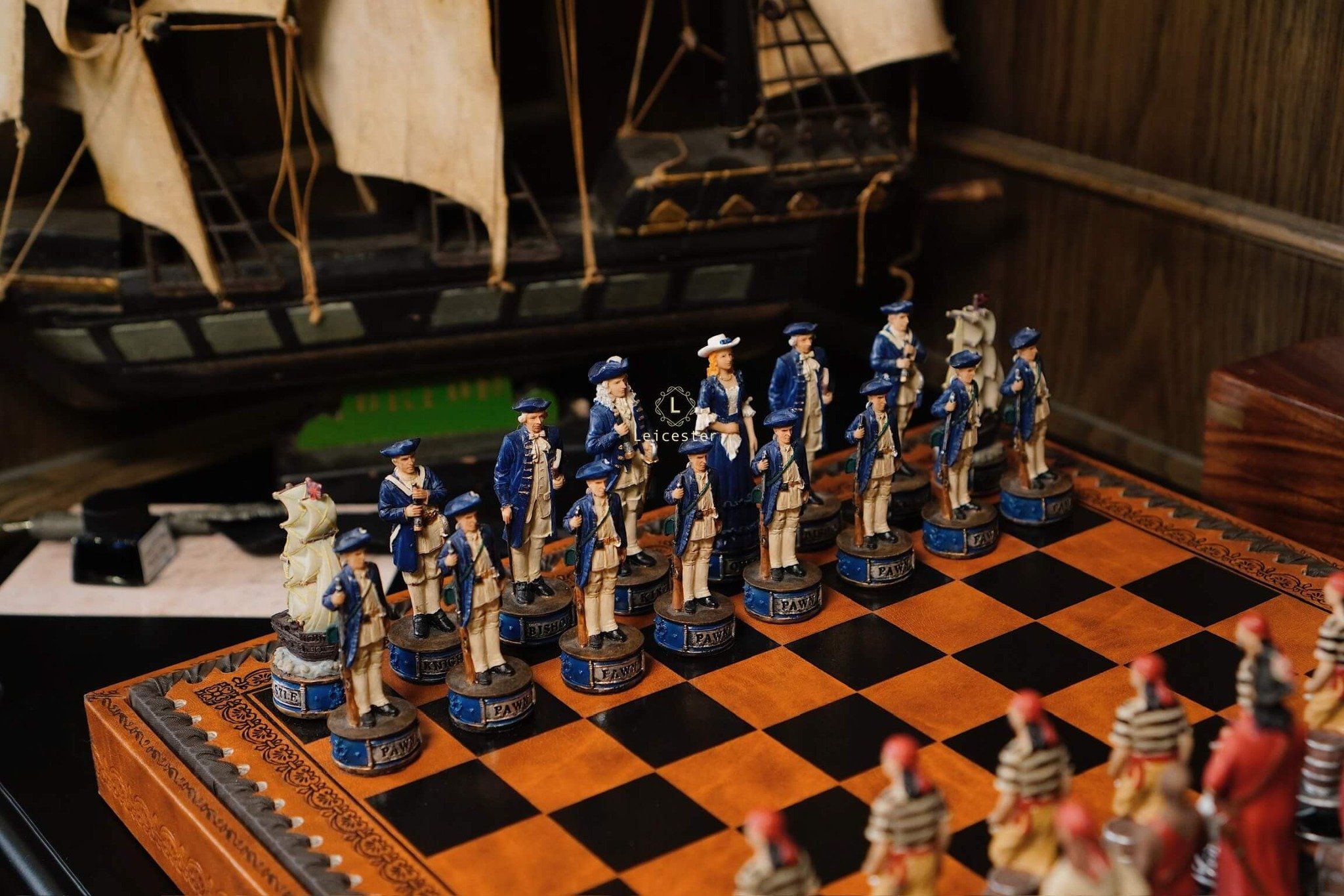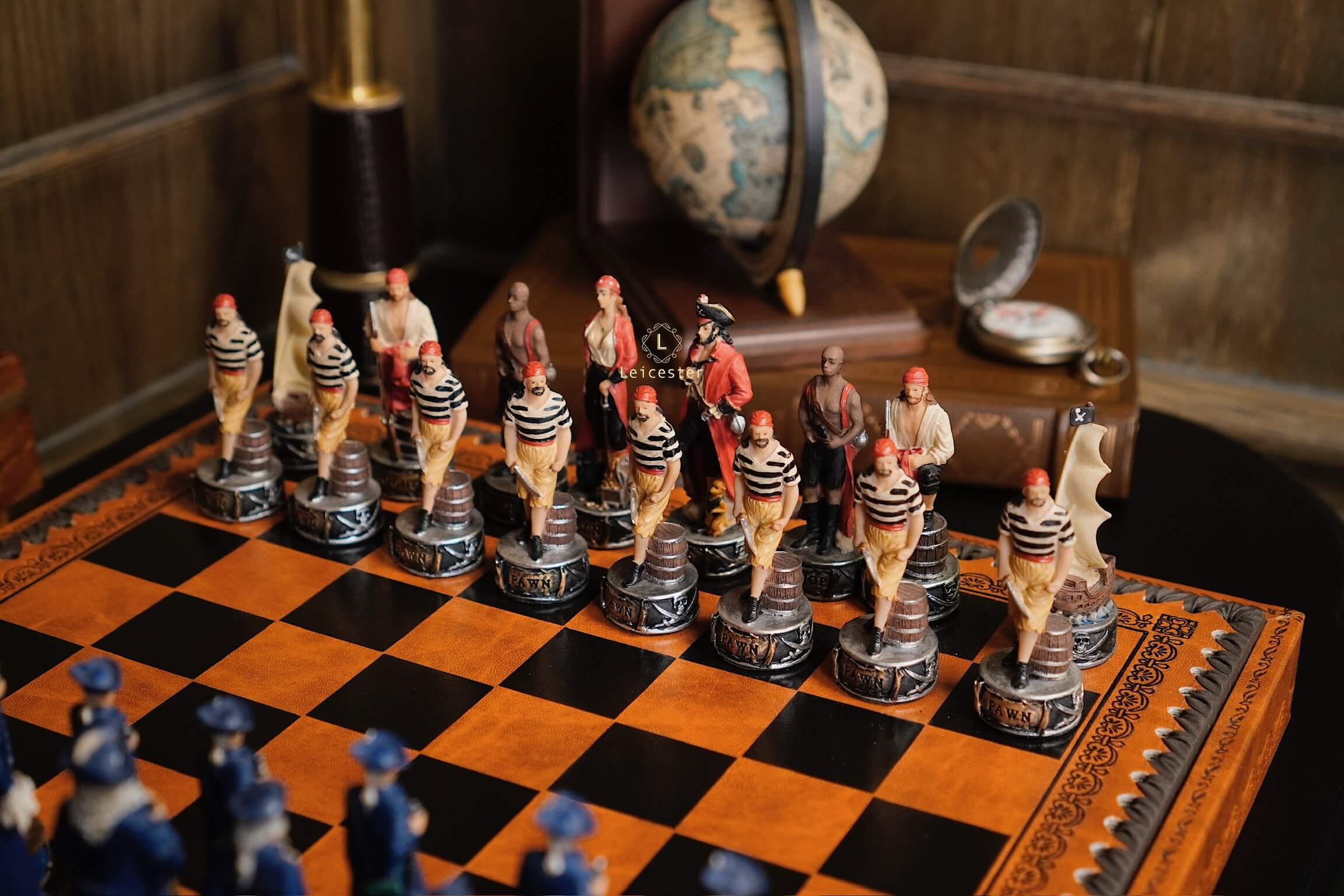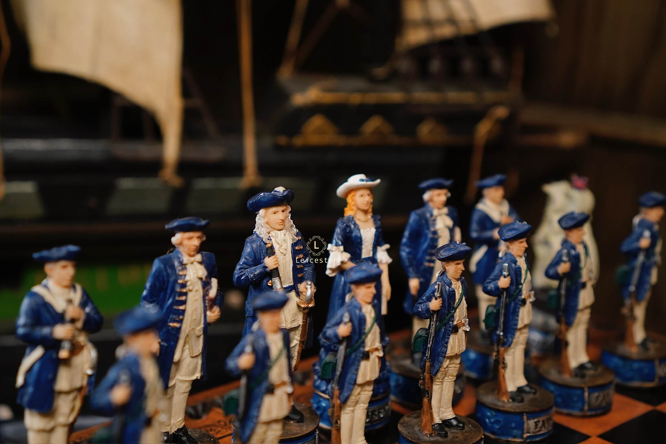 Bộ cờ được chế tác tinh xảo với chất liệu polyresin cao cấp, bàn cờ viền gỗ nâu đỏ sang trọng, mặt phối tông đen cam cùng các chi tiết được sơn thủ công để tạo hiệu ứng cổ điển. Phe Hải quân khoác áo xanh lam đậm, mang dáng đứng kỷ luật và ánh mắt quyết đoán. Phe Hải tặc nổi bật với khăn quấn đỏ, toát lên vẻ liều lĩnh của những kẻ làm chủ bão tố. Mỗi quân cờ như mang trong mình một câu chuyện, một khoảnh khắc của bản hùng ca giữa trật tự và hỗn loạn trên đại dương.