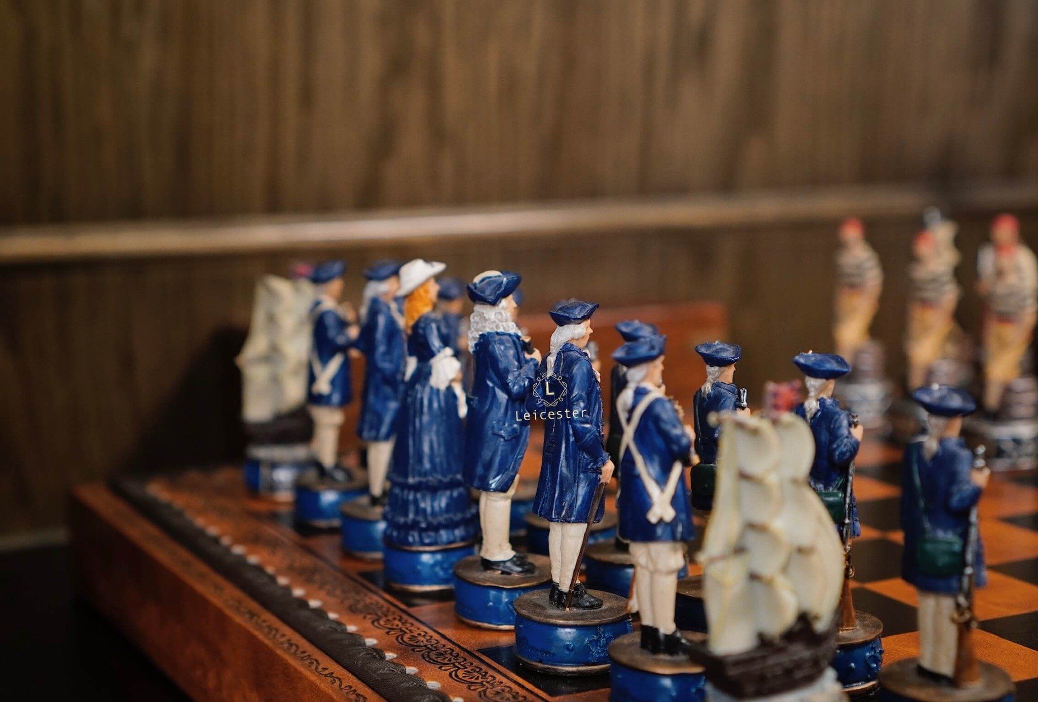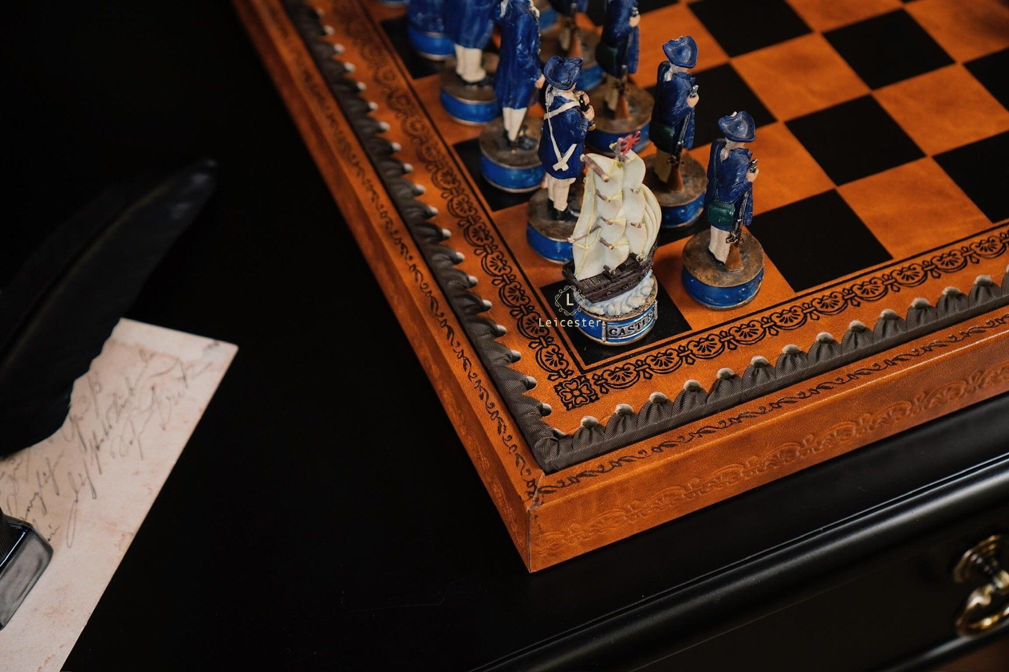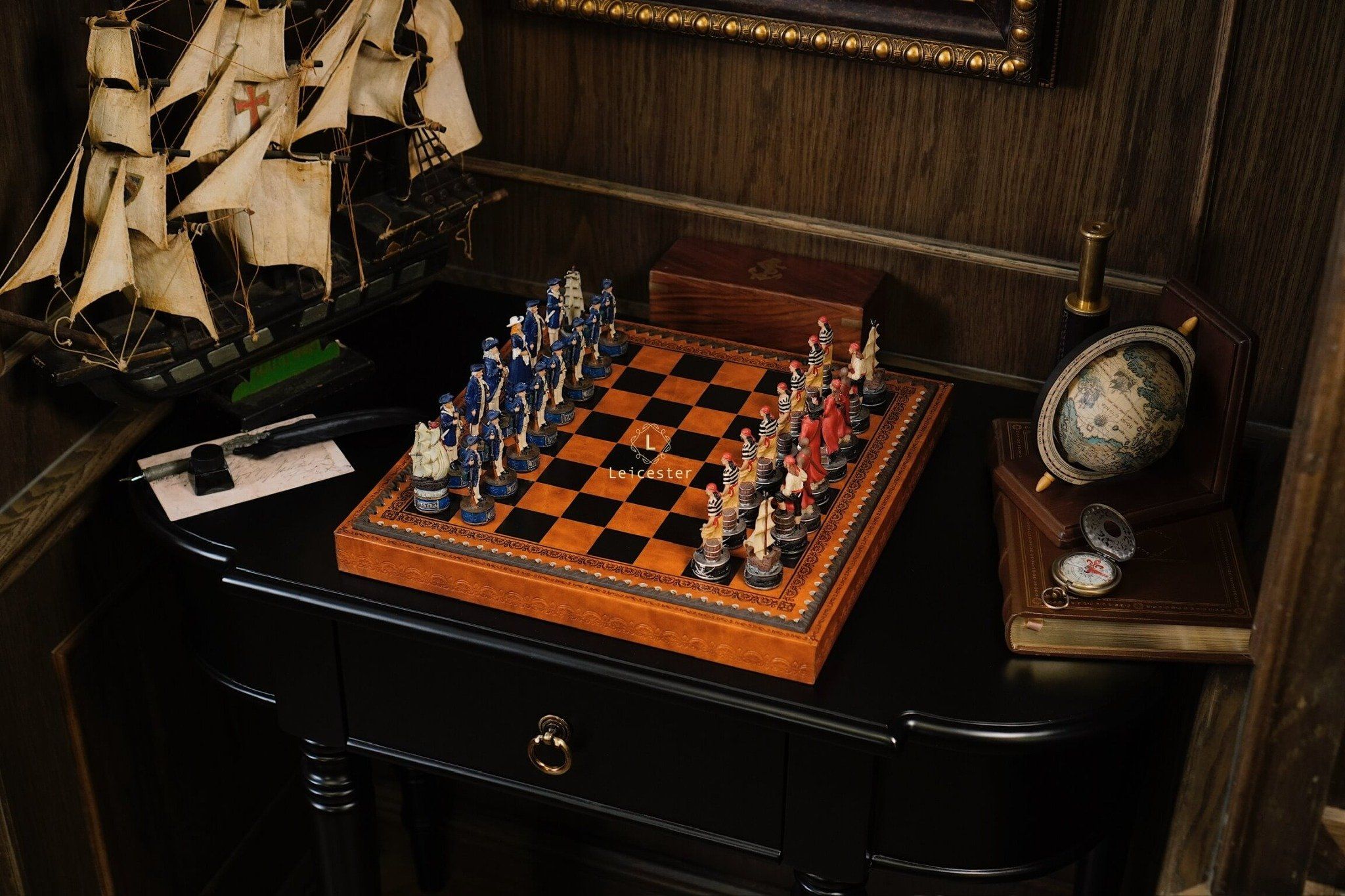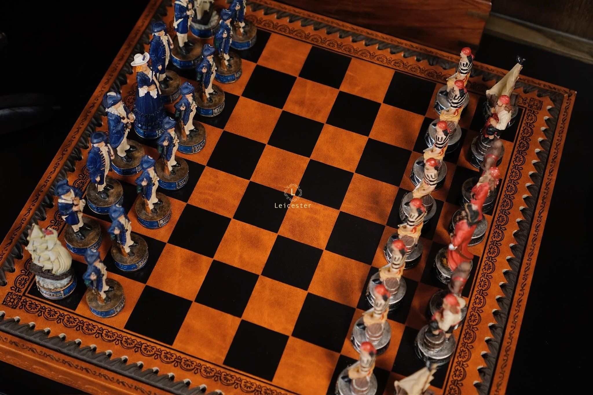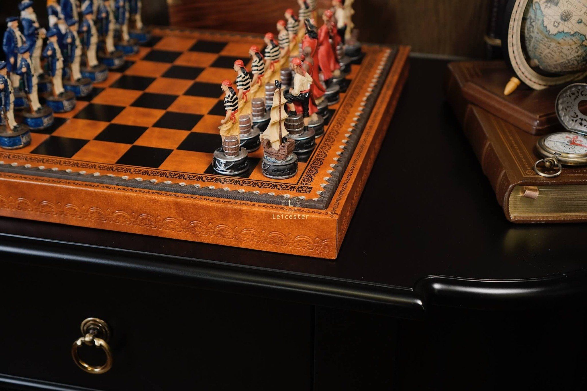 Bộ cờ được chế tác tinh xảo với chất liệu polyresin cao cấp, bàn cờ viền gỗ nâu đỏ sang trọng, mặt phối tông đen cam cùng các chi tiết được sơn thủ công để tạo hiệu ứng cổ điển. Phe Hải quân khoác áo xanh lam đậm, mang dáng đứng kỷ luật và ánh mắt quyết đoán. Phe Hải tặc nổi bật với khăn quấn đỏ, toát lên vẻ liều lĩnh của những kẻ làm chủ bão tố. Mỗi quân cờ như mang trong mình một câu chuyện, một khoảnh khắc của bản hùng ca giữa trật tự và hỗn loạn trên đại dương.