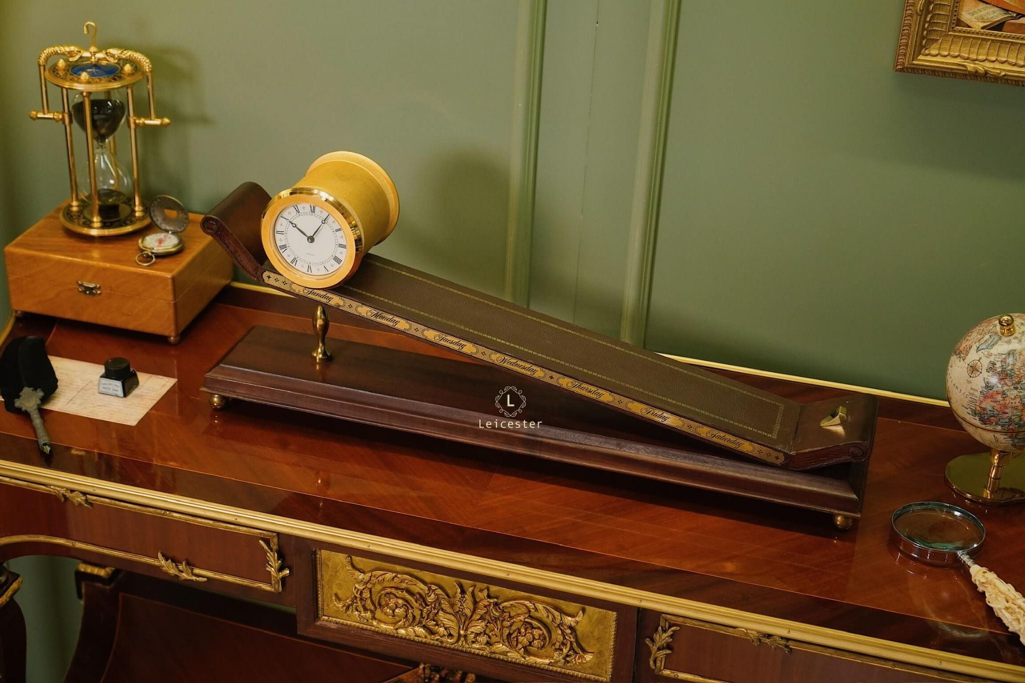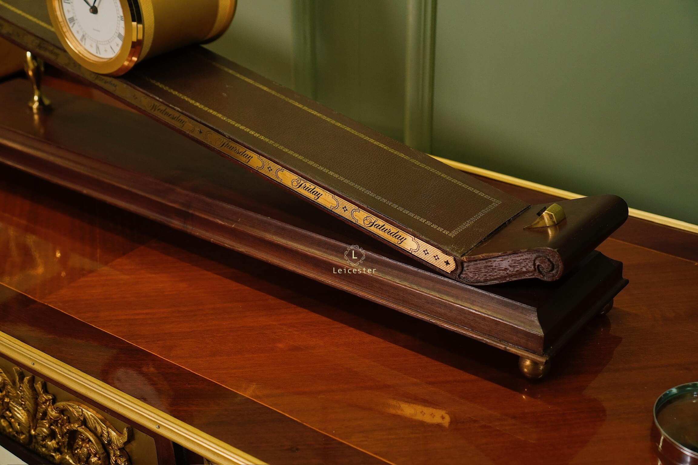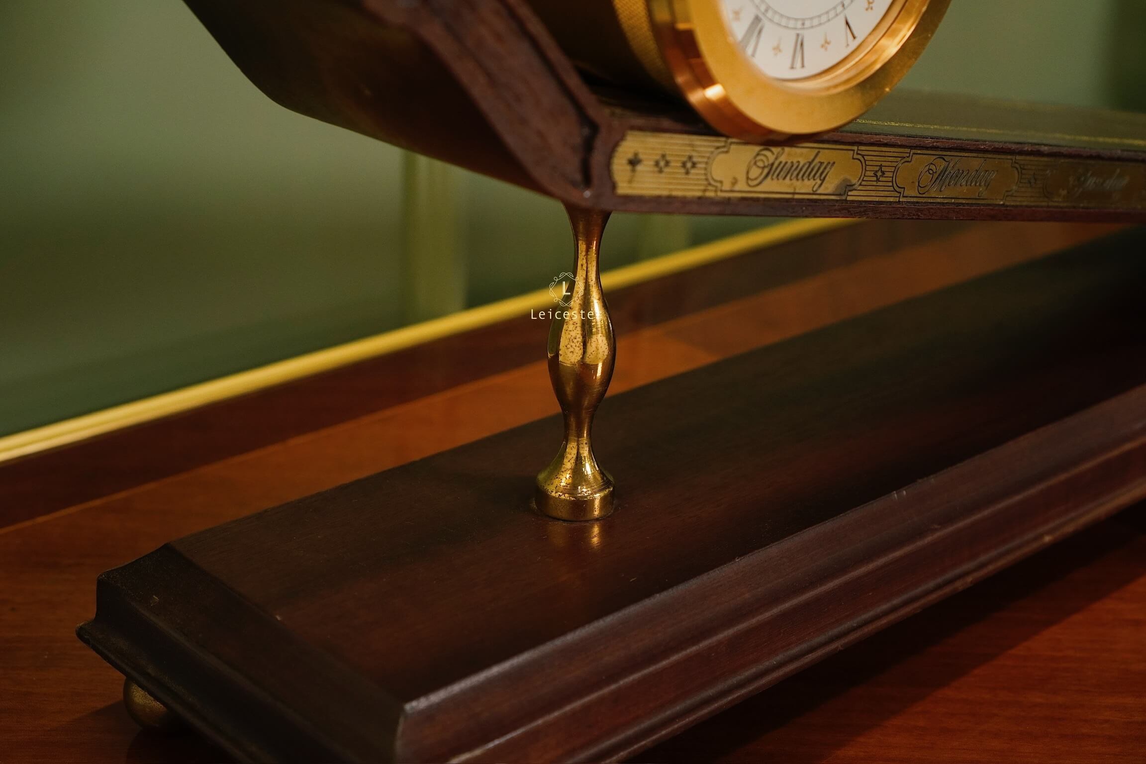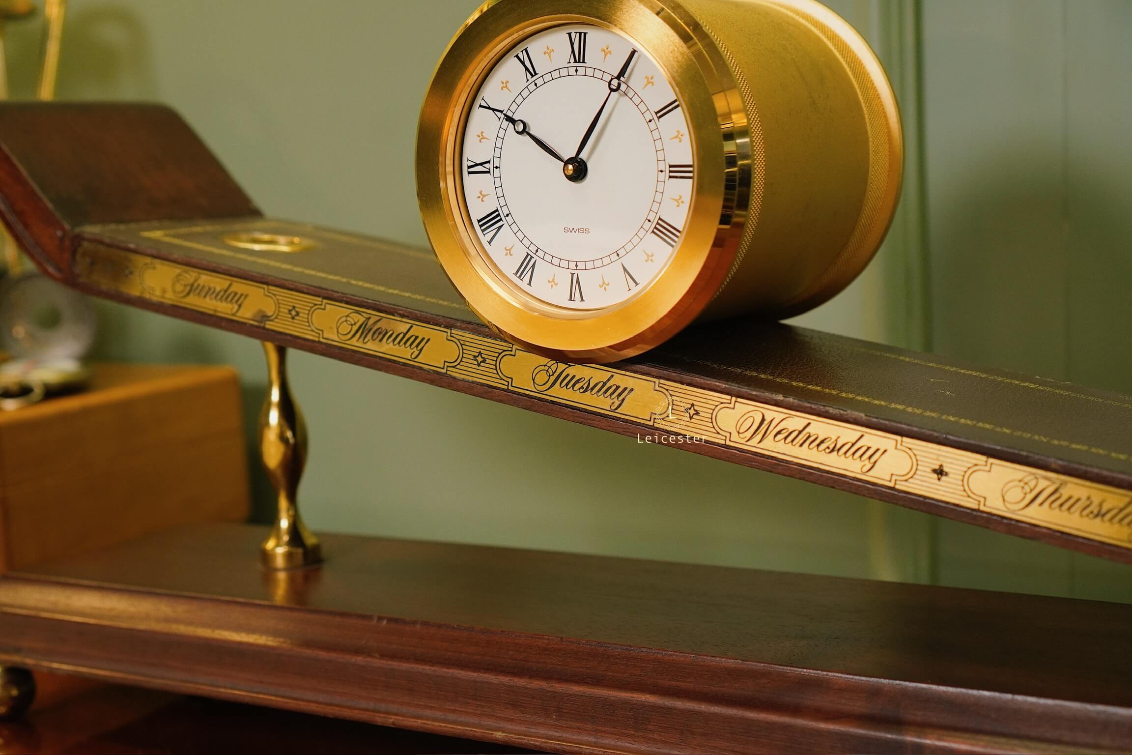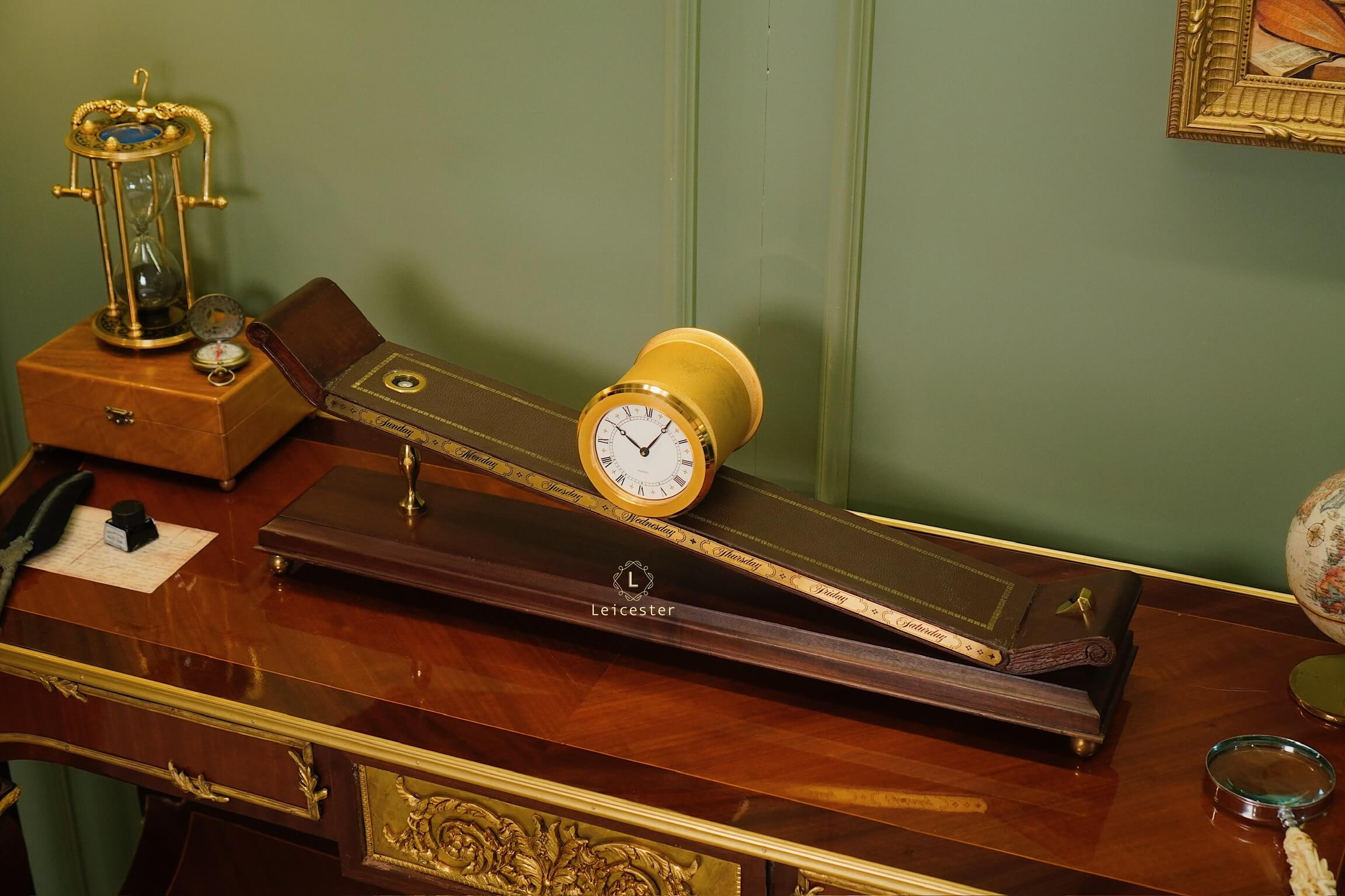 Thiết kế gây ấn tượng với thân gỗ tự nhiên tinh xảo, bề mặt nghiêng phủ da nâu khắc các ngày trong tuần; mặt đồng hồ tròn bằng đồng thau mạ vàng sang trọng, hiển thị số La Mã cổ điển. Toàn bộ khối đồng hồ như đang “trượt” trên mặt phẳng nghiêng, gợi hình ảnh dòng chảy thời gian.