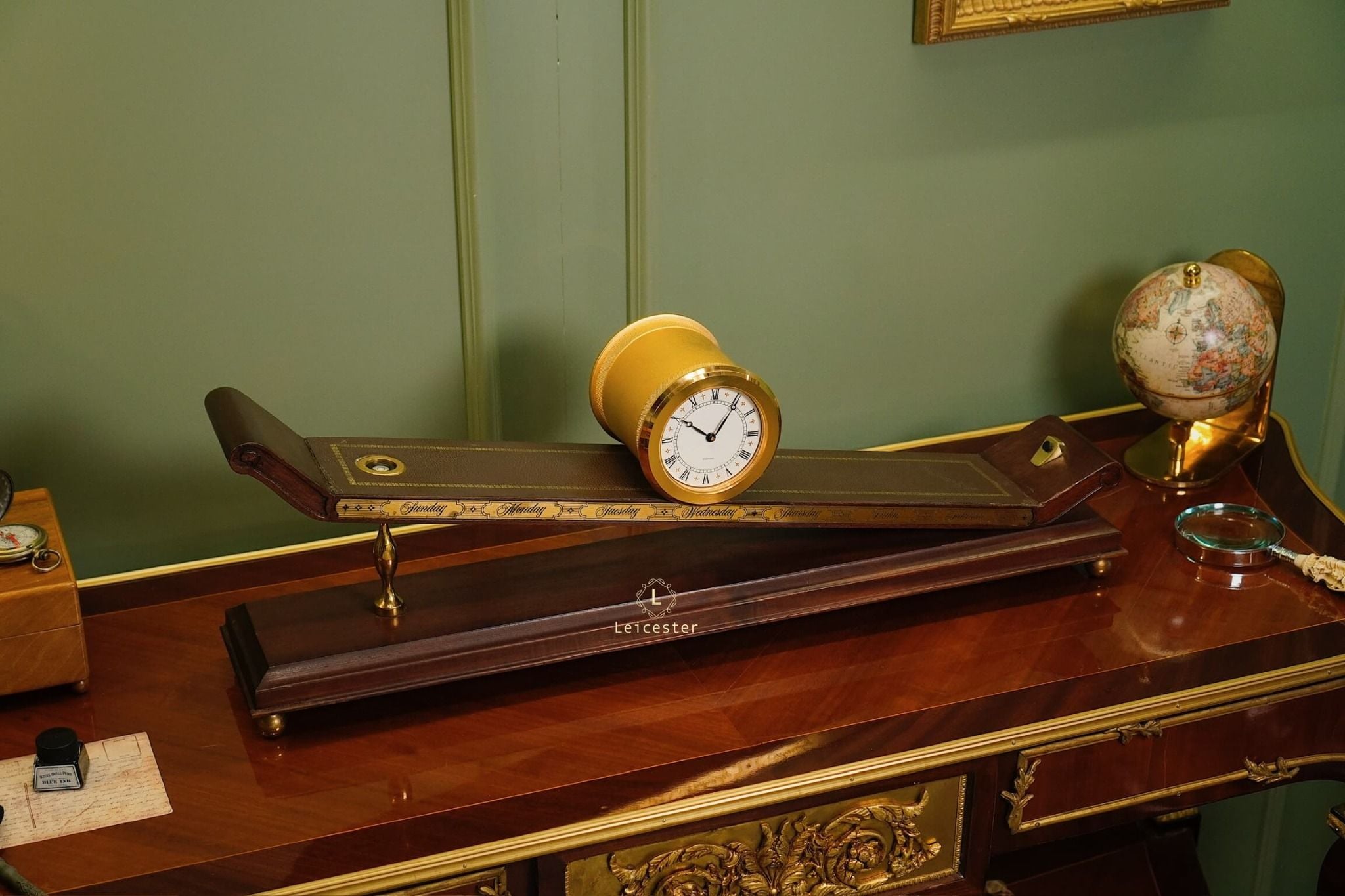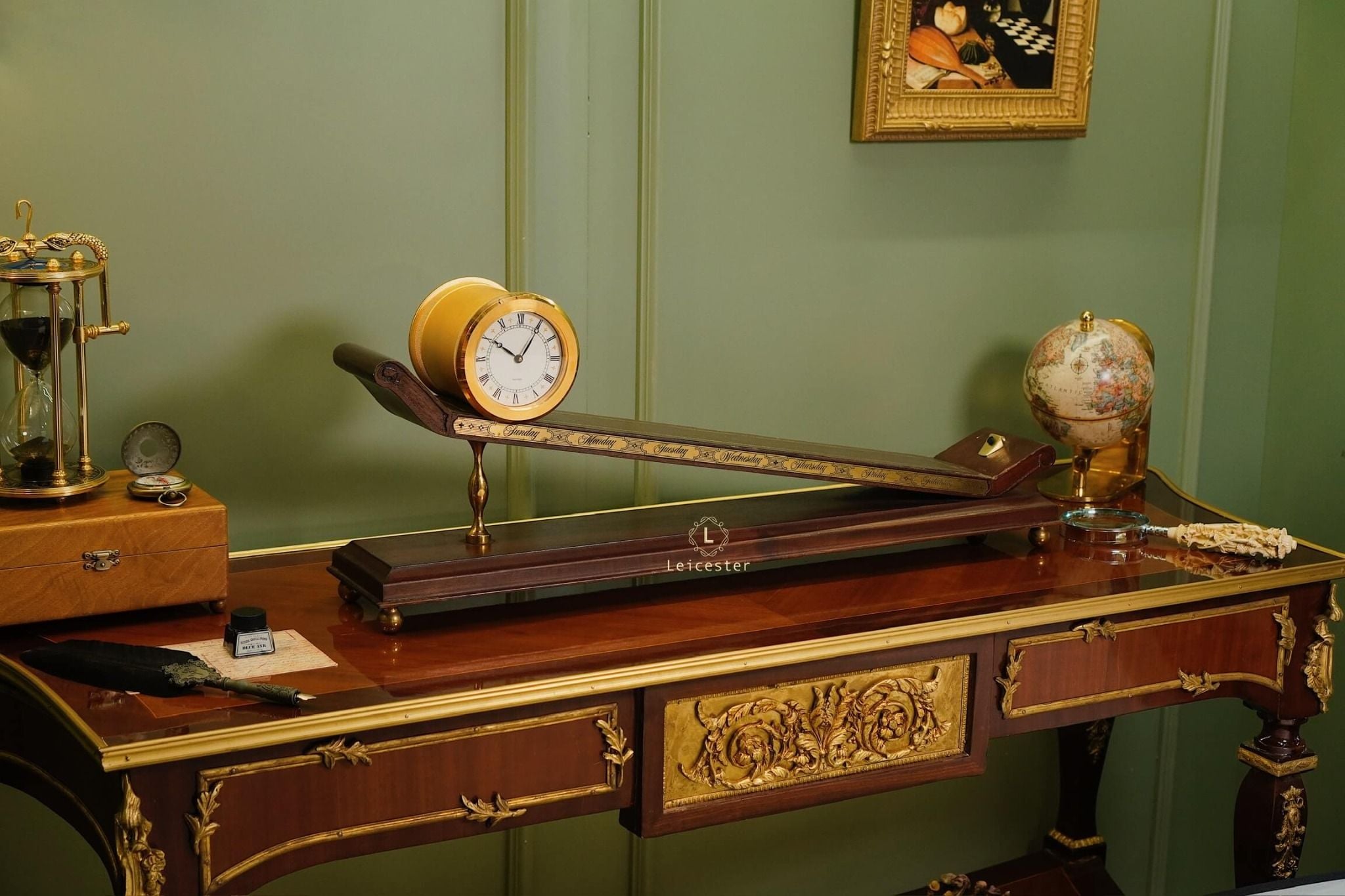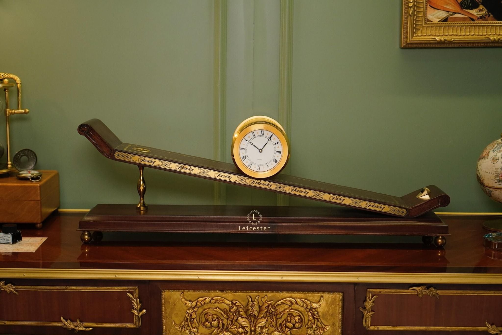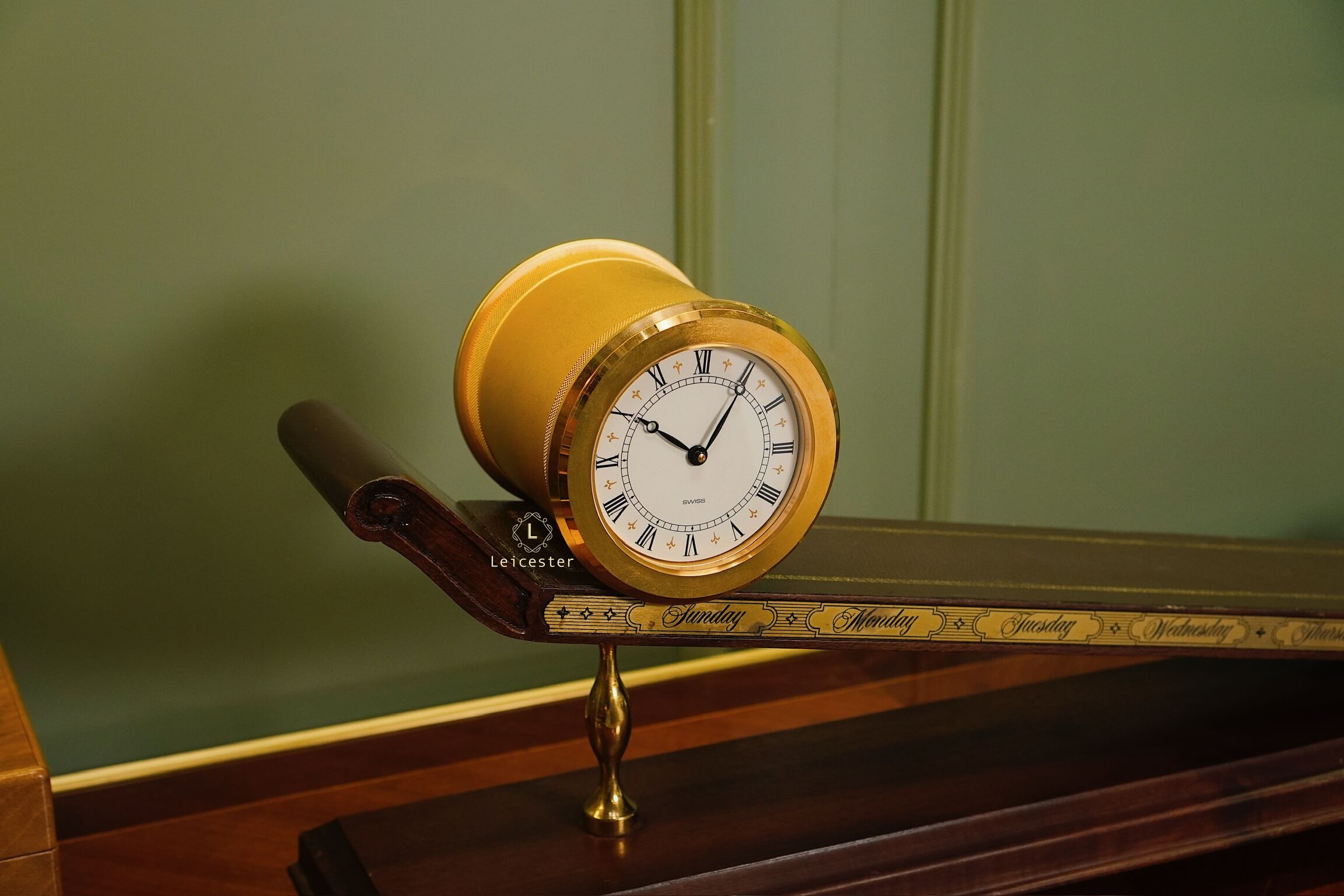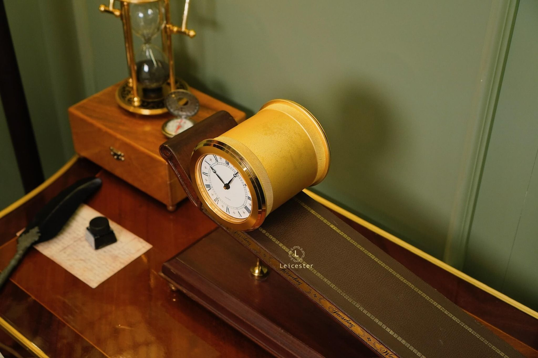 Thiết kế gây ấn tượng với thân gỗ tự nhiên tinh xảo, bề mặt nghiêng phủ da nâu khắc các ngày trong tuần; mặt đồng hồ tròn bằng đồng thau mạ vàng sang trọng, hiển thị số La Mã cổ điển. Toàn bộ khối đồng hồ như đang “trượt” trên mặt phẳng nghiêng, gợi hình ảnh dòng chảy thời gian.