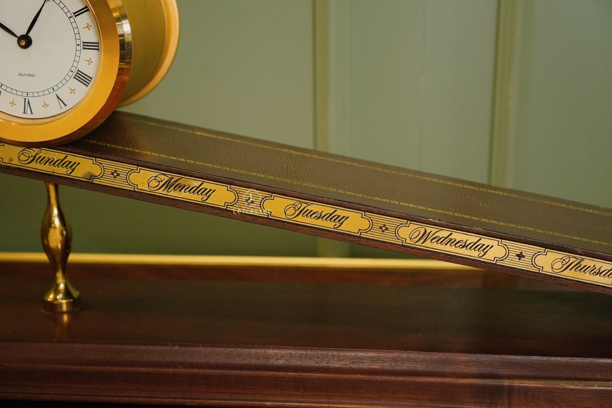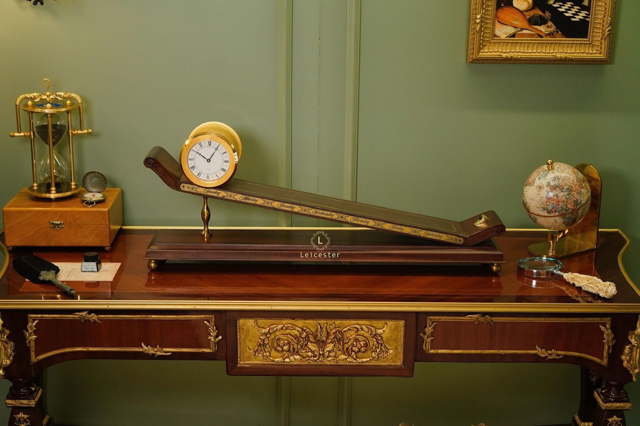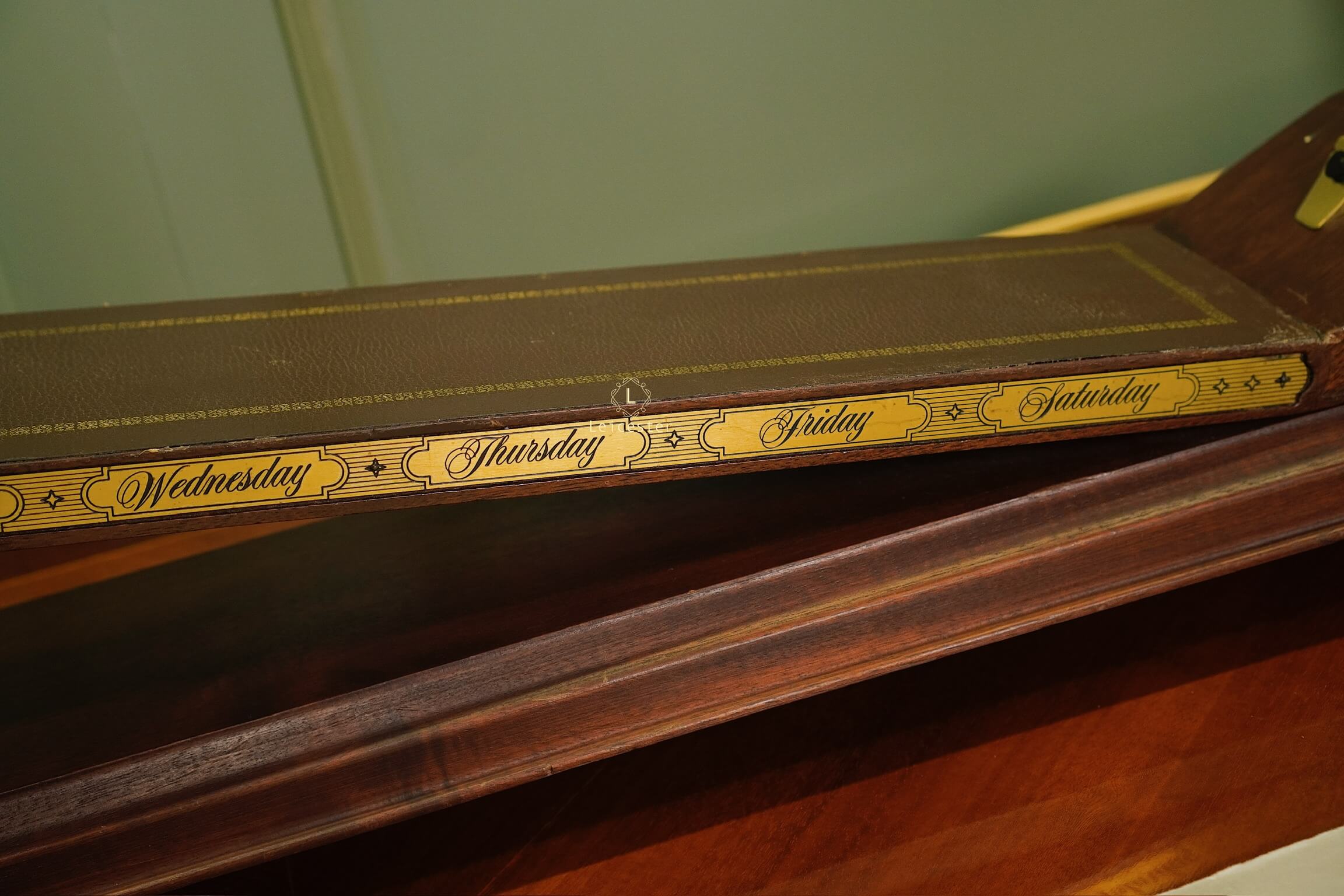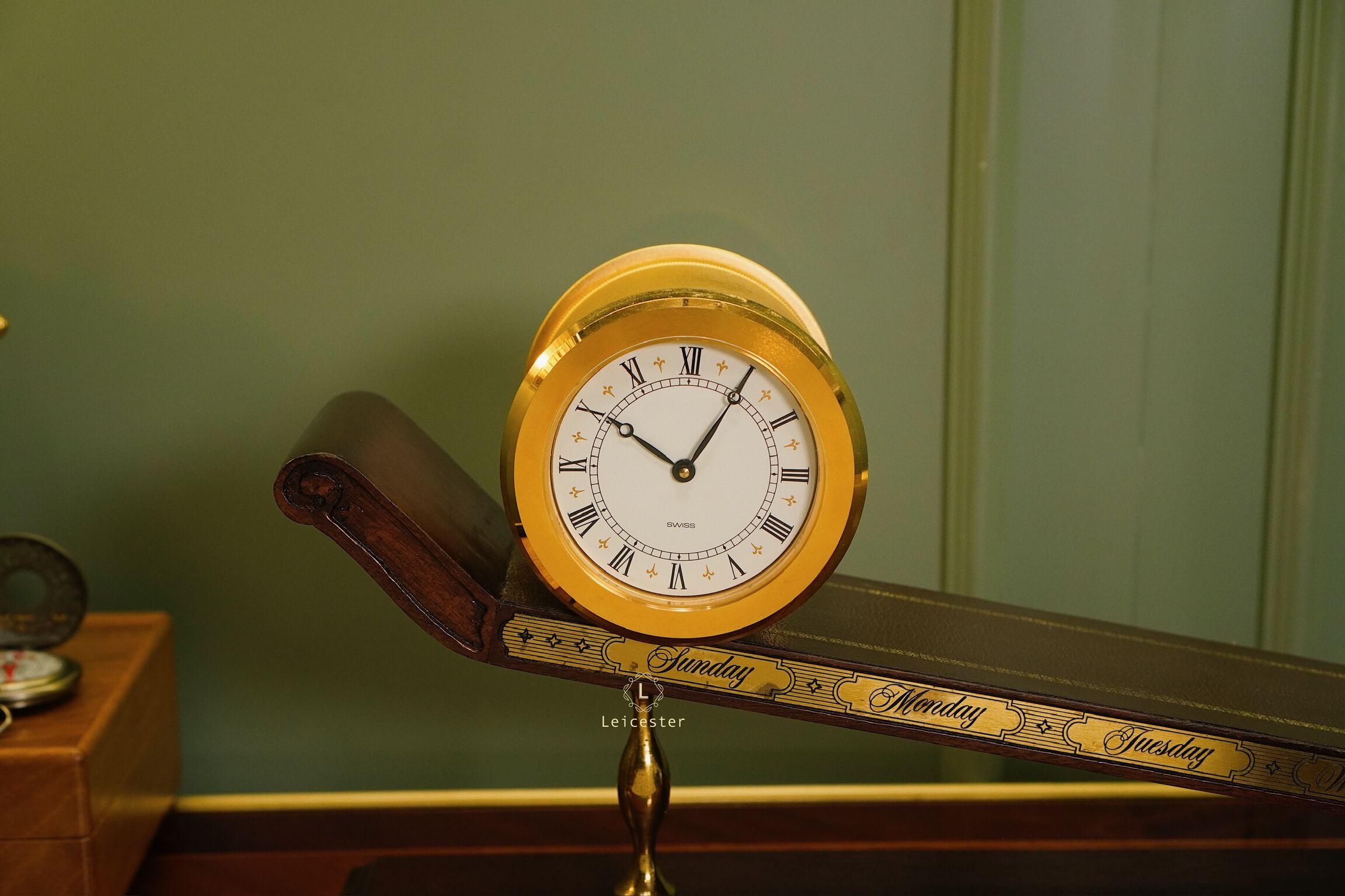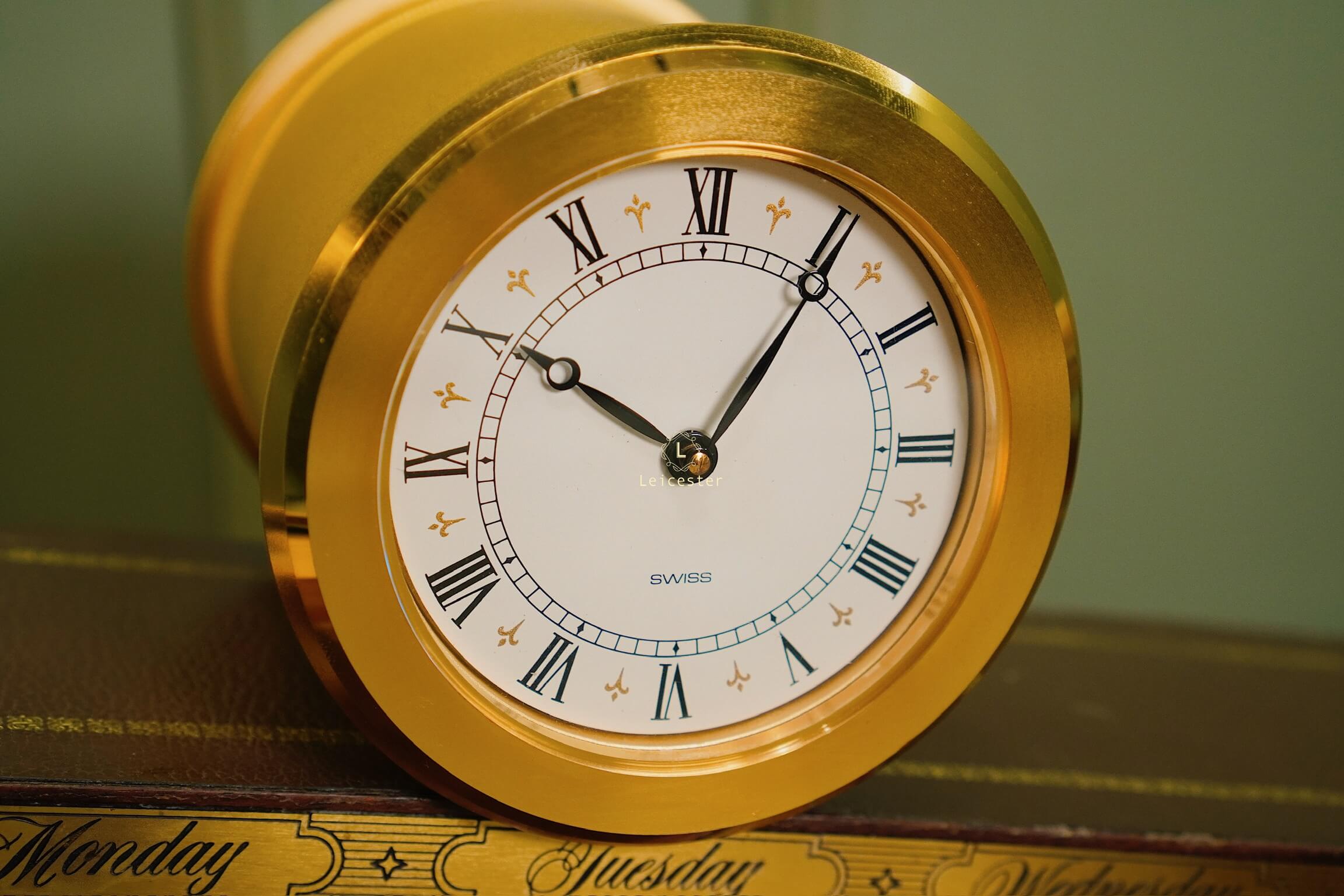 Thiết kế gây ấn tượng với thân gỗ tự nhiên tinh xảo, bề mặt nghiêng phủ da nâu khắc các ngày trong tuần; mặt đồng hồ tròn bằng đồng thau mạ vàng sang trọng, hiển thị số La Mã cổ điển. Toàn bộ khối đồng hồ như đang “trượt” trên mặt phẳng nghiêng, gợi hình ảnh dòng chảy thời gian.