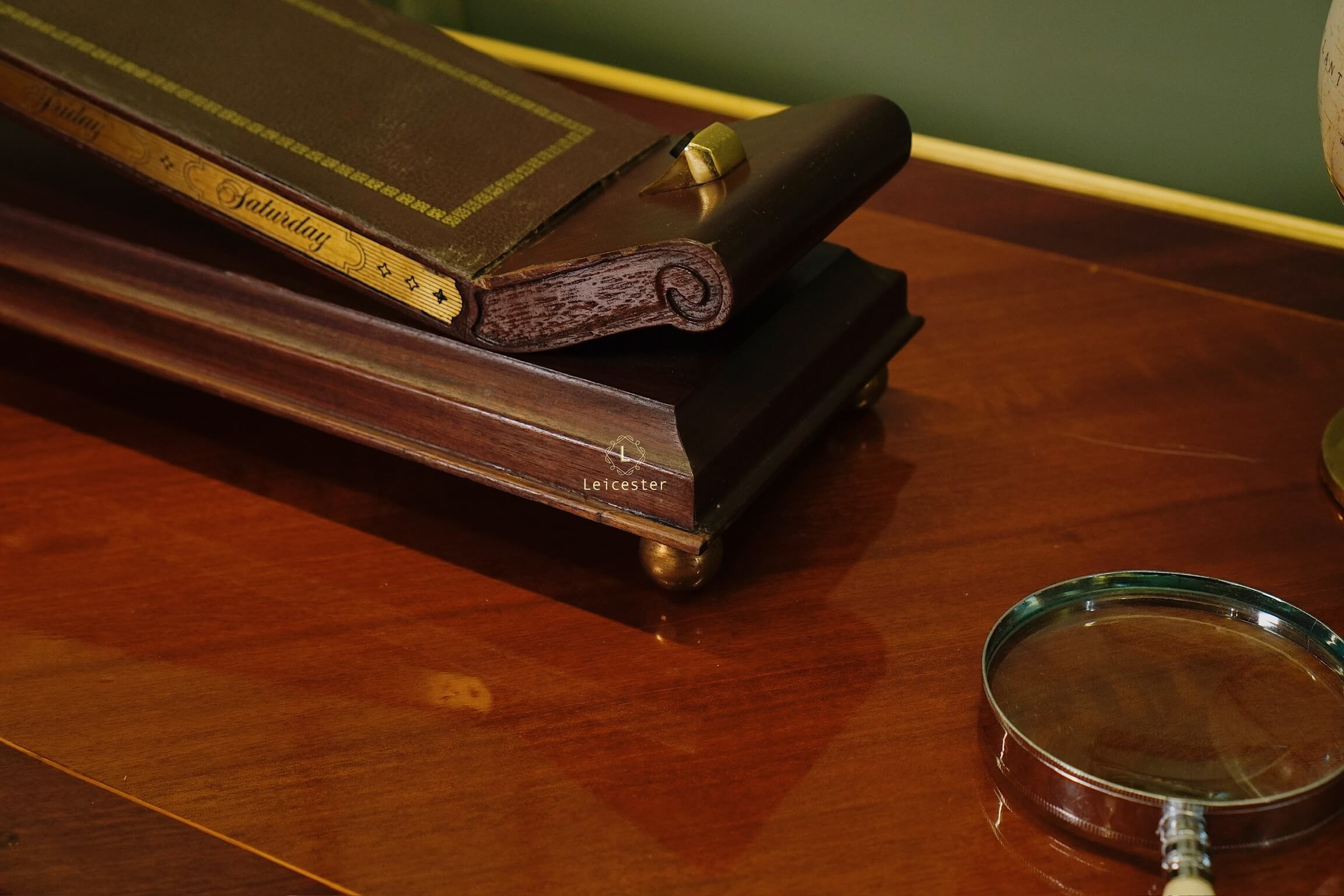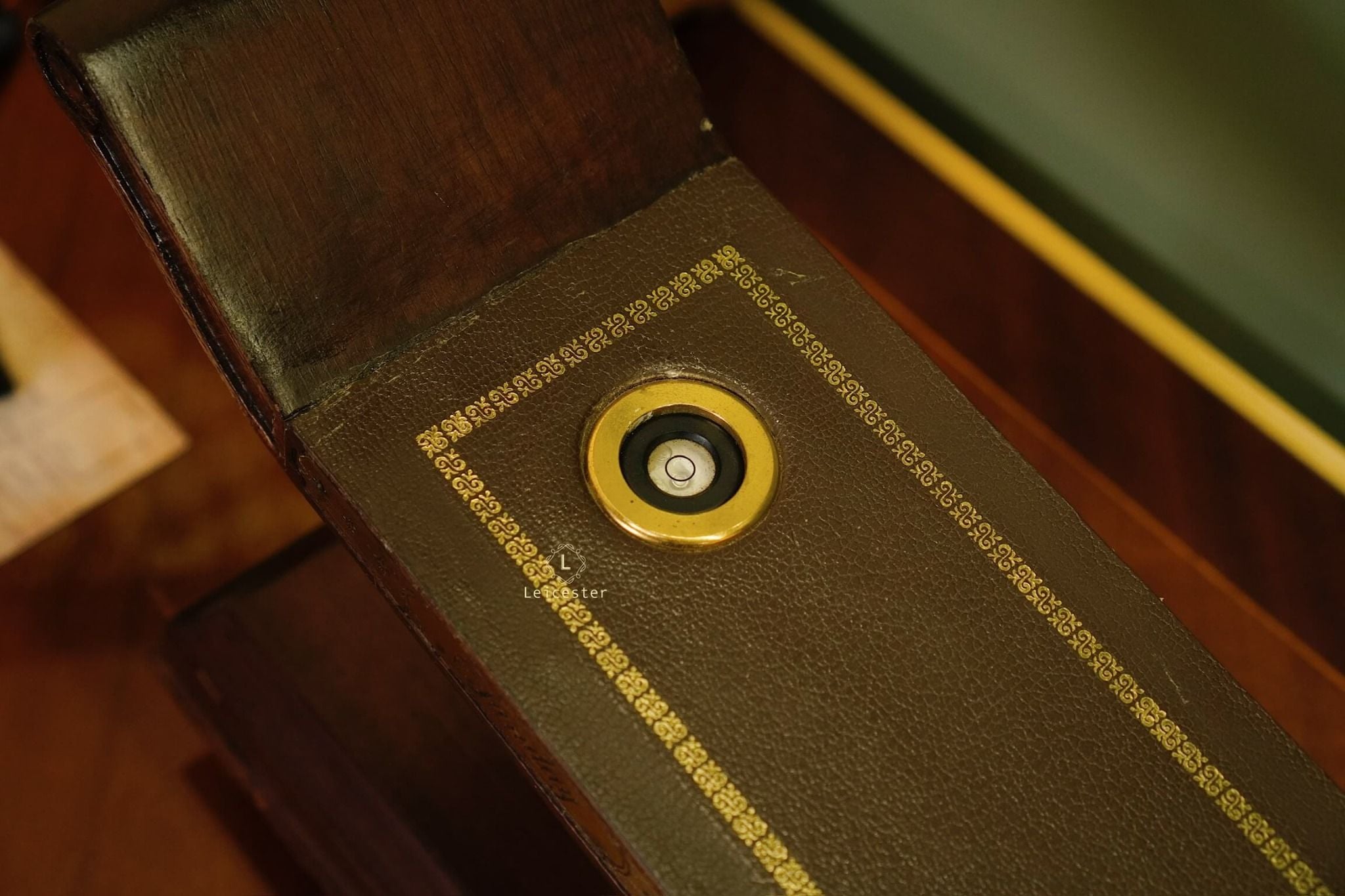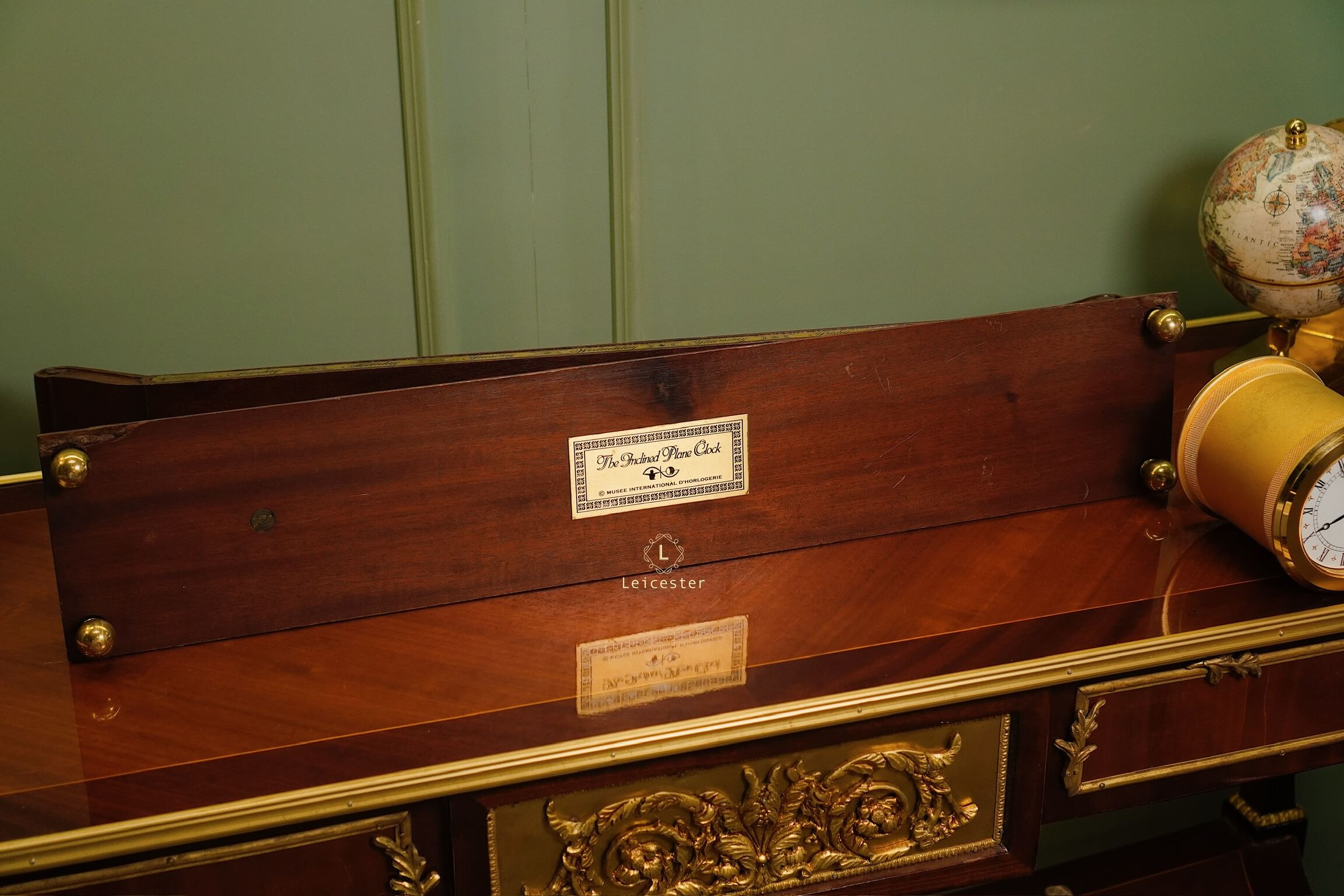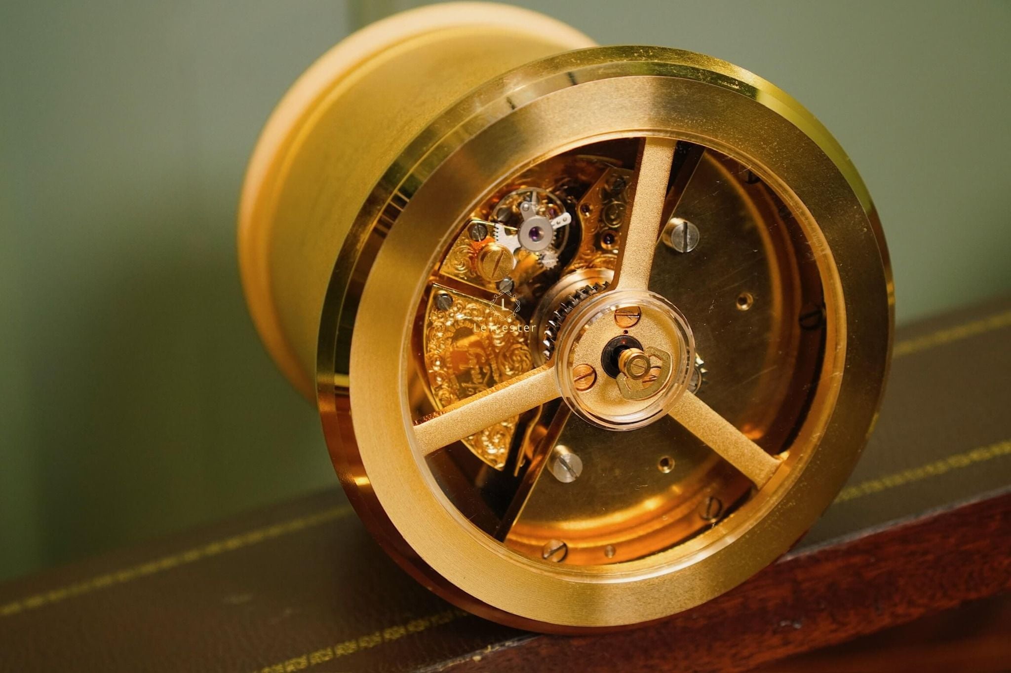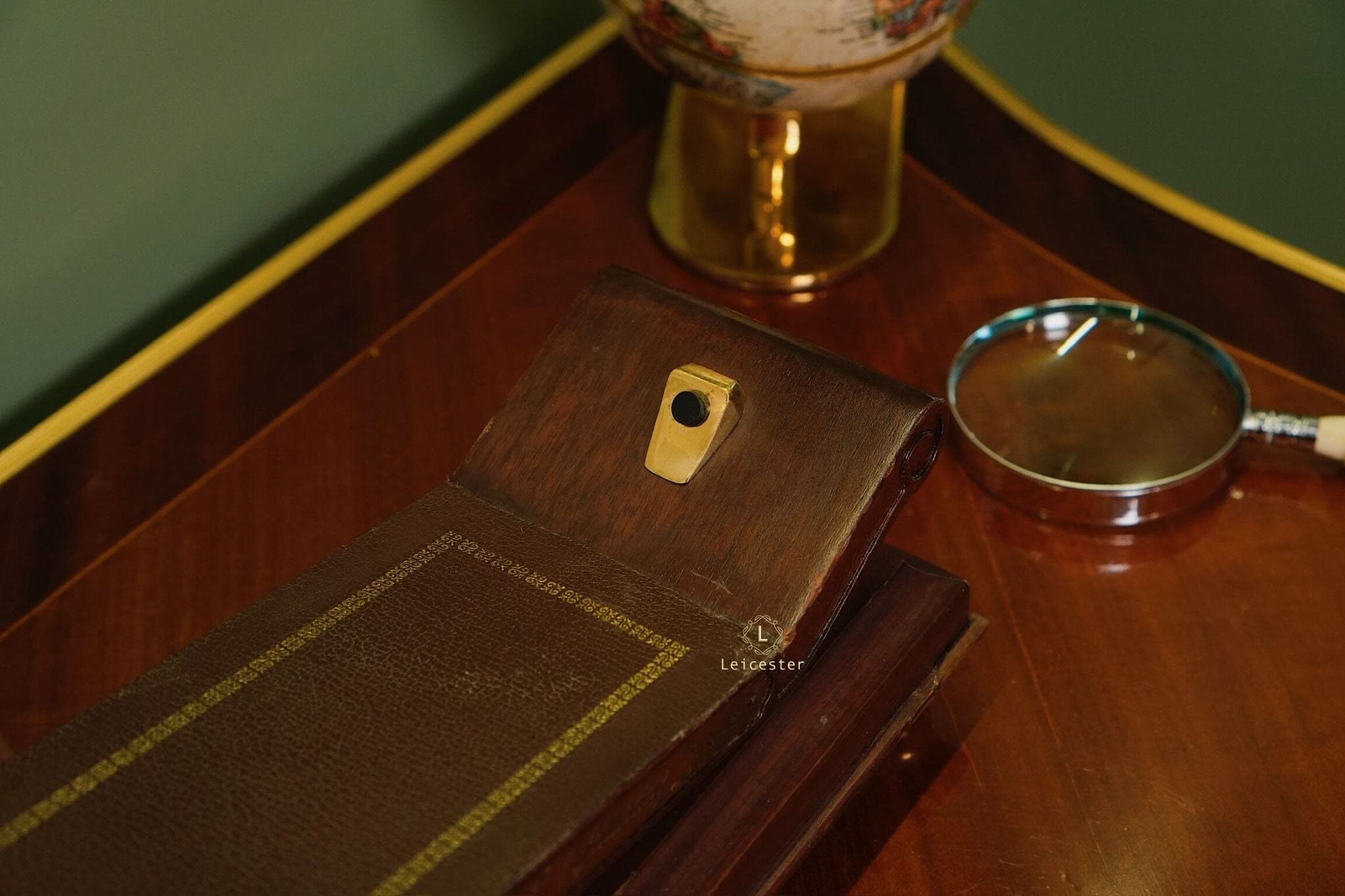 Chất liệu: Đồng mạ vàng, gỗ và da