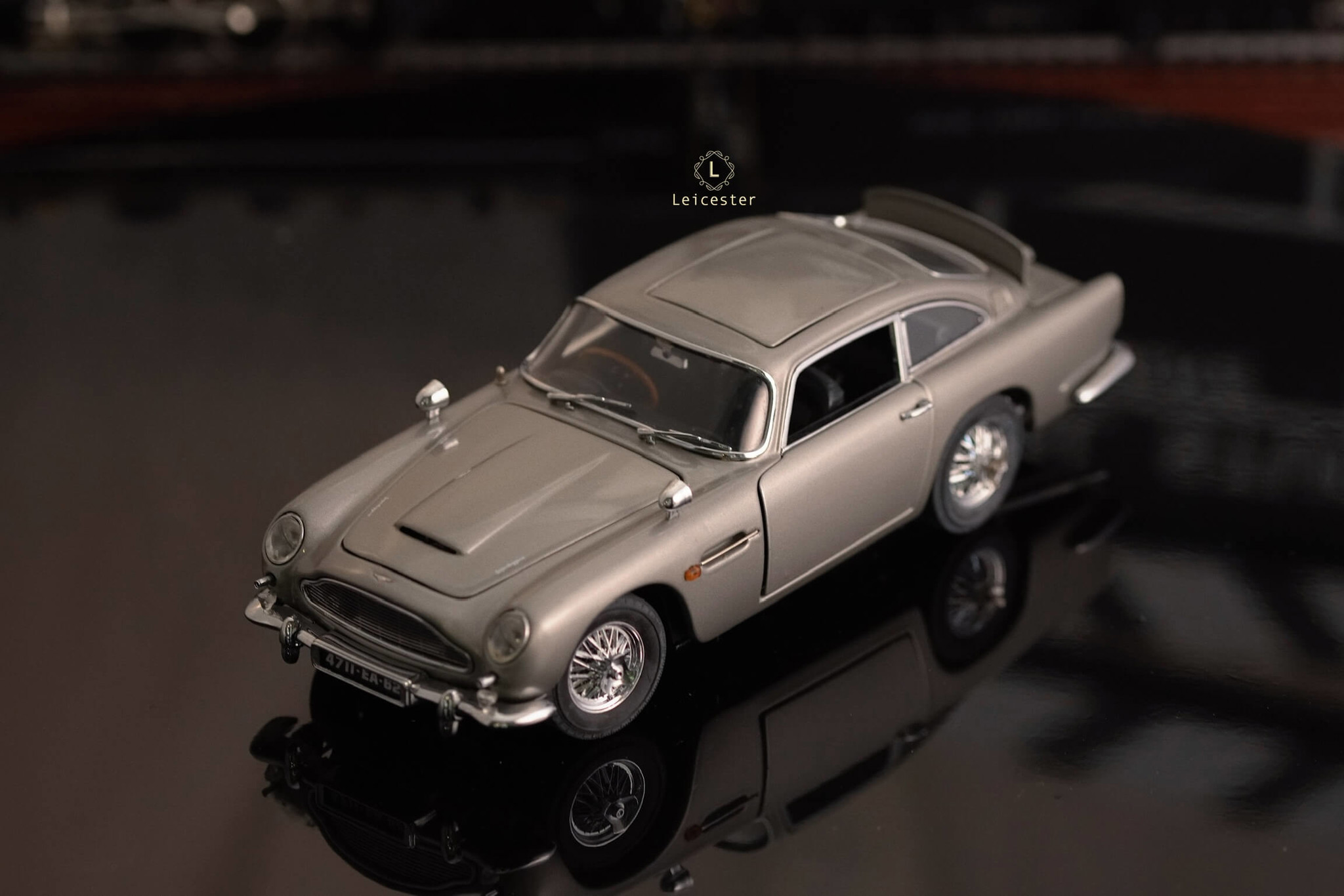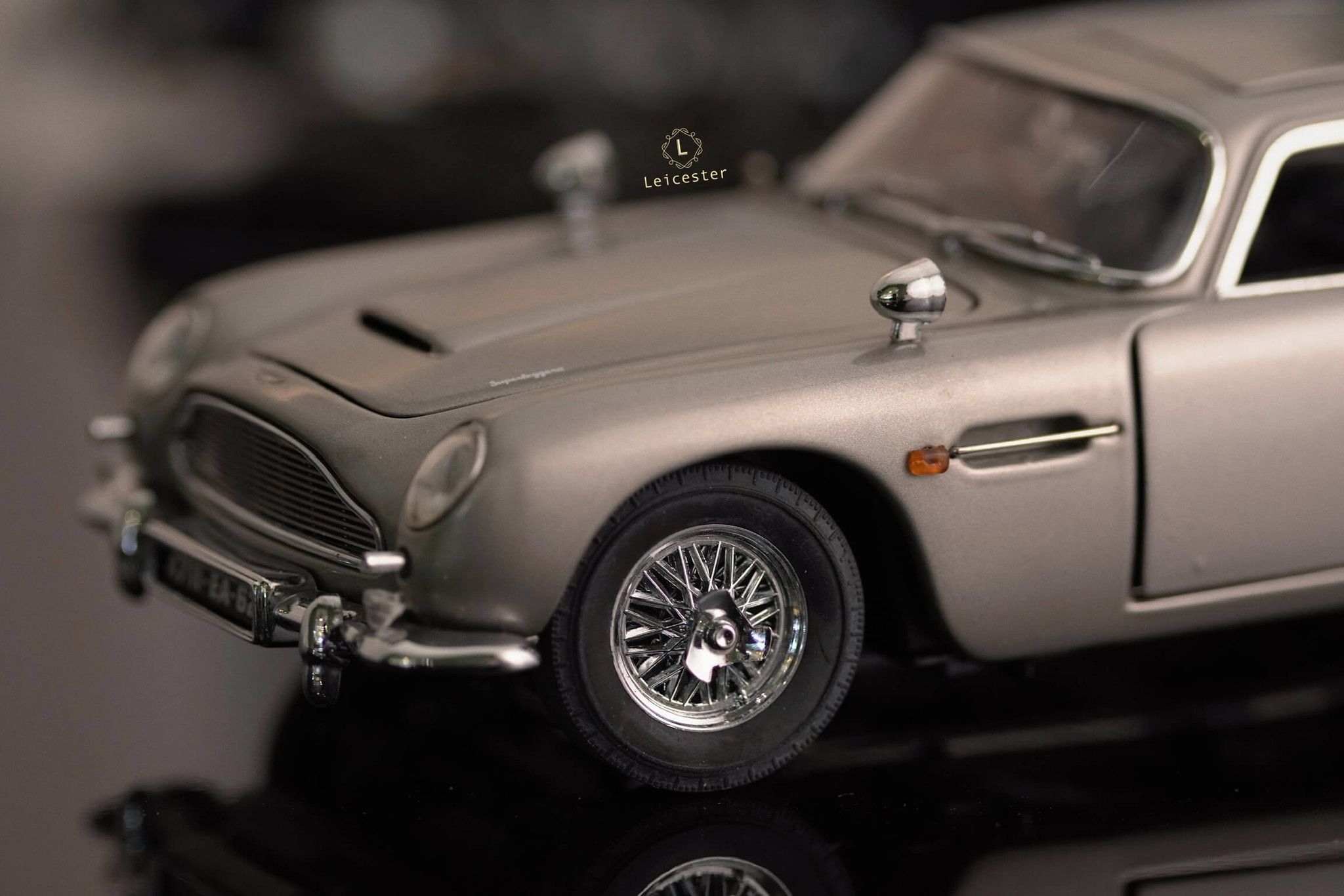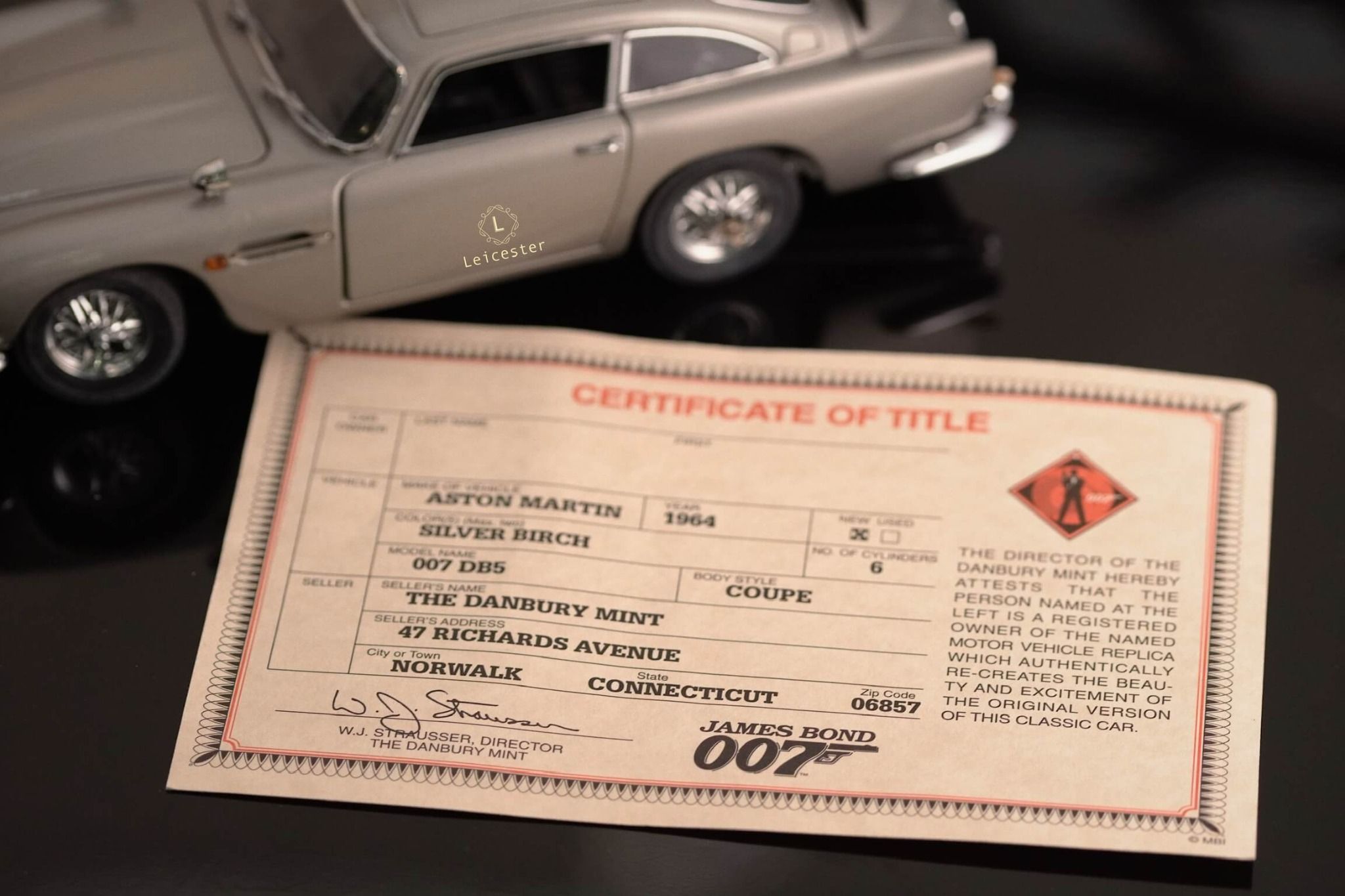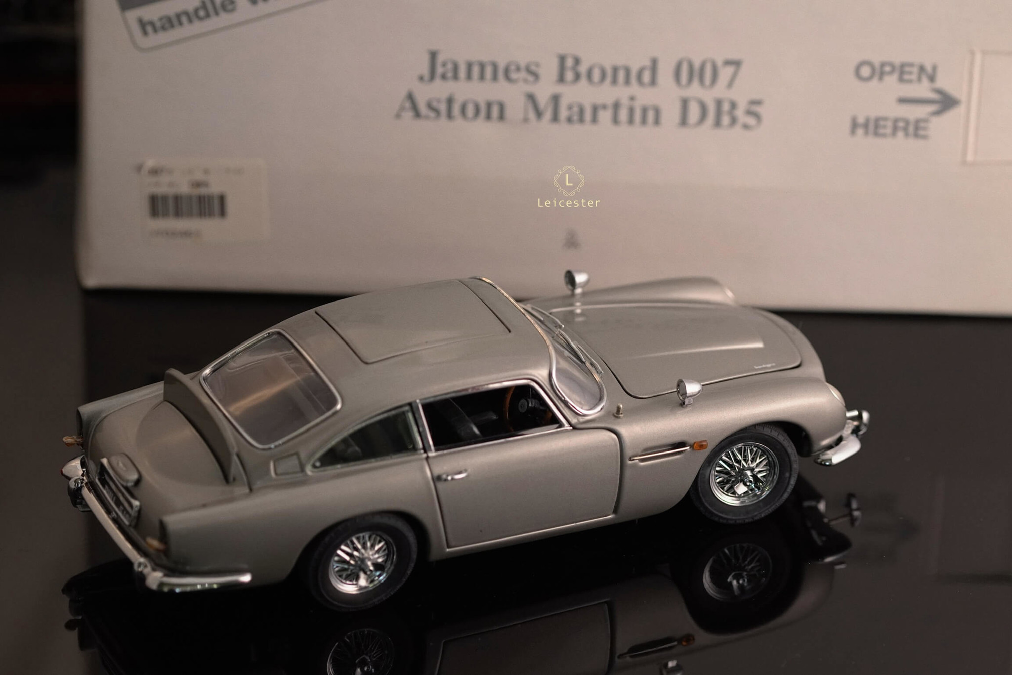 Chiếc xe Aston Martin DB5 màu Silver Birch với những tiện ích phức tạp như: biển số xe xoay, thiết bị cắt lốp xe được trang bị tại bánh xe, súng máy ẩn trong đèn xe trước, nơi xả dầu và đinh trong đèn xe sau, tấm chắn đạn cho kính sau và thậm chí là cả ghế phóng khẩn cấp cũng được tái tạo lại trong một bản sao tỷ lệ 1:24 được chế tác, lắp ráp và hoàn thiện bằng tay từ hơn 300 thành phần riêng biệt bởi Danbury Mint.