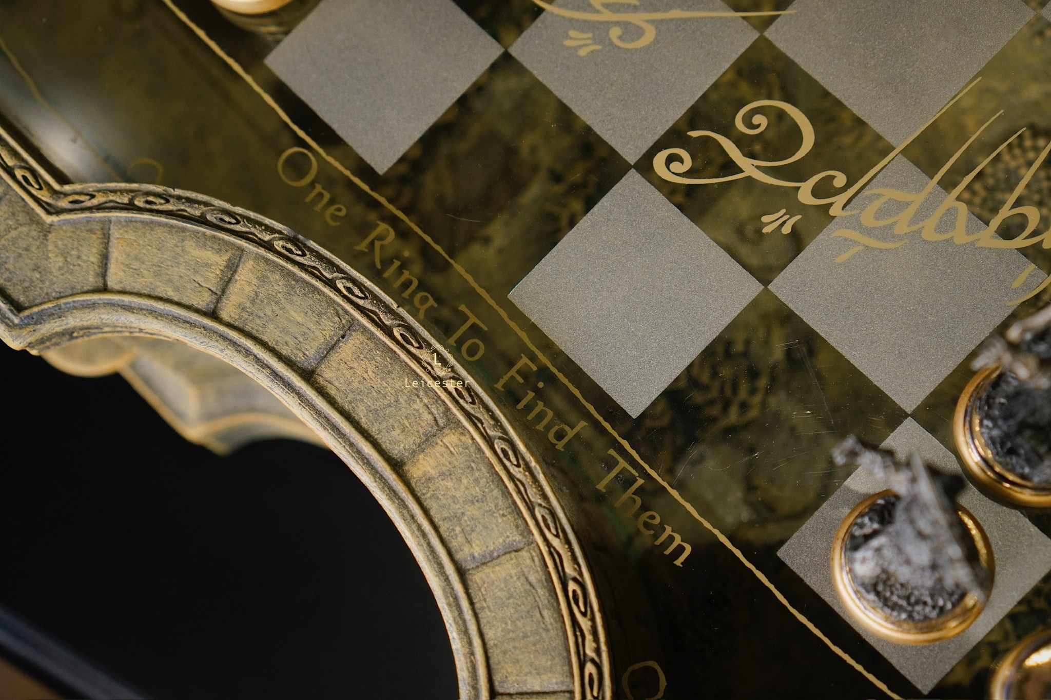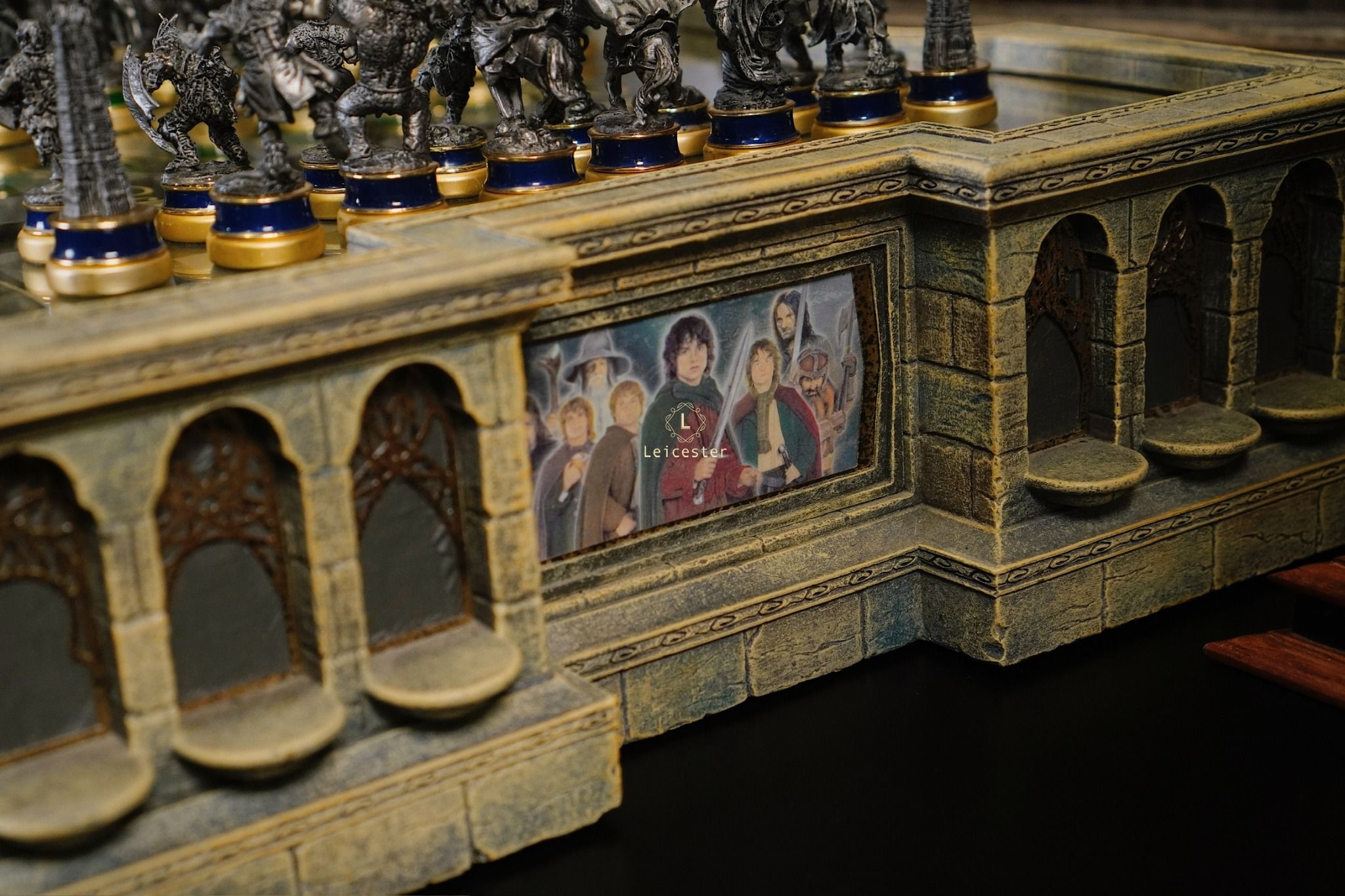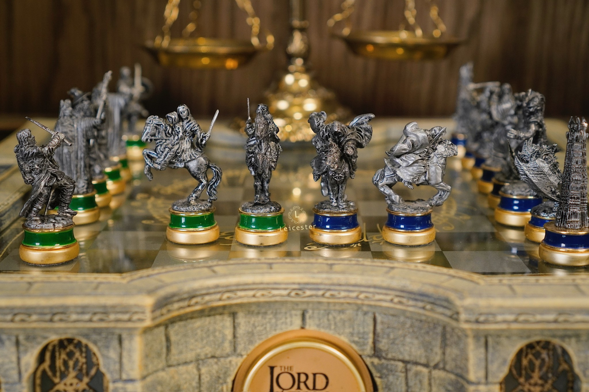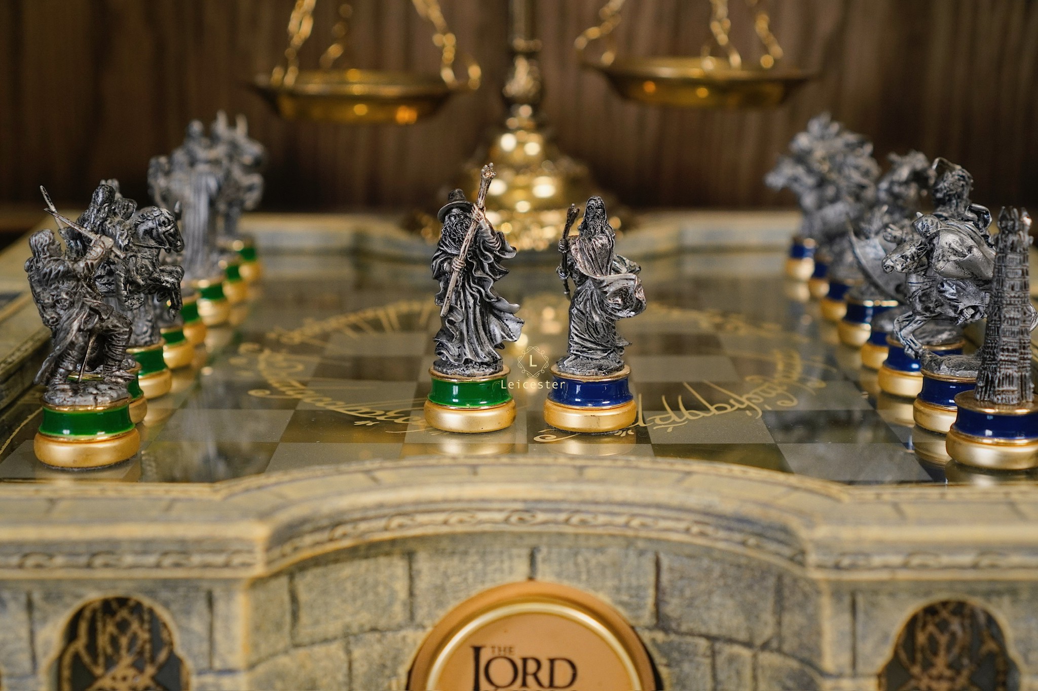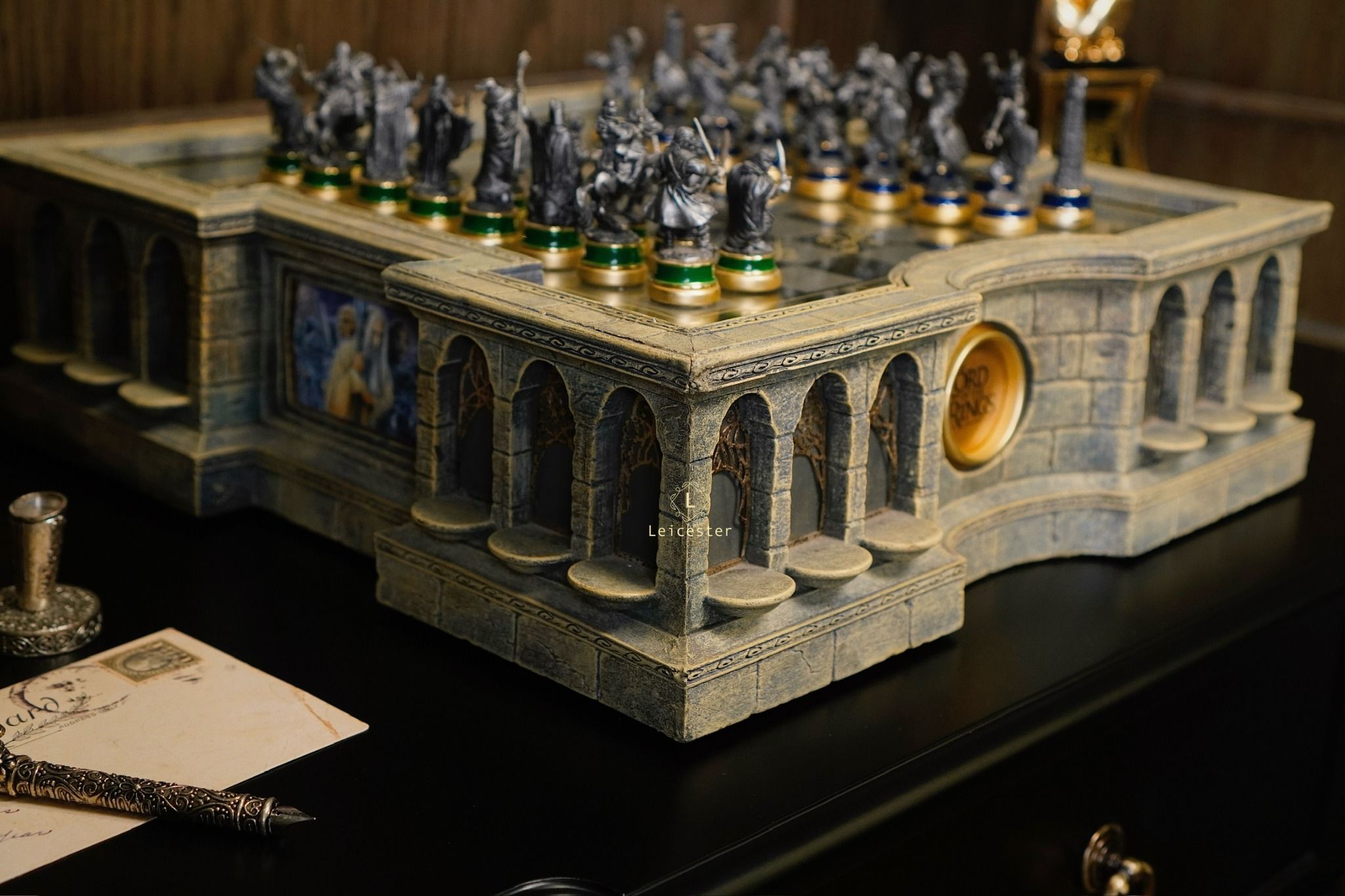 The Lord Of Rings Chess Set là một trong những tác phẩm nghệ thuật ấn tượng nhất mà The Noble Collection từng tạo ra, mọi chi tiết đều chân thực và đúng với bộ phim sử thi từng đoạt giải Oscar. Bên dưới mặt bàn cờ là bản đồ cổ của Middle Earth, bao quanh bàn cờ là nơi đặt những quân cờ có kết cấu trông giống như một nhà thờ lớn, mỗi mặt được đính kèm theo chiếc nhẫn vàng The Lord Of Rings và hình ảnh chân thực của các nhân vật trong phim.