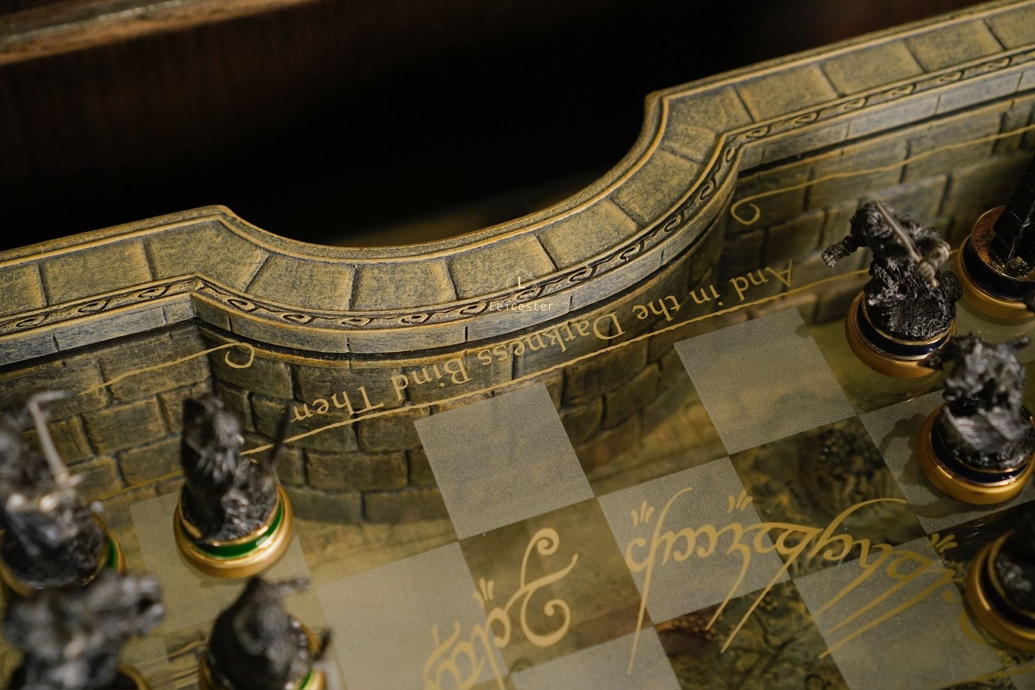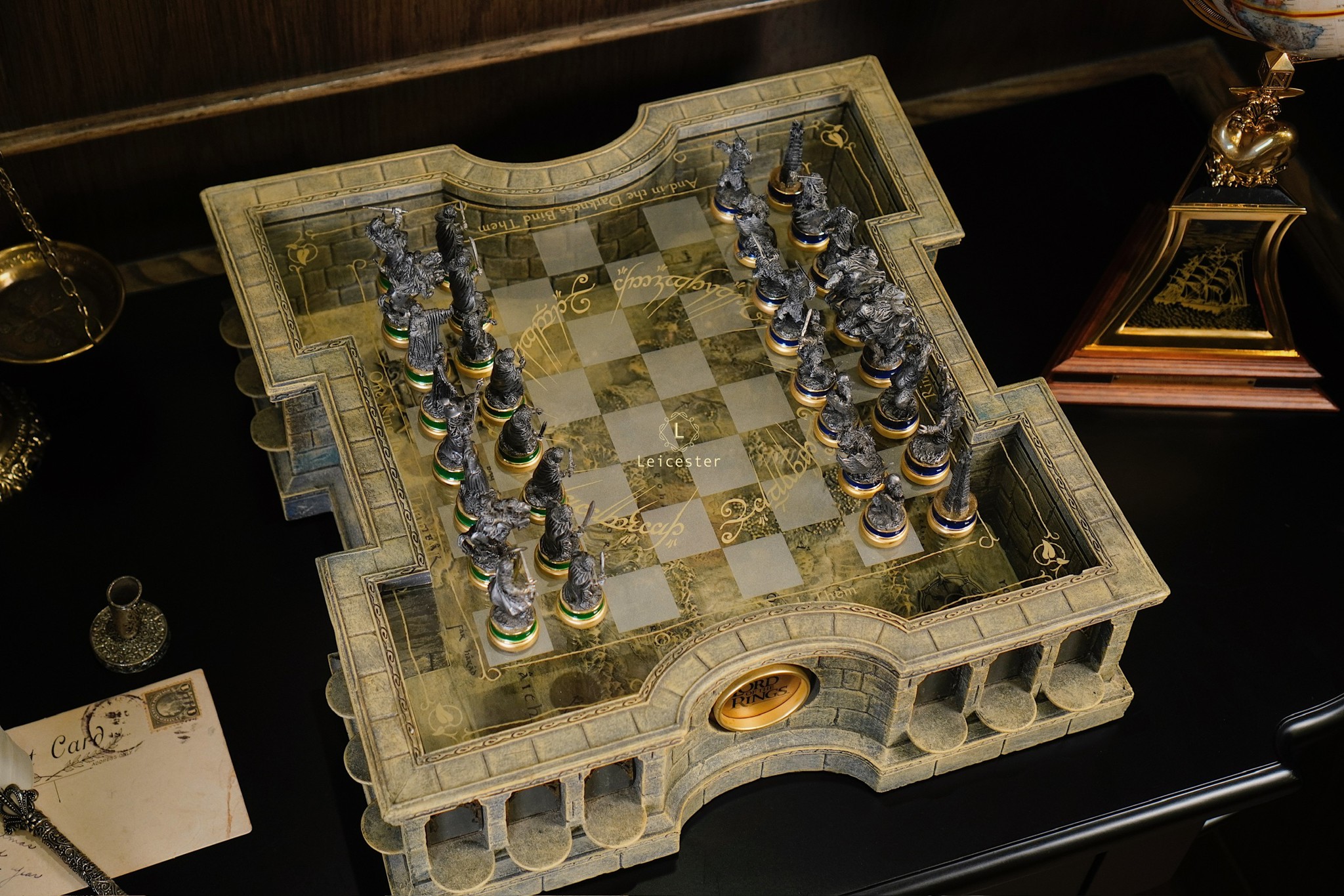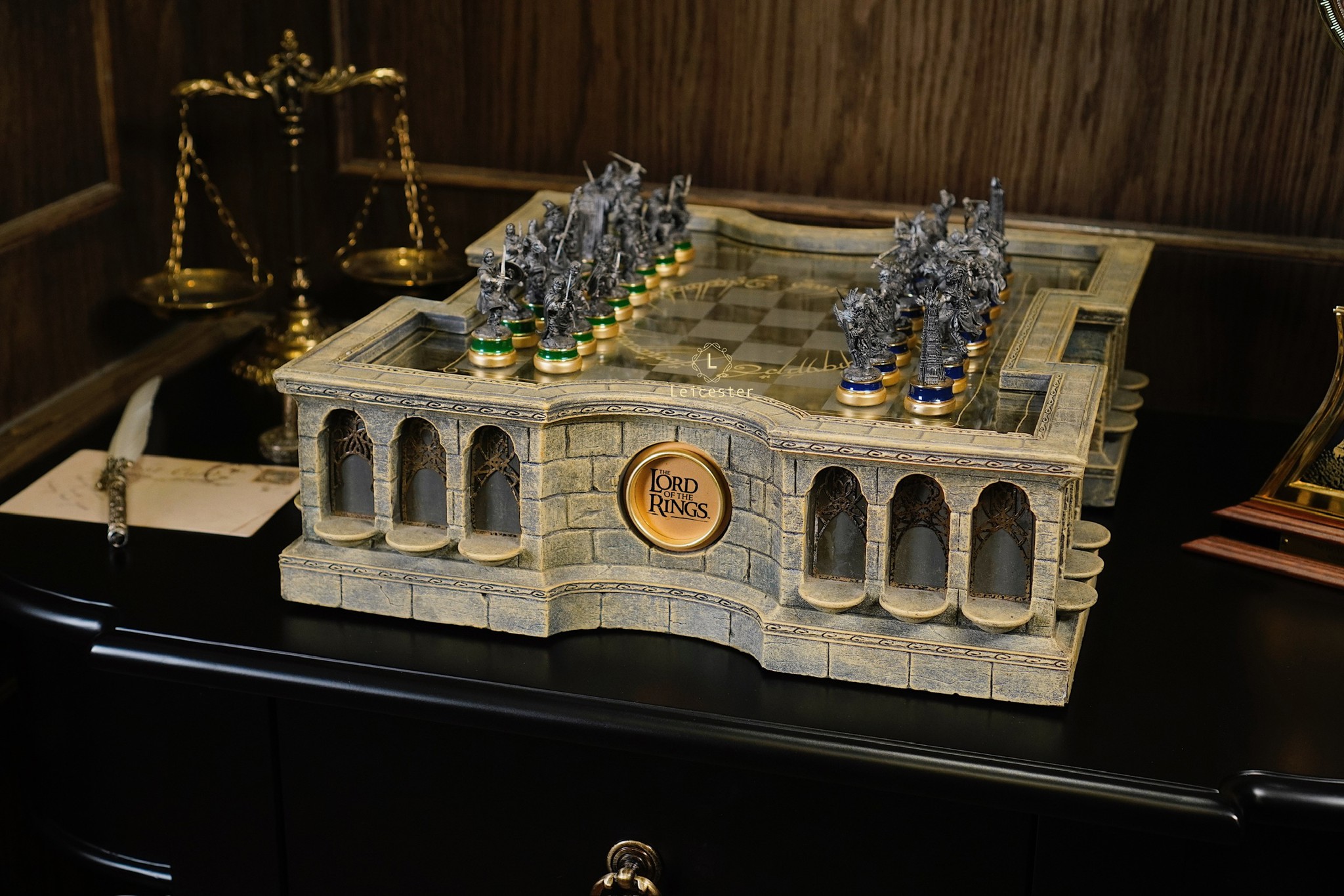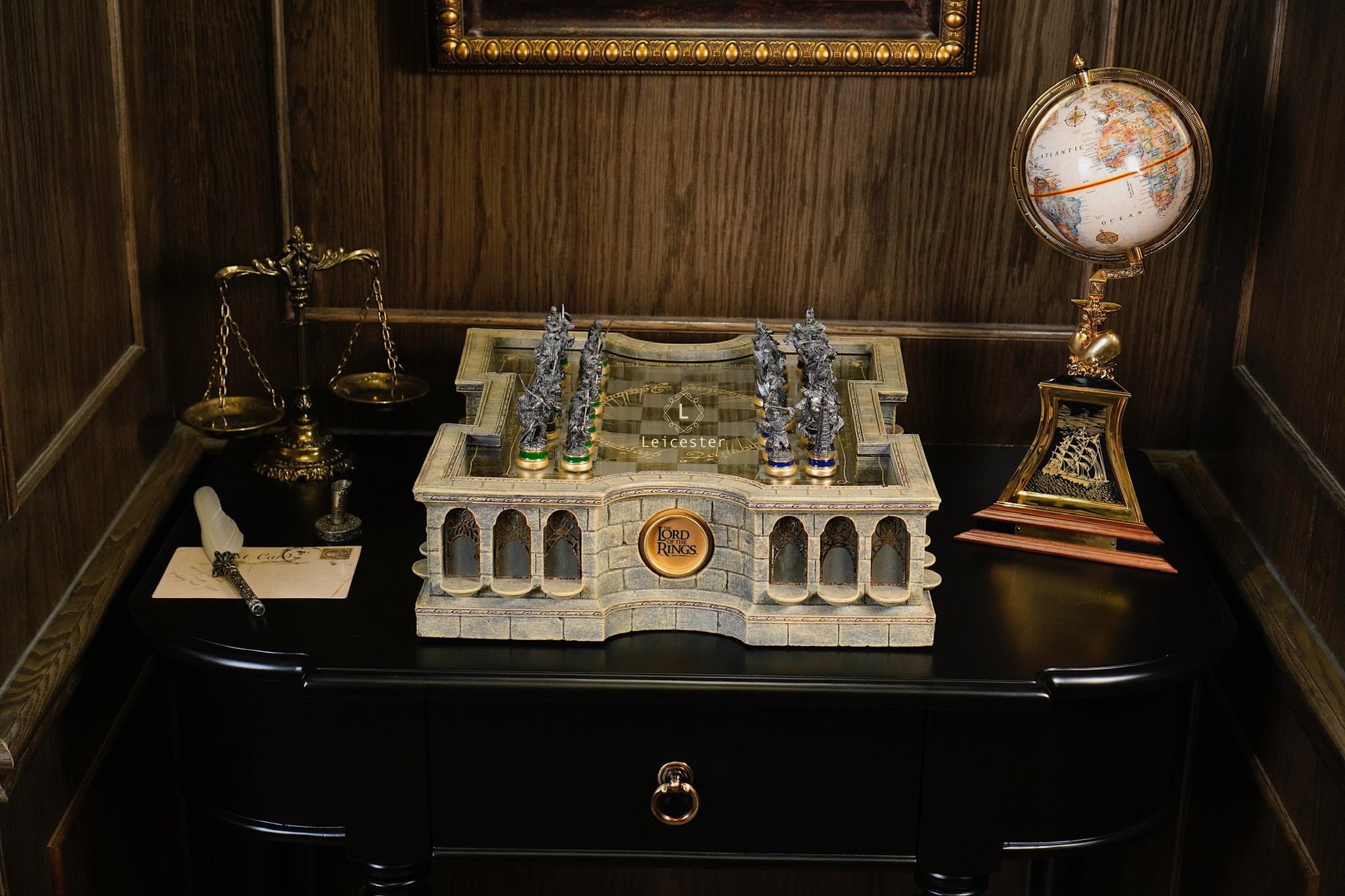 The Lord Of Rings Chess Set là một trong những tác phẩm nghệ thuật ấn tượng nhất mà The Noble Collection từng tạo ra, mọi chi tiết đều chân thực và đúng với bộ phim sử thi từng đoạt giải Oscar. Bên dưới mặt bàn cờ là bản đồ cổ của Middle Earth, bao quanh bàn cờ là nơi đặt những quân cờ có kết cấu trông giống như một nhà thờ lớn, mỗi mặt được đính kèm theo chiếc nhẫn vàng The Lord Of Rings và hình ảnh chân thực của các nhân vật trong phim.