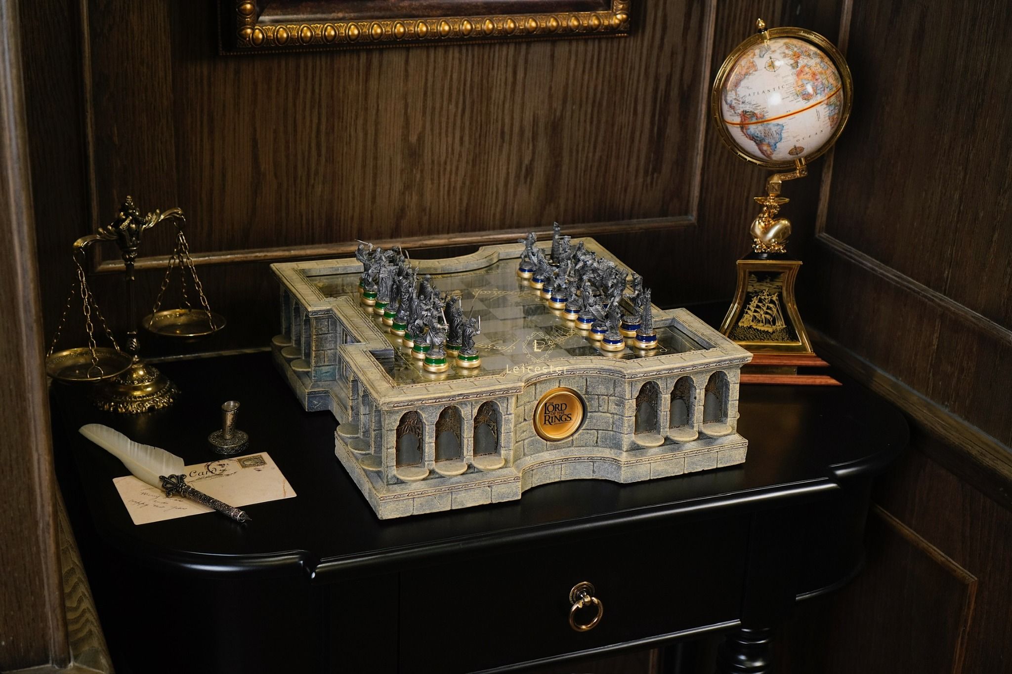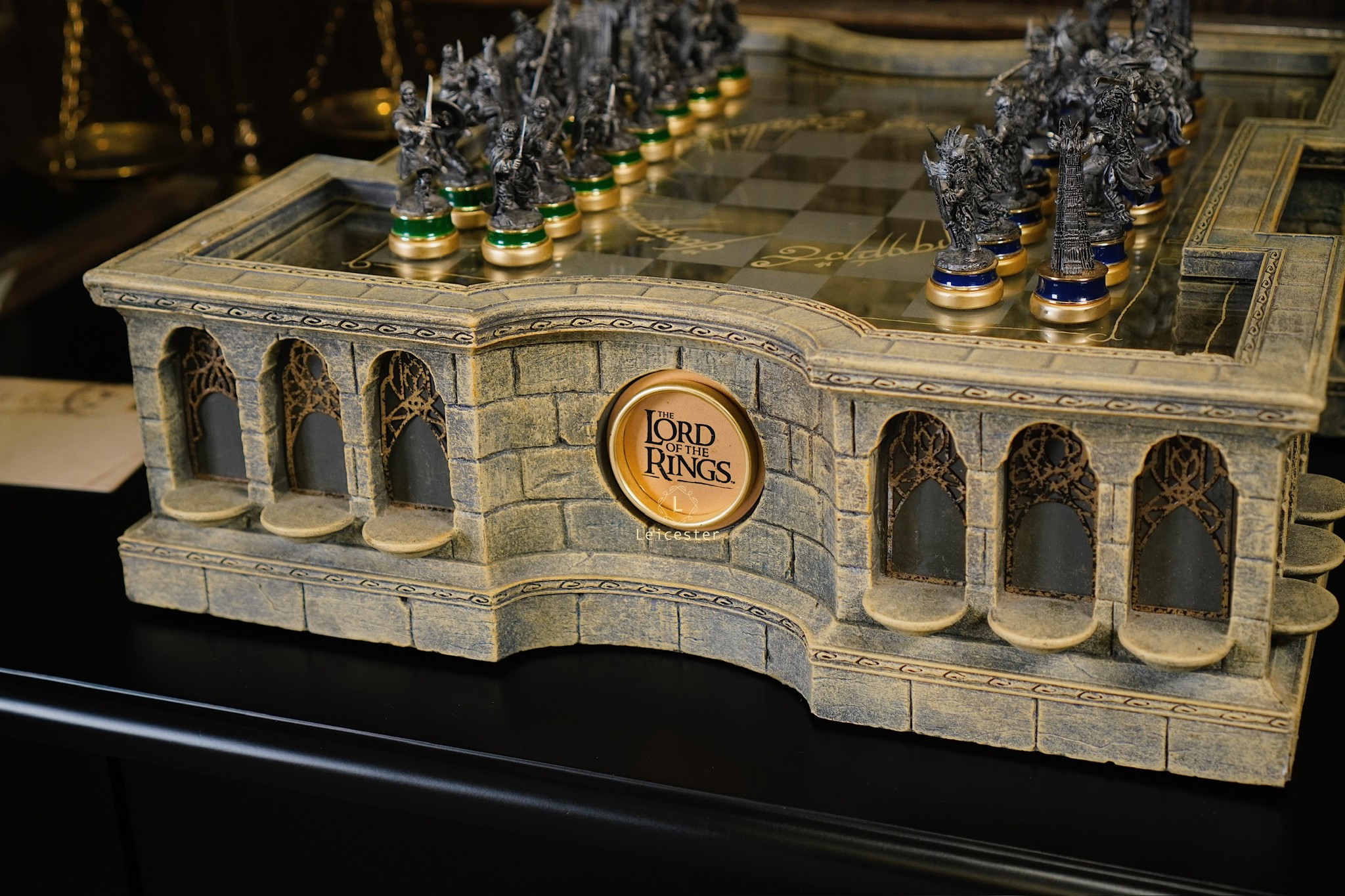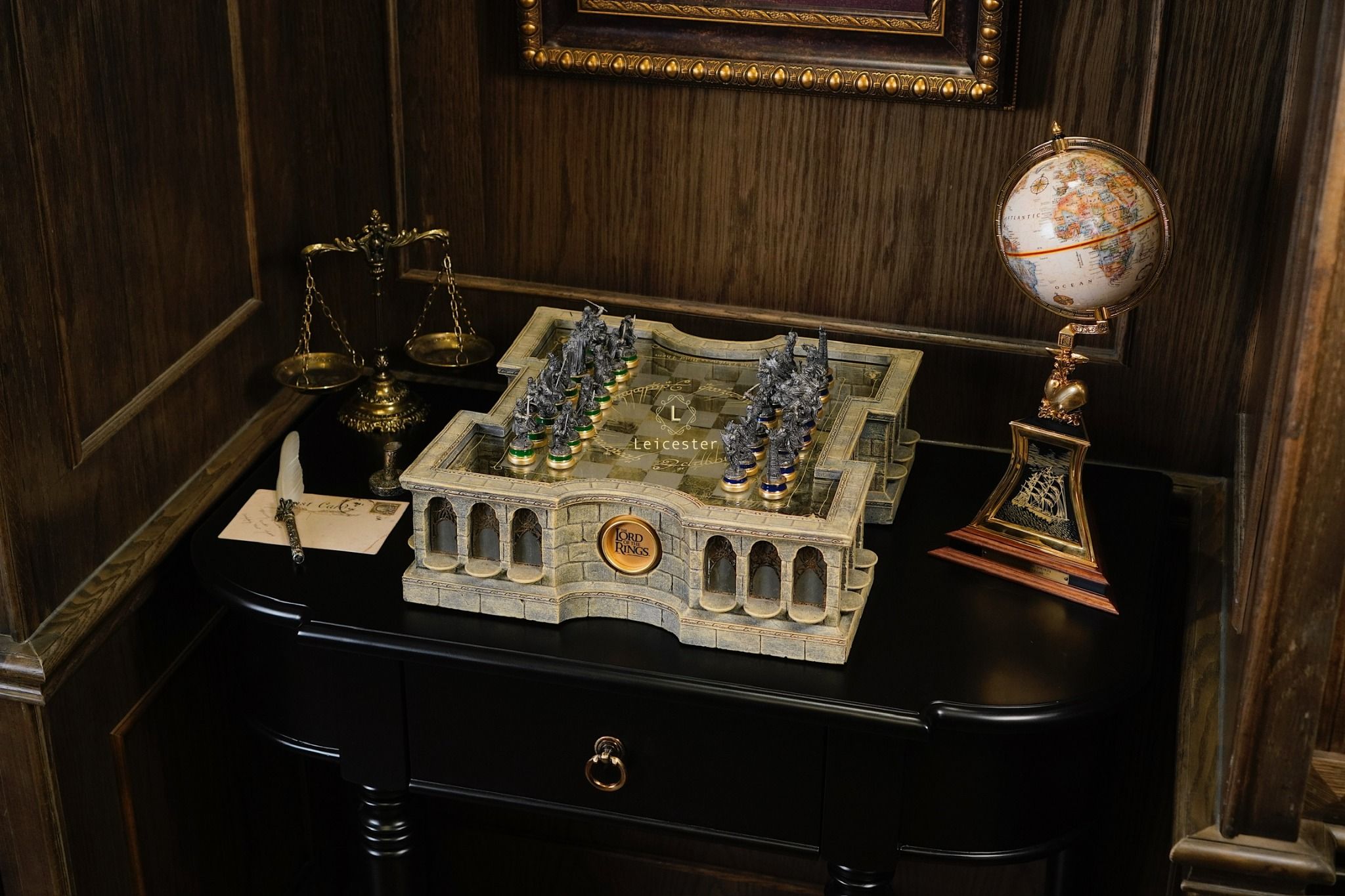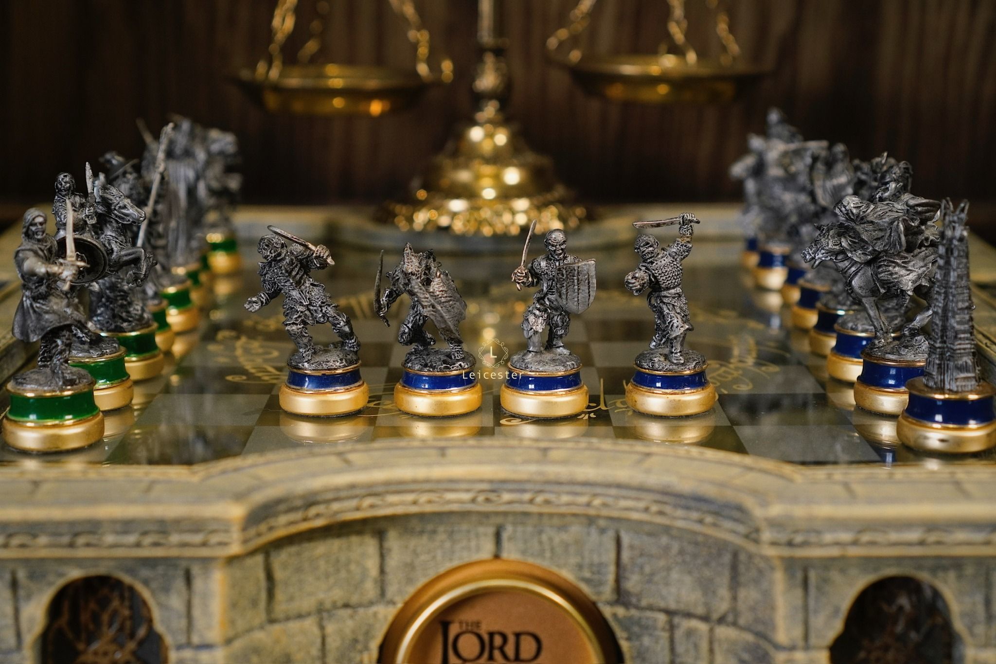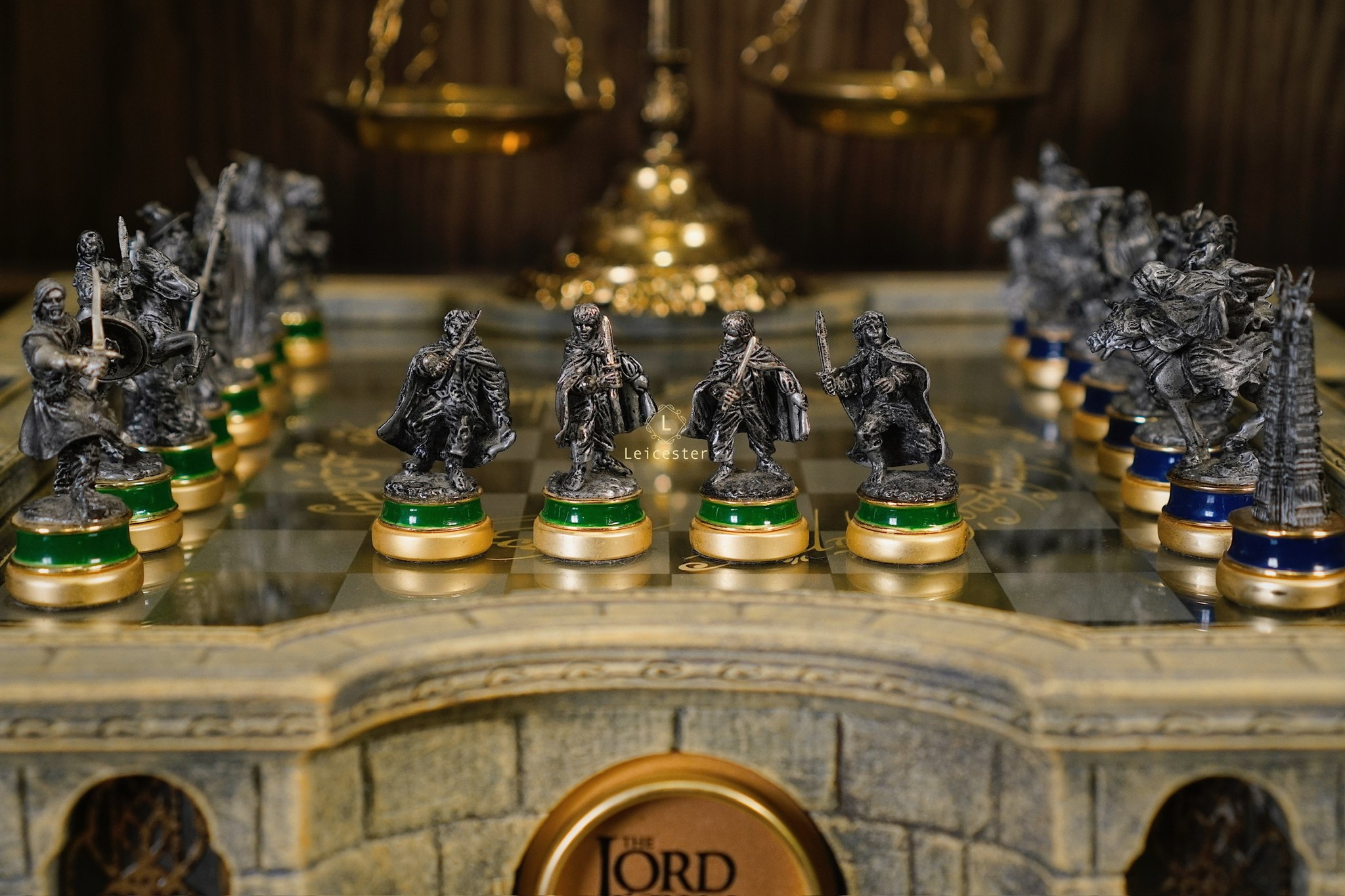 The Lord Of Rings Chess Set là một trong những tác phẩm nghệ thuật ấn tượng nhất mà The Noble Collection từng tạo ra, mọi chi tiết đều chân thực và đúng với bộ phim sử thi từng đoạt giải Oscar. Bên dưới mặt bàn cờ là bản đồ cổ của Middle Earth, bao quanh bàn cờ là nơi đặt những quân cờ có kết cấu trông giống như một nhà thờ lớn, mỗi mặt được đính kèm theo chiếc nhẫn vàng The Lord Of Rings và hình ảnh chân thực của các nhân vật trong phim.