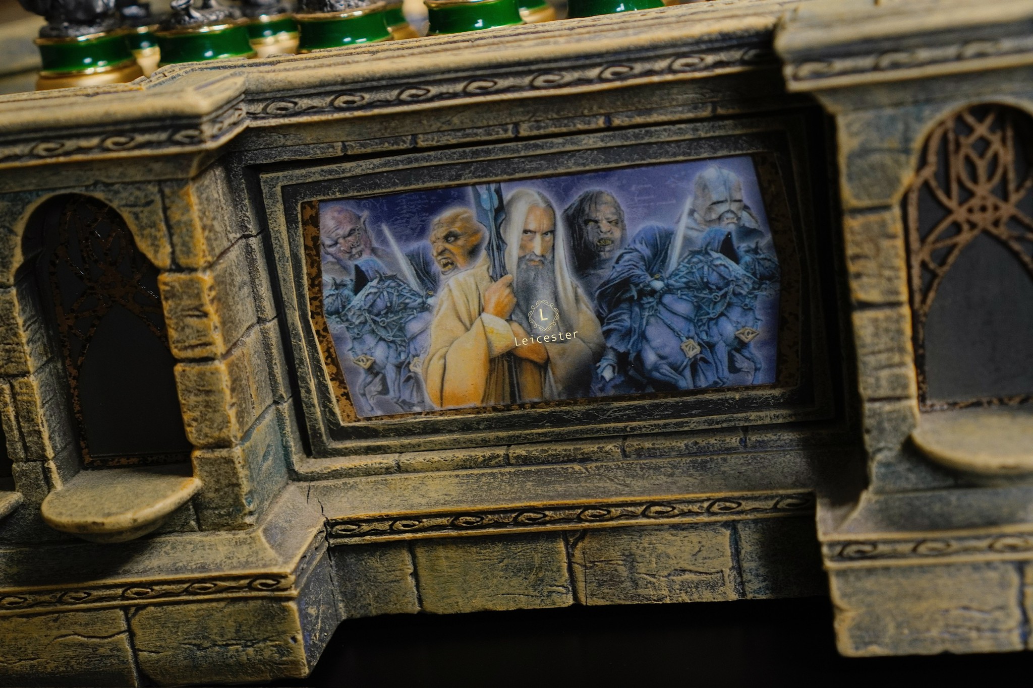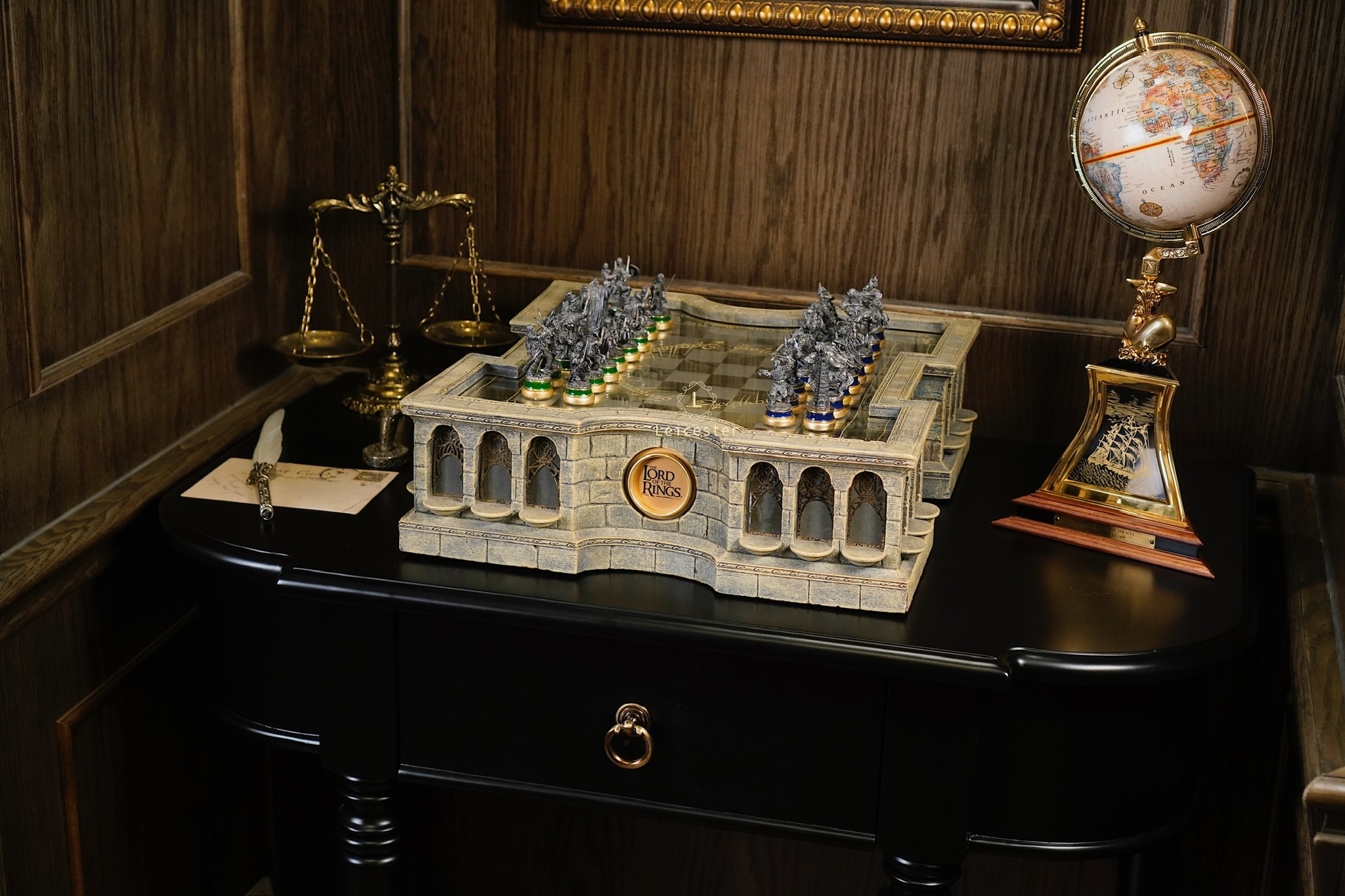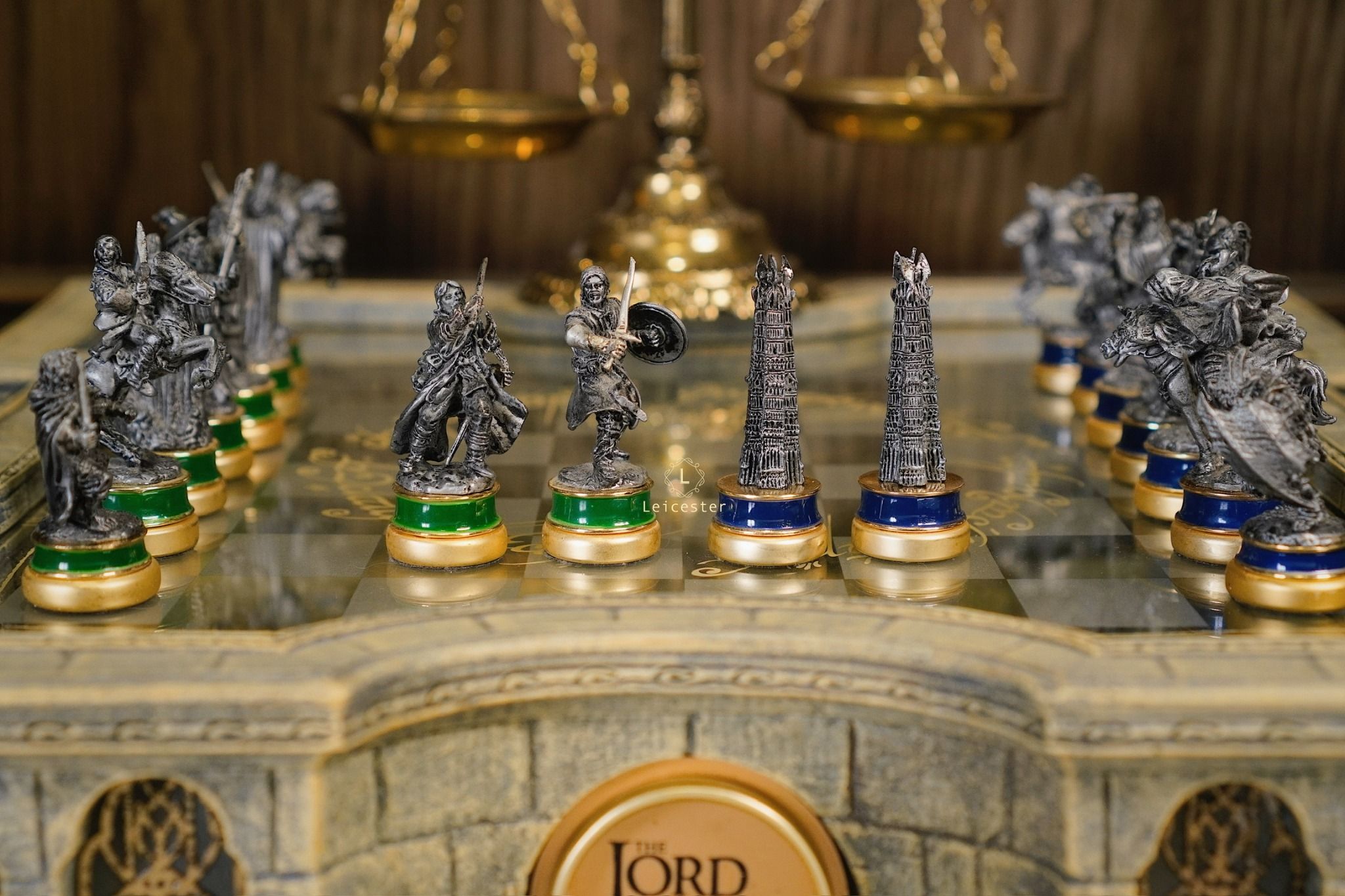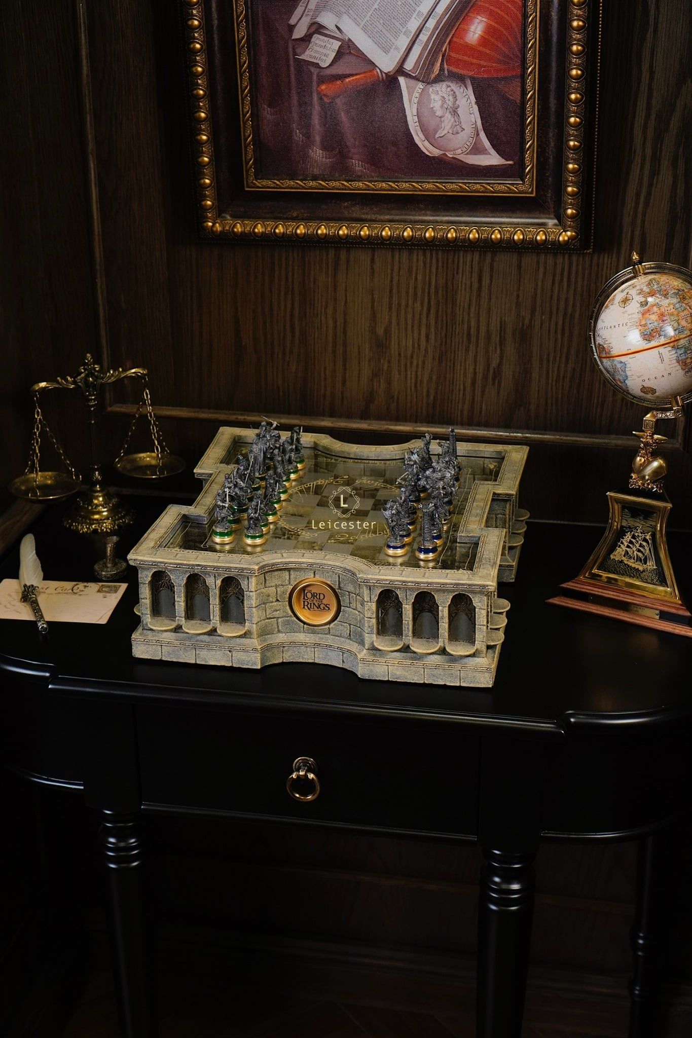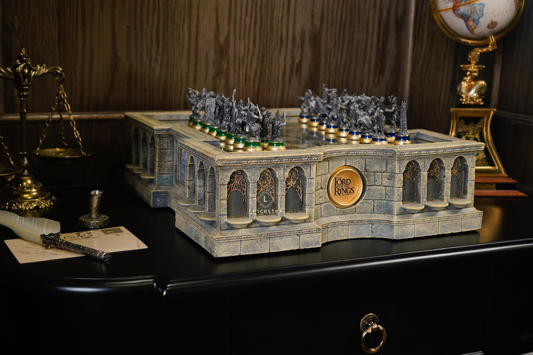The Lord Of Rings Chess Set là một trong những tác phẩm nghệ thuật ấn tượng nhất mà The Noble Collection từng tạo ra, mọi chi tiết đều chân thực và đúng với bộ phim sử thi từng đoạt giải Oscar. Bên dưới mặt bàn cờ là bản đồ cổ của Middle Earth, bao quanh bàn cờ là nơi đặt những quân cờ có kết cấu trông giống như một nhà thờ lớn, mỗi mặt được đính kèm theo chiếc nhẫn vàng The Lord Of Rings và hình ảnh chân thực của các nhân vật trong phim.