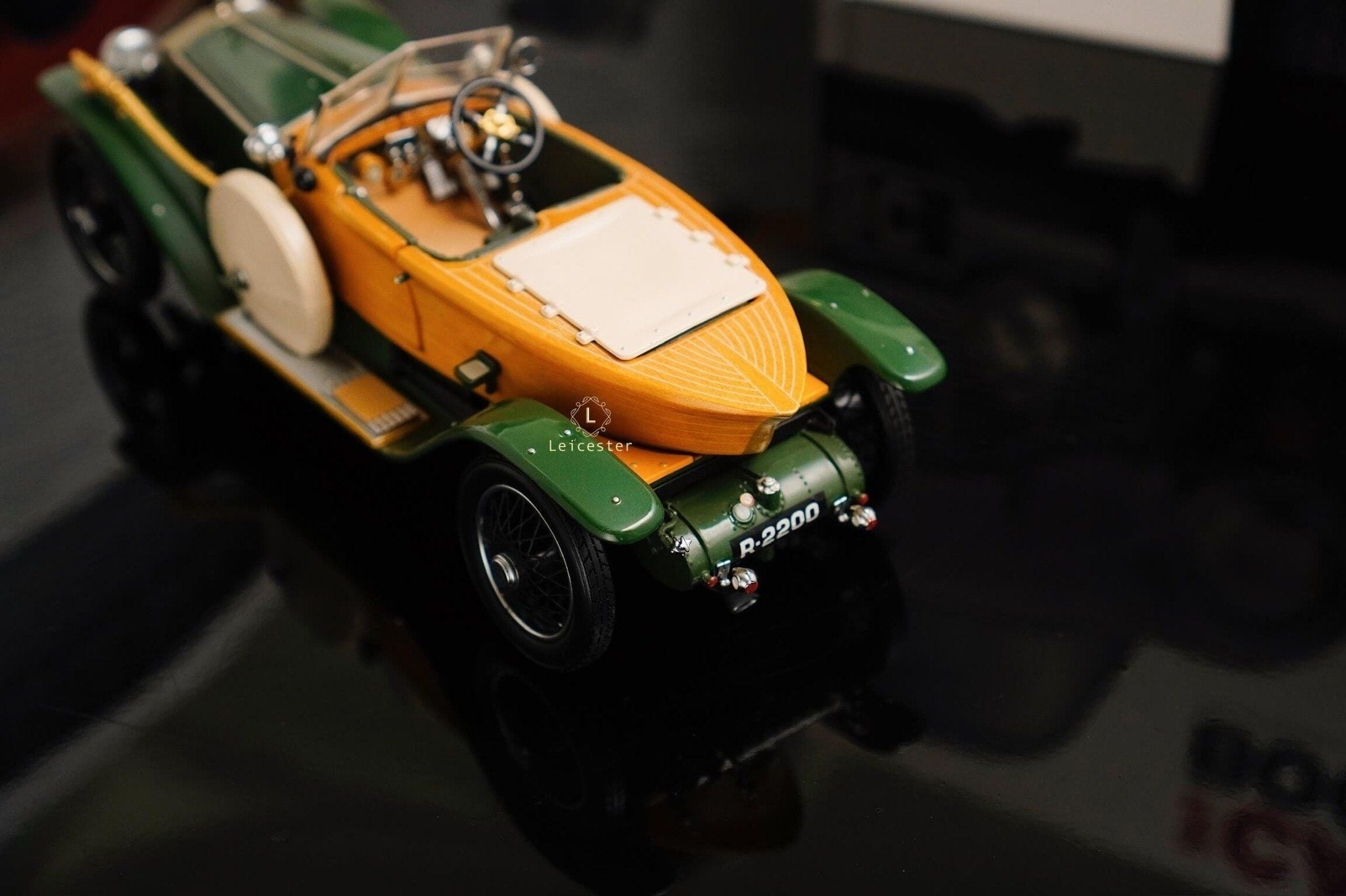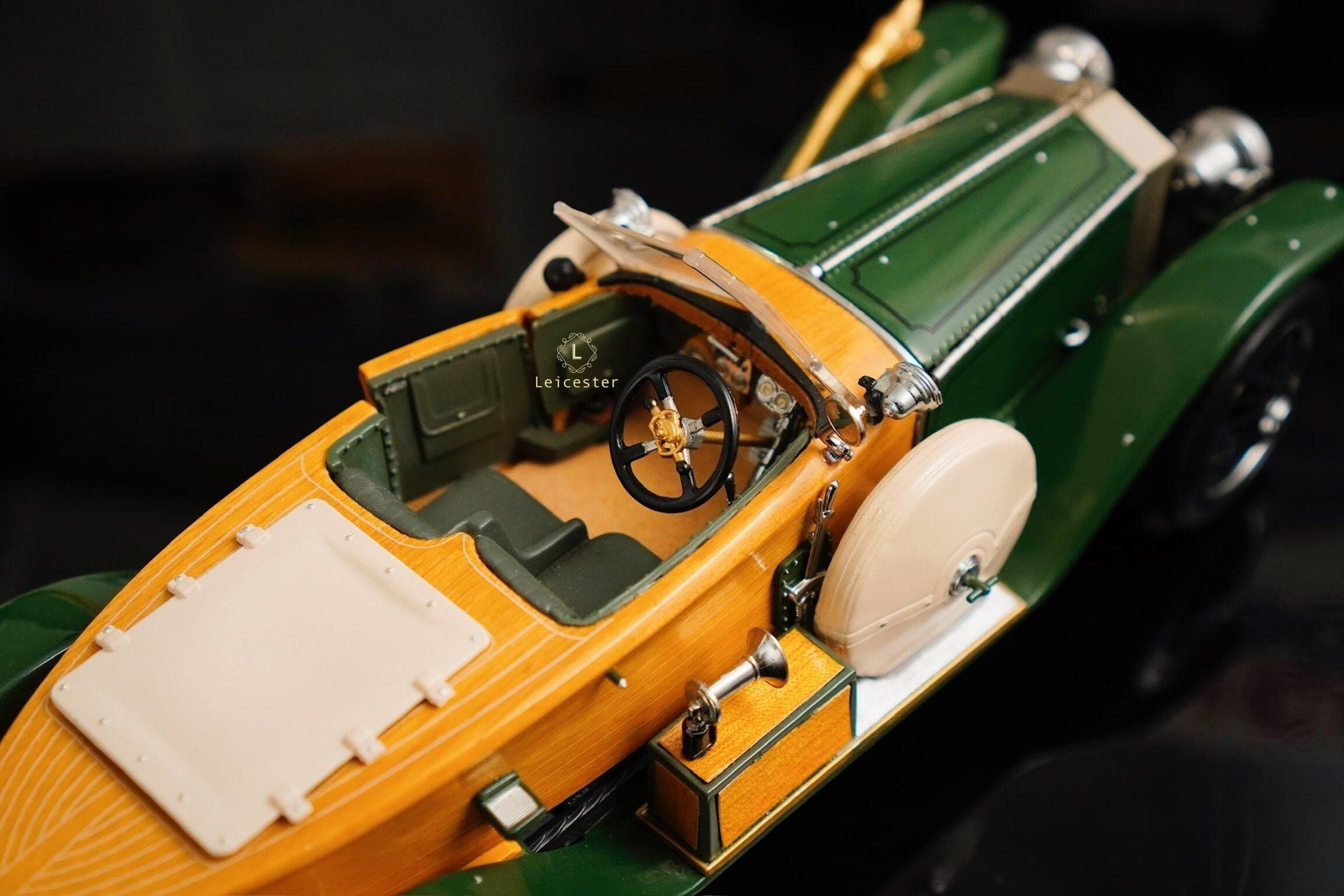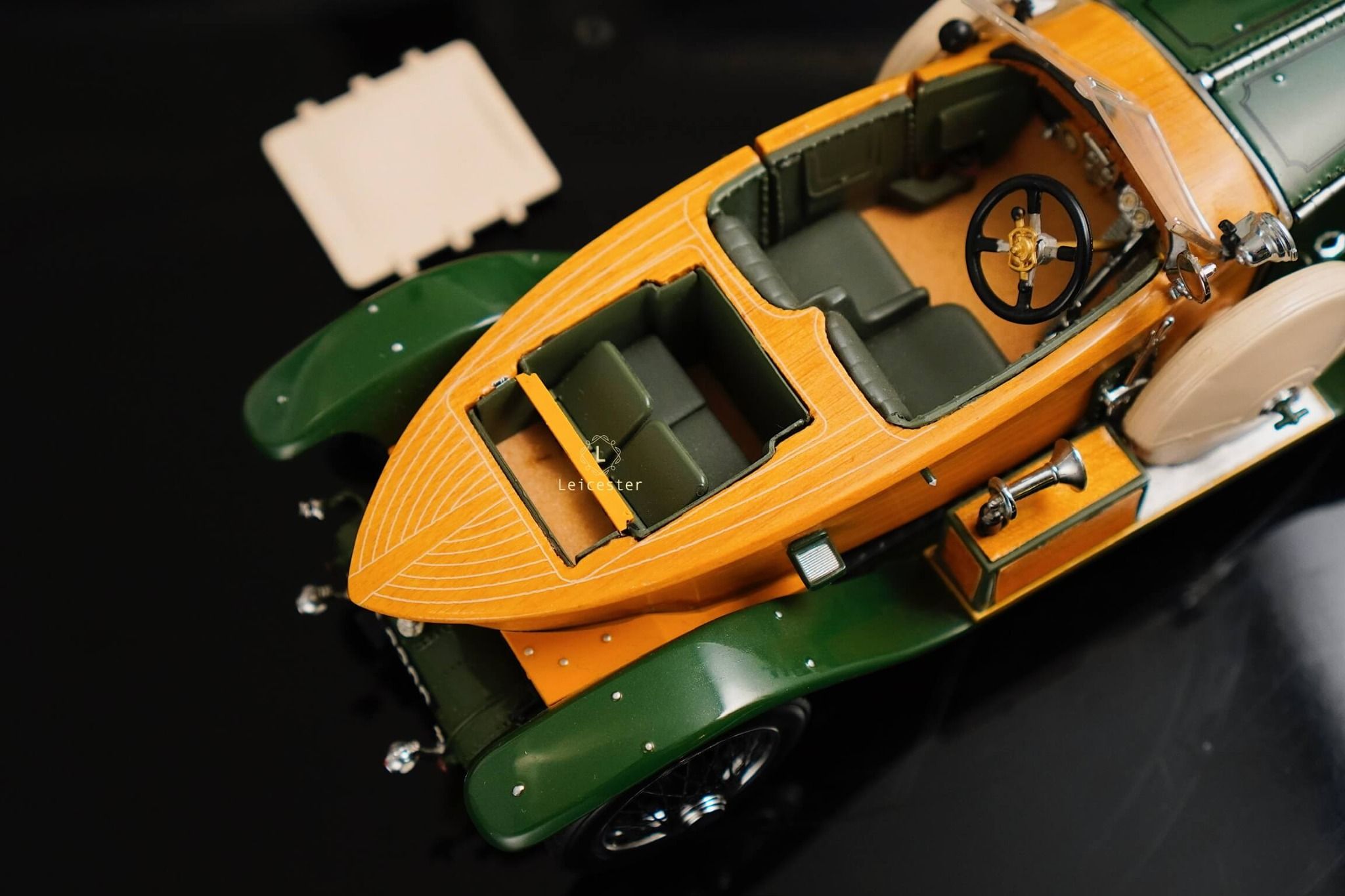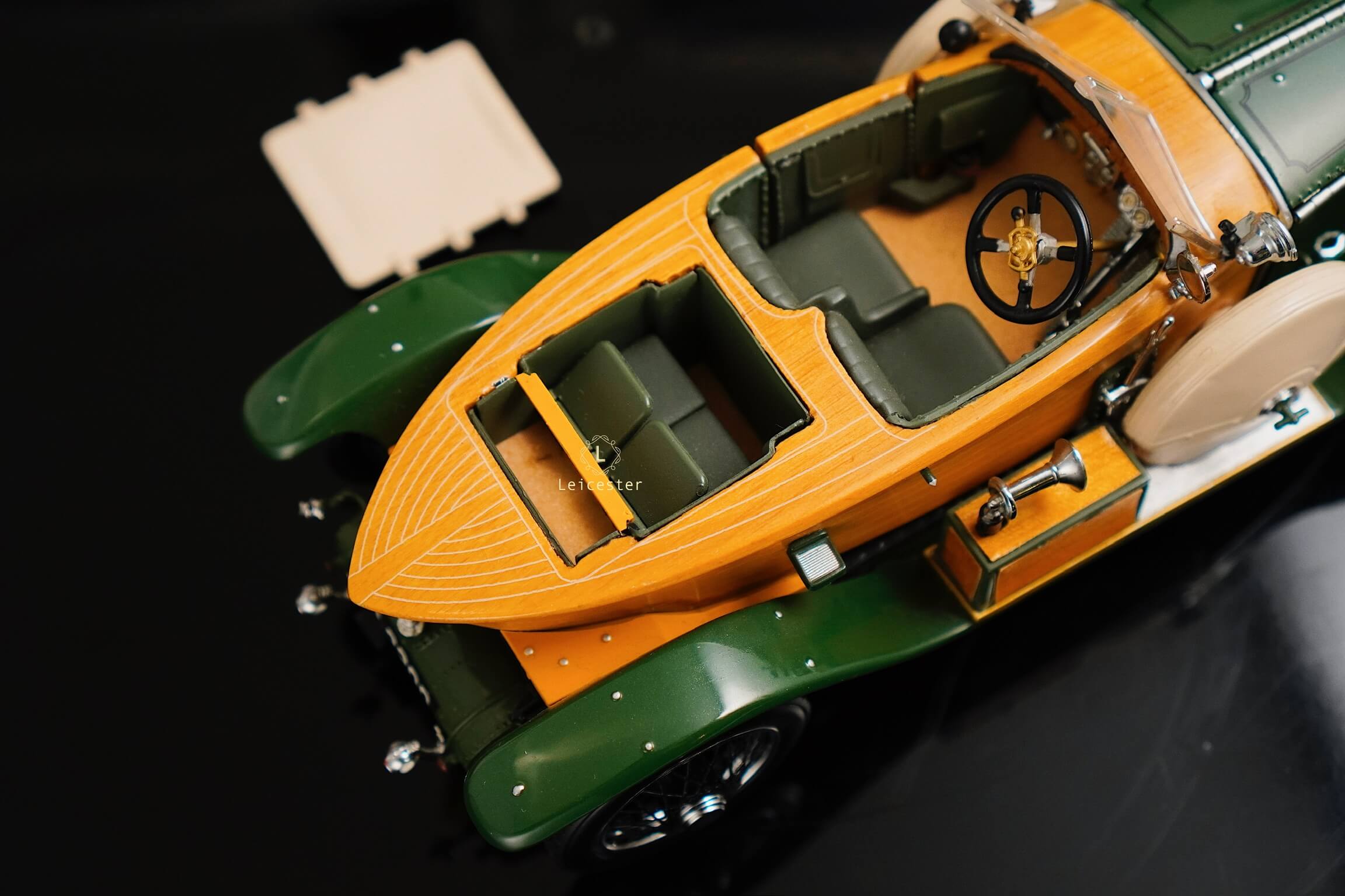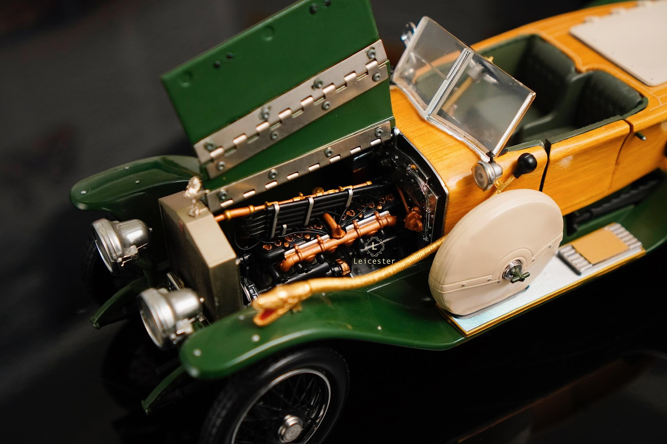Mô hình khoác sắc xanh British racing green kết hợp ốp gỗ vàng óng, mui mềm màu kem và nội thất tông xám tro thanh lịch. Bộ đôi lốp dự phòng bên hông, đèn pha đồng cổ và lưới tản nhiệt mang logo Rolls-Royce khiến tổng thể trở nên hoàn mỹ. Một tác phẩm xứng tầm sưu tầm, nơi kỹ nghệ mô hình đạt đến đỉnh cao nghệ thuật.