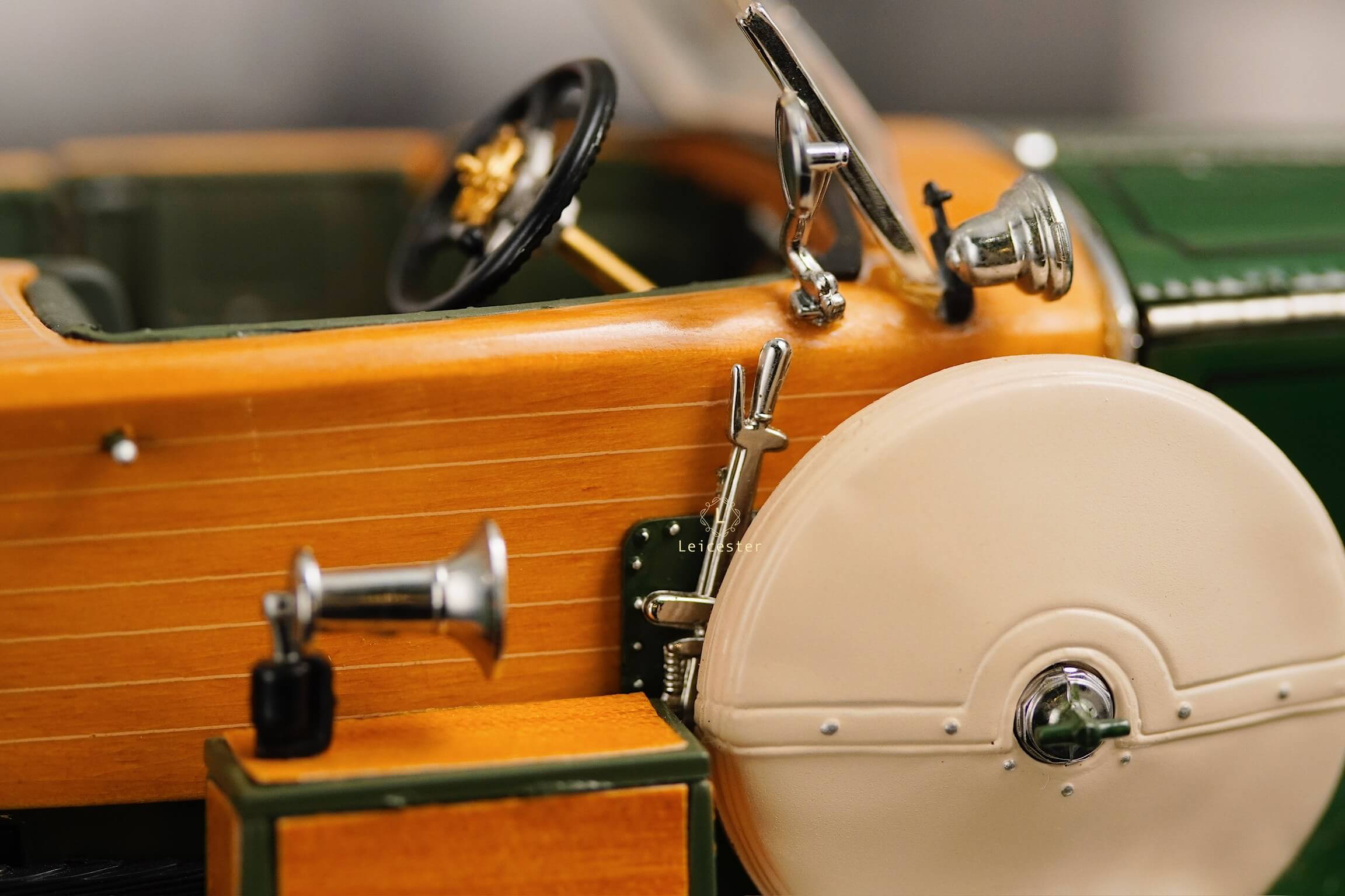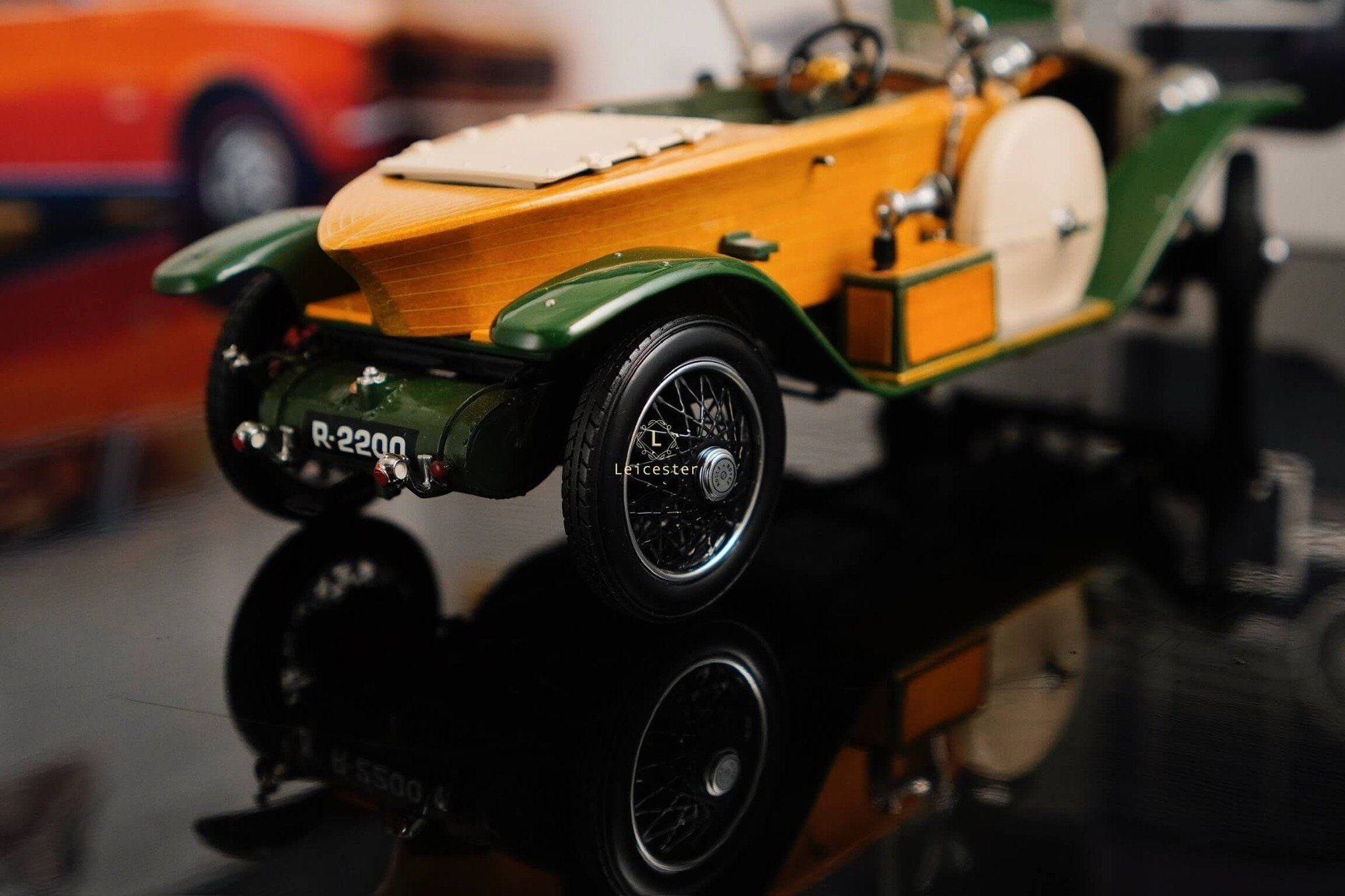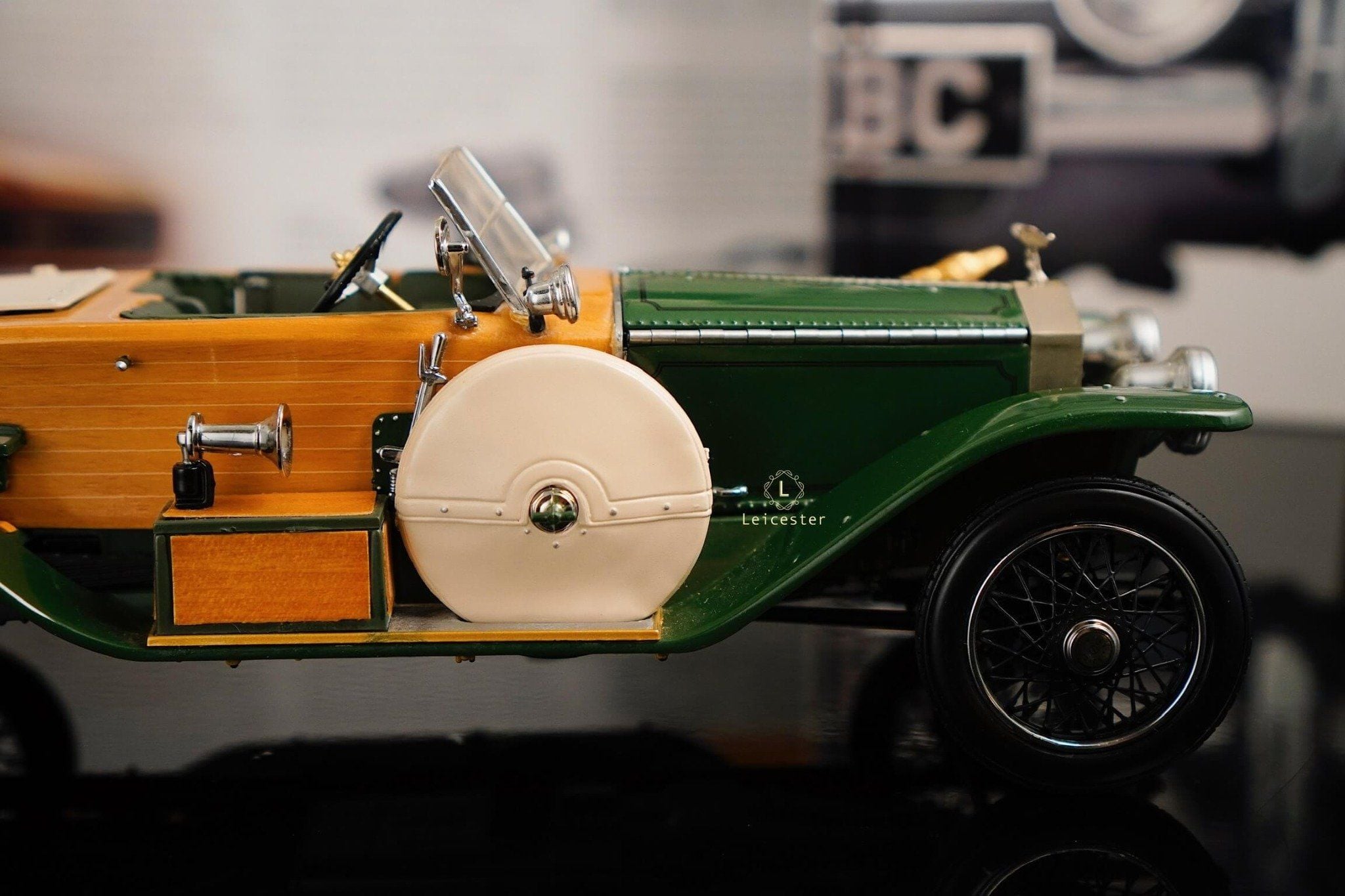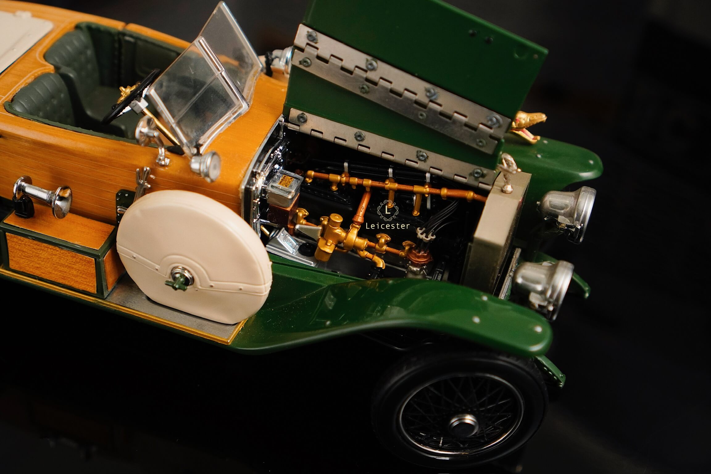 Mô hình khoác sắc xanh British racing green kết hợp ốp gỗ vàng óng, mui mềm màu kem và nội thất tông xám tro thanh lịch. Bộ đôi lốp dự phòng bên hông, đèn pha đồng cổ và lưới tản nhiệt mang logo Rolls-Royce khiến tổng thể trở nên hoàn mỹ. Một tác phẩm xứng tầm sưu tầm, nơi kỹ nghệ mô hình đạt đến đỉnh cao nghệ thuật.