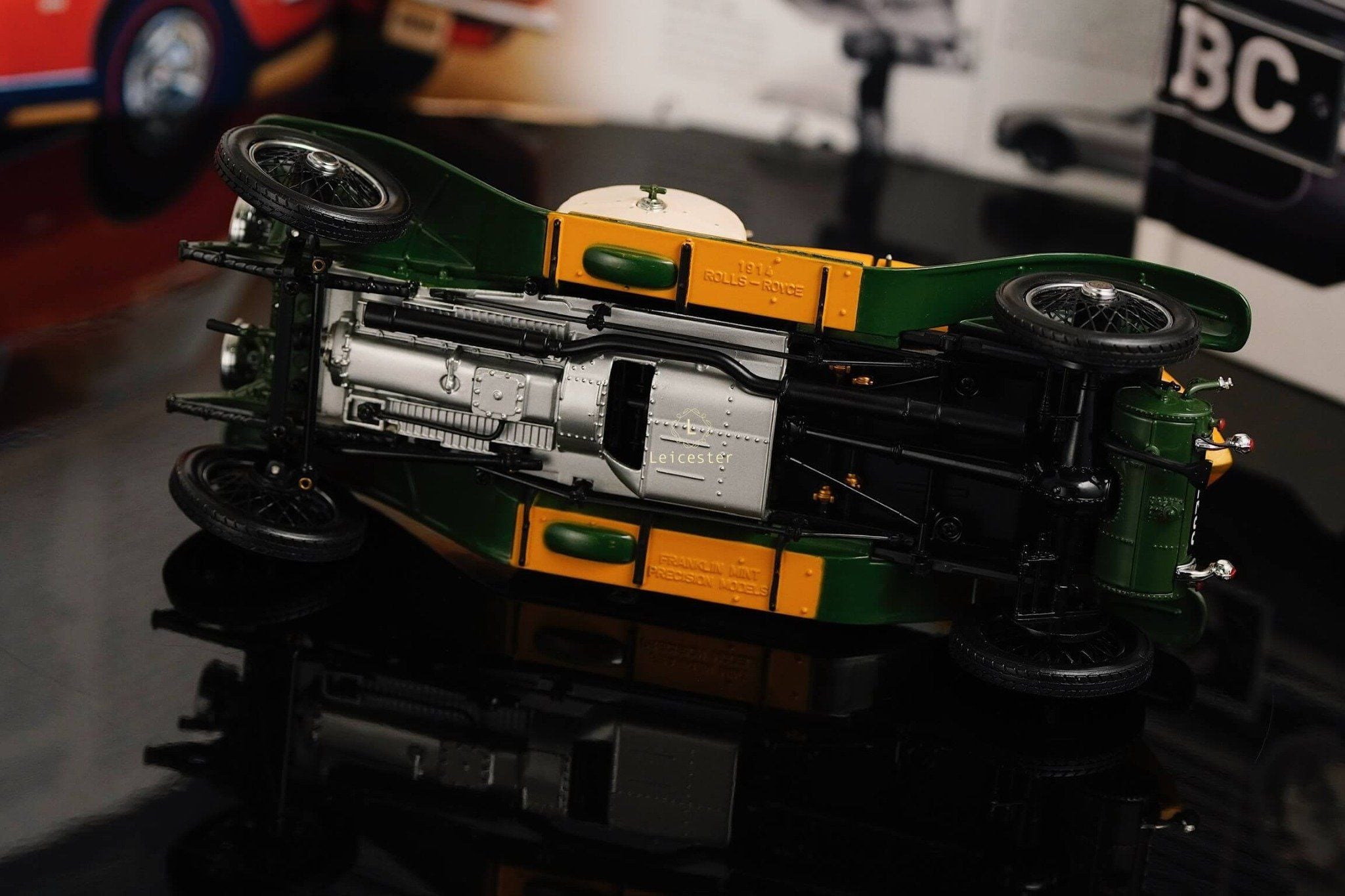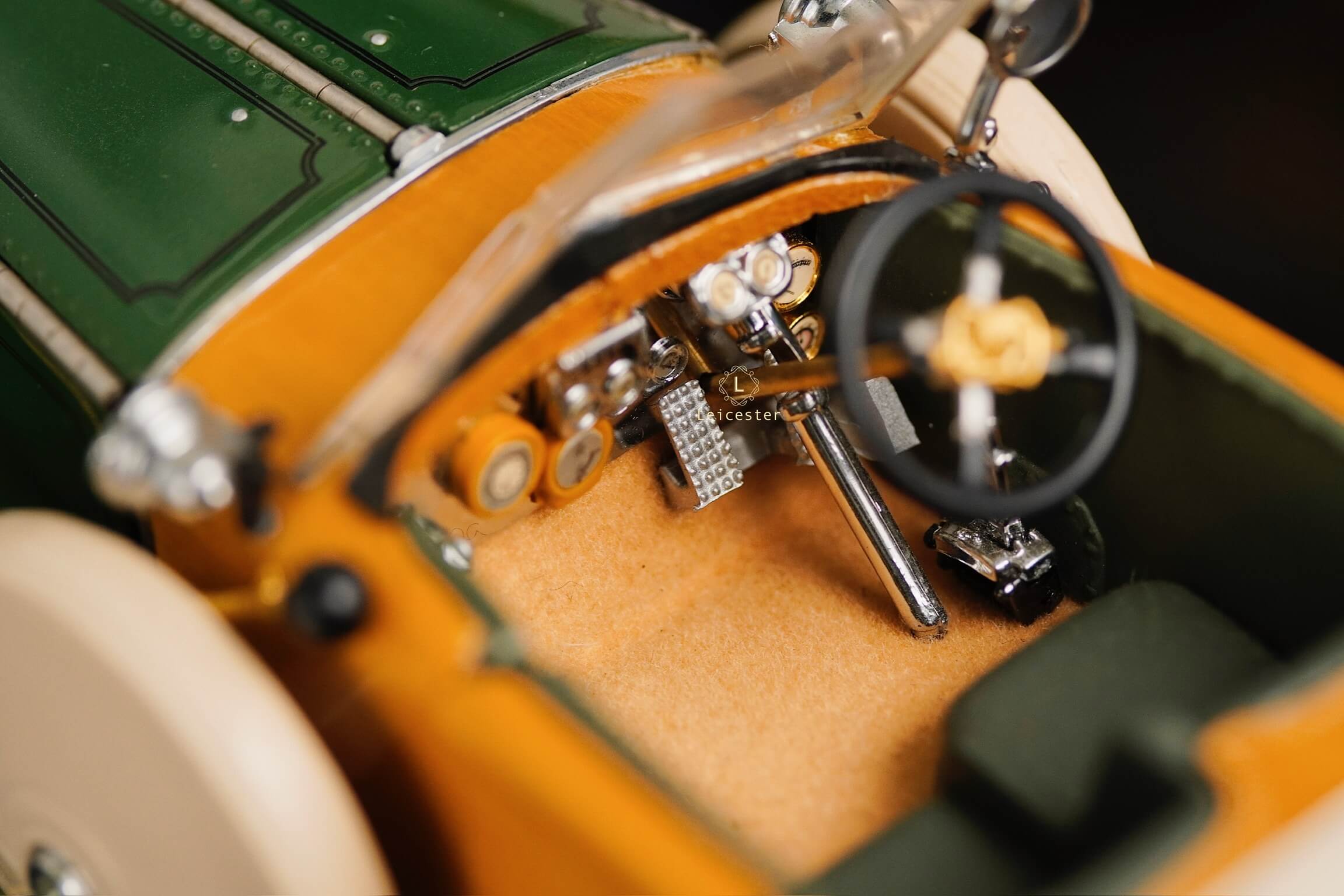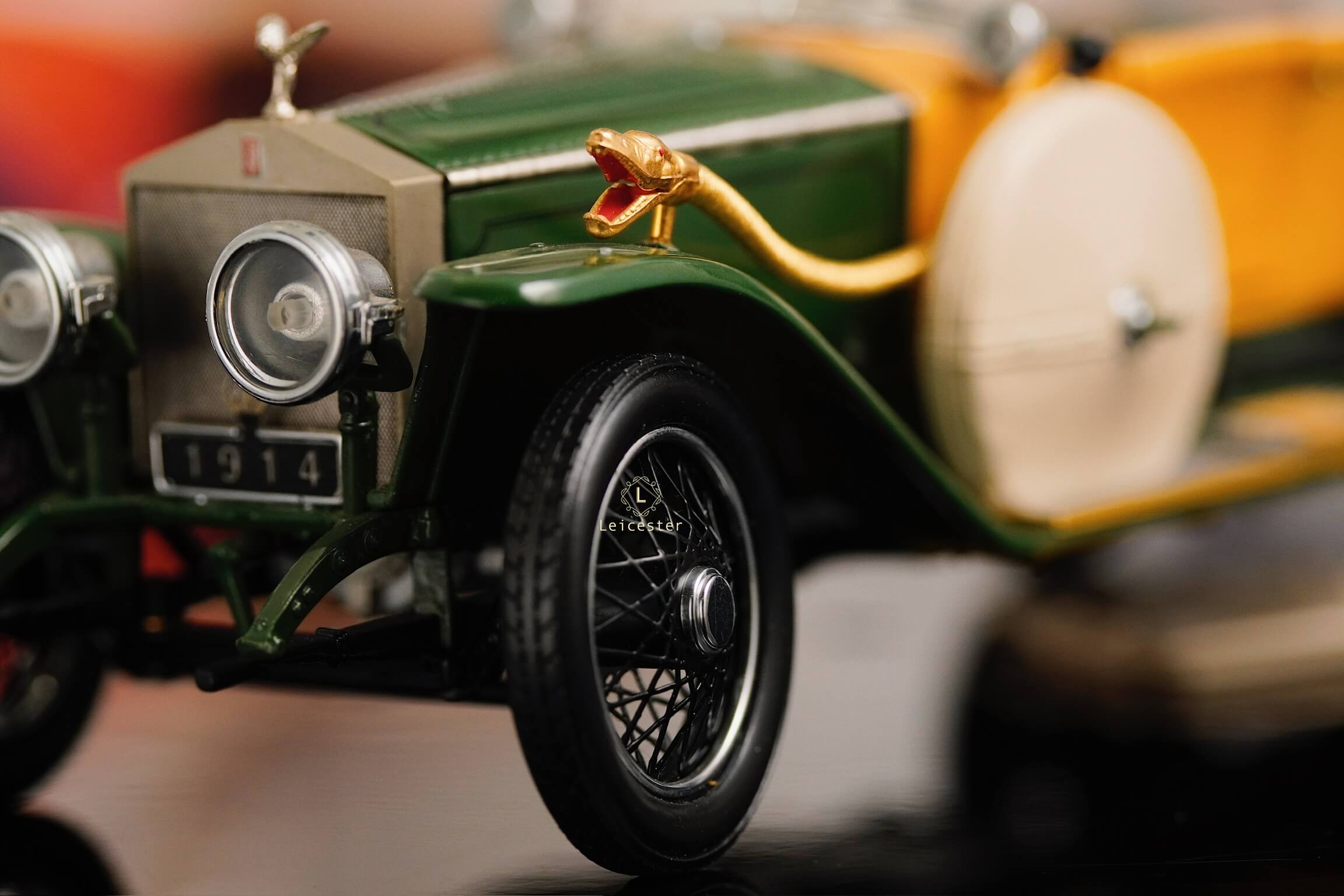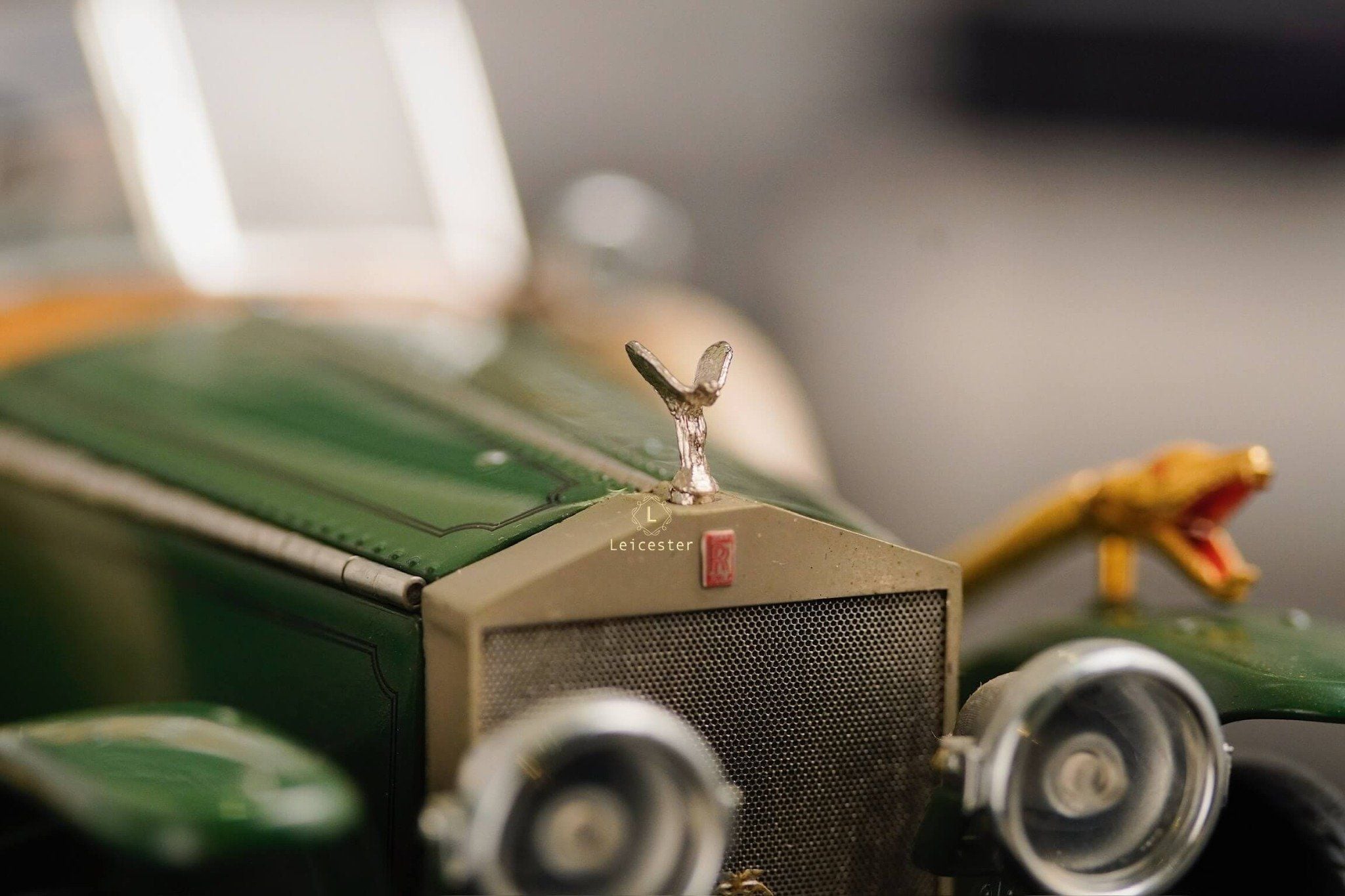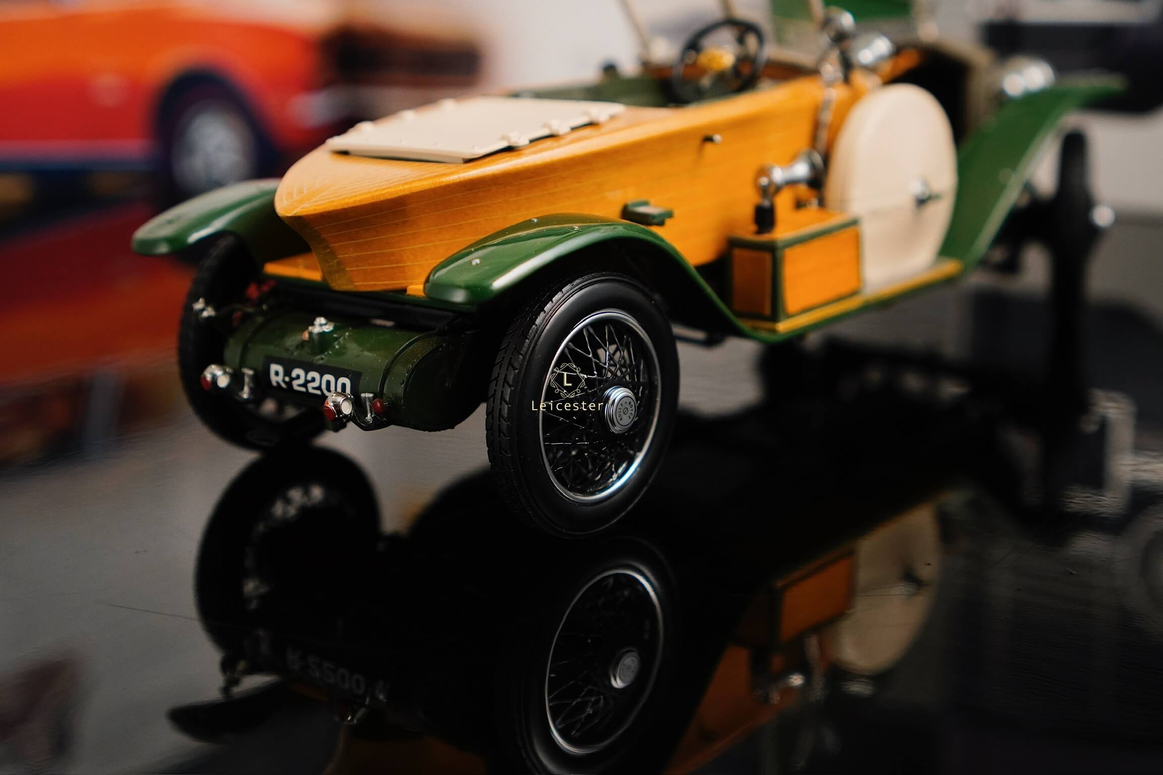 Mô hình khoác sắc xanh British racing green kết hợp ốp gỗ vàng óng, mui mềm màu kem và nội thất tông xám tro thanh lịch. Bộ đôi lốp dự phòng bên hông, đèn pha đồng cổ và lưới tản nhiệt mang logo Rolls-Royce khiến tổng thể trở nên hoàn mỹ. Một tác phẩm xứng tầm sưu tầm, nơi kỹ nghệ mô hình đạt đến đỉnh cao nghệ thuật.