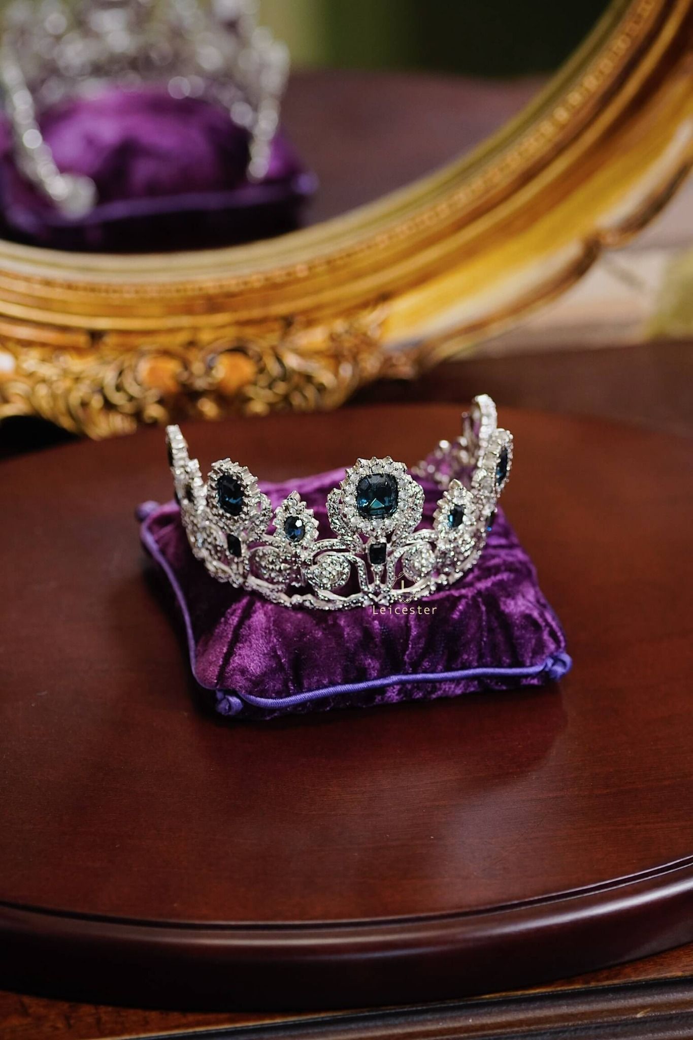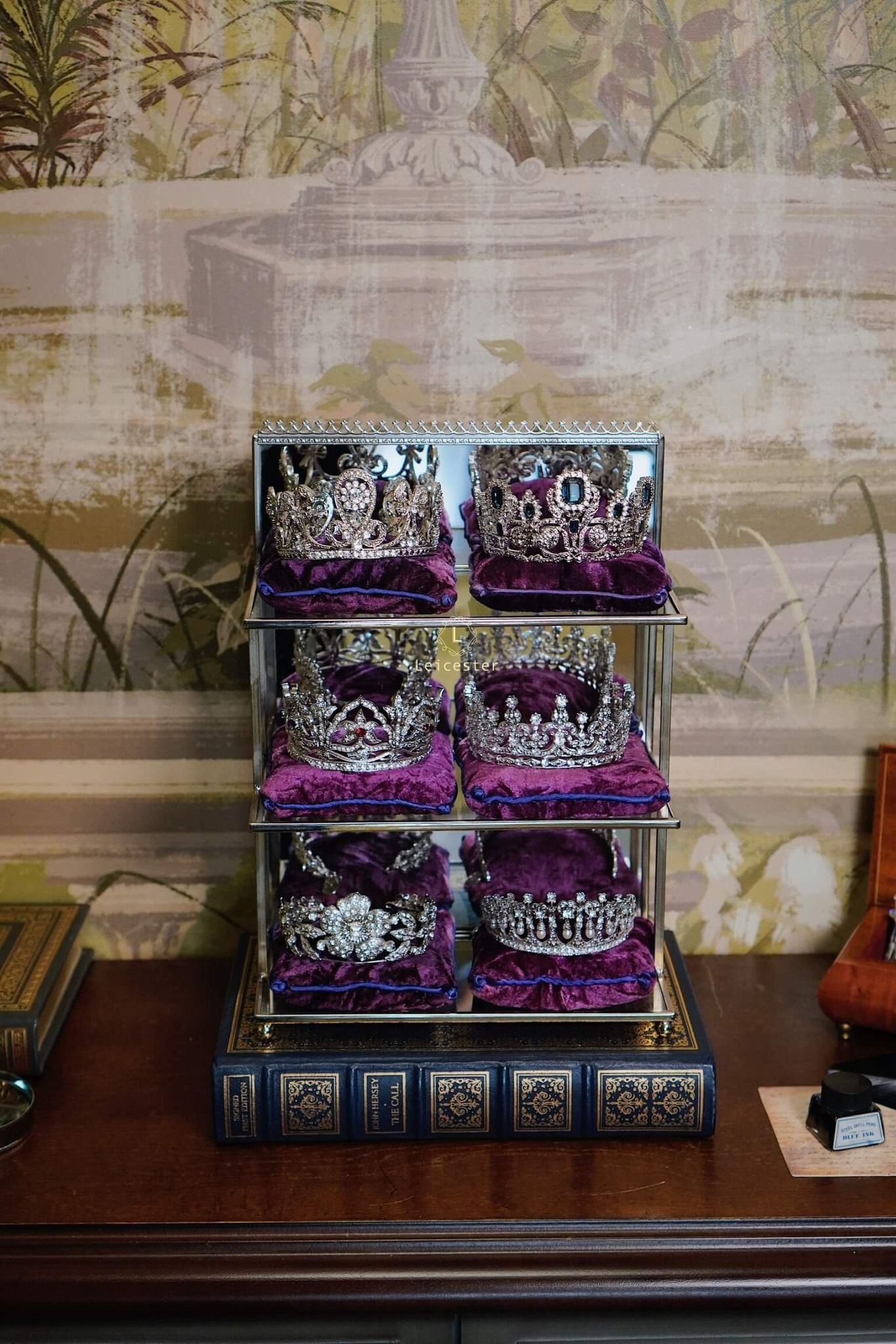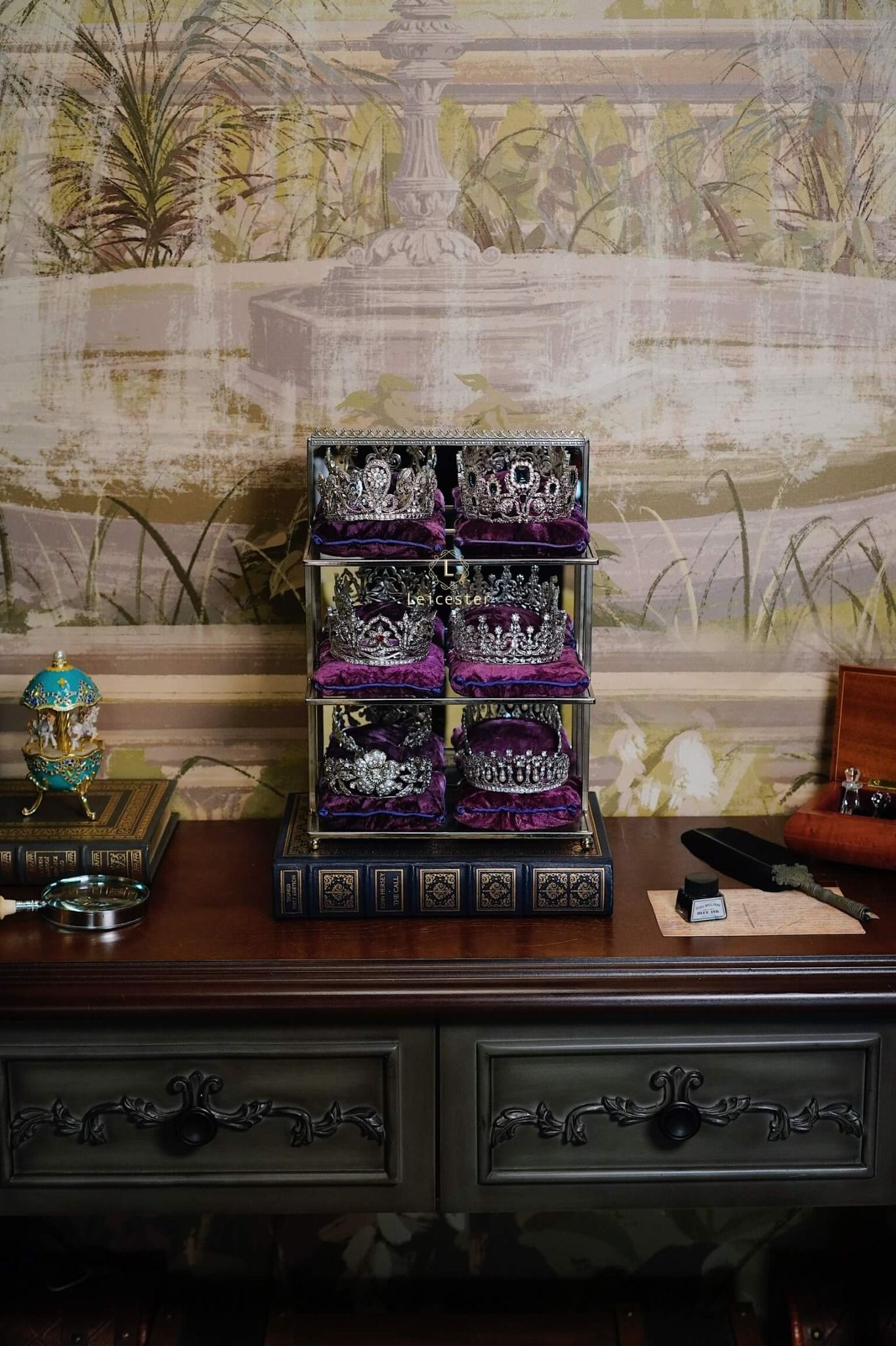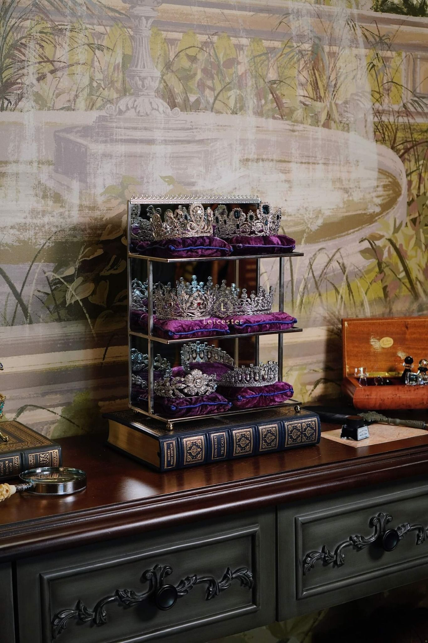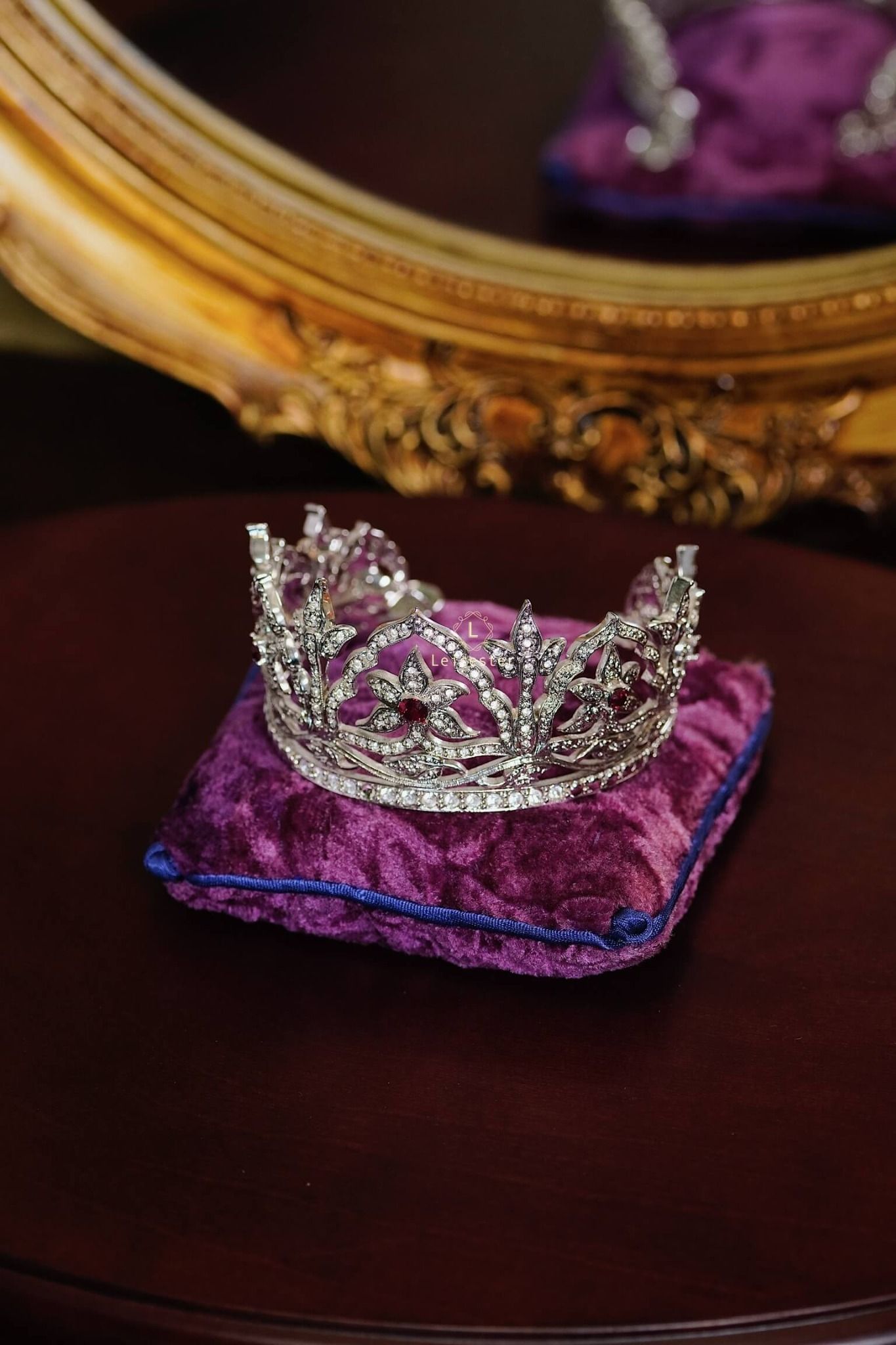 Tác phẩm được trưng bày trên kệ kính sang trọng, mỗi vương miện đặt trên gối nhung tím hoàng gia kèm tag tên riêng của từng công chúa – tái hiện không khí của một phòng trưng bày bảo vật hoàng gia thật sự. Từng đường cong tinh xảo, chi tiết chạm khắc sáng bạc và pha lê long lanh đều được hoàn thiện thủ công tỉ mỉ, khiến ánh sáng phản chiếu như một dải ngân hà thu nhỏ, mang lại cảm giác vừa cổ điển vừa vĩnh cửu.