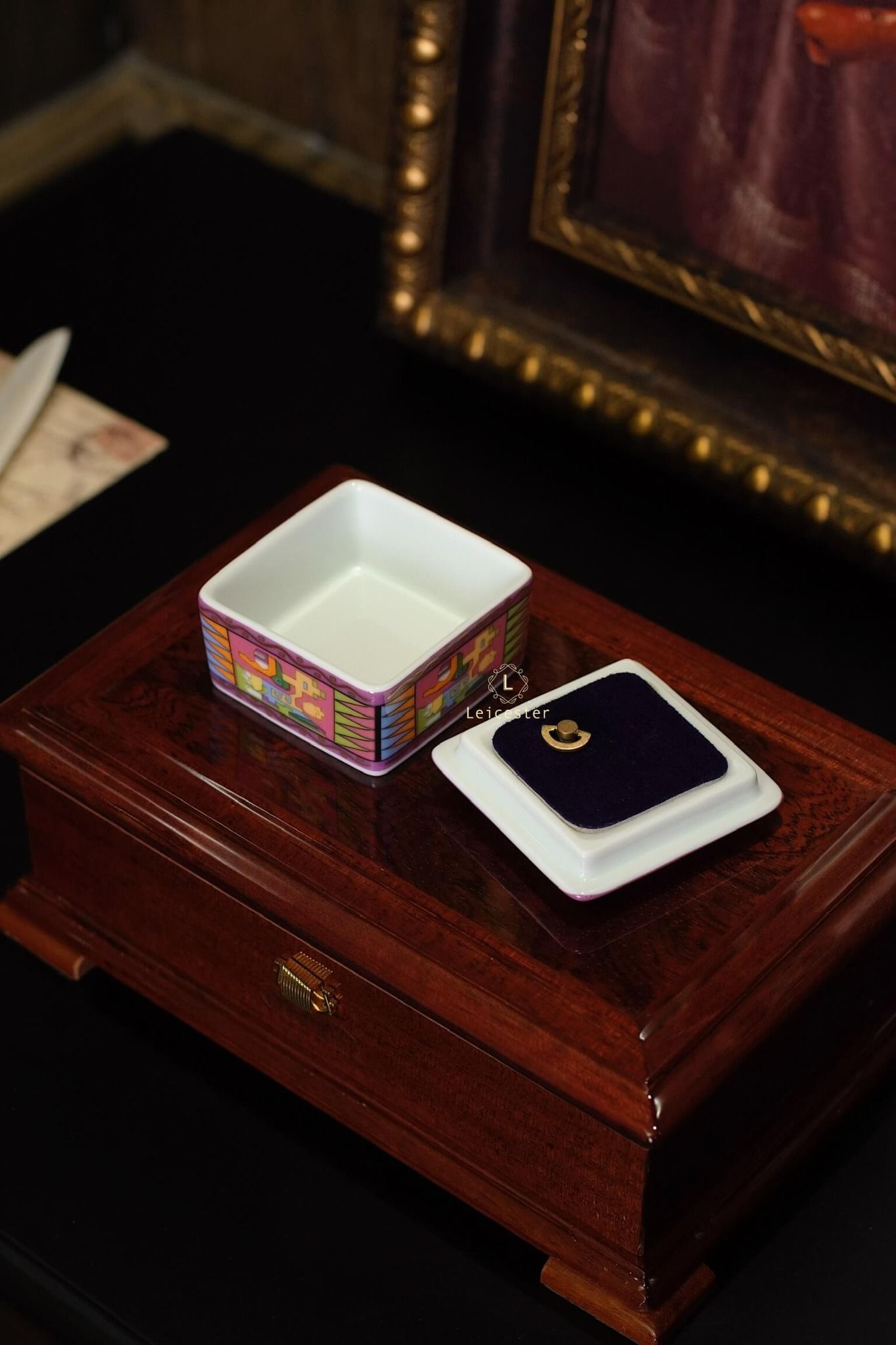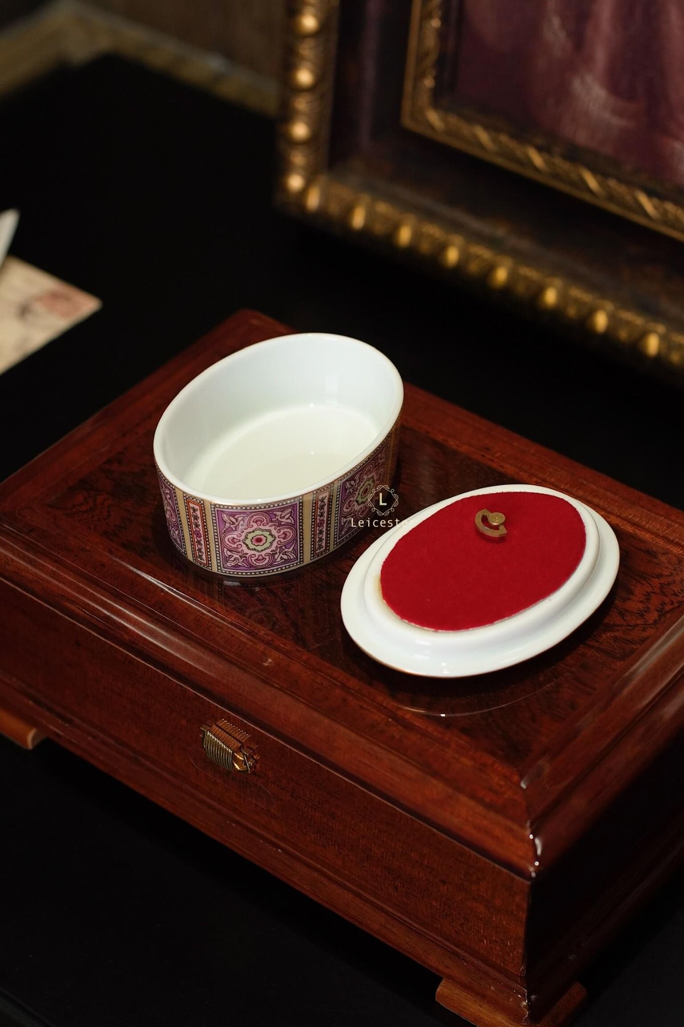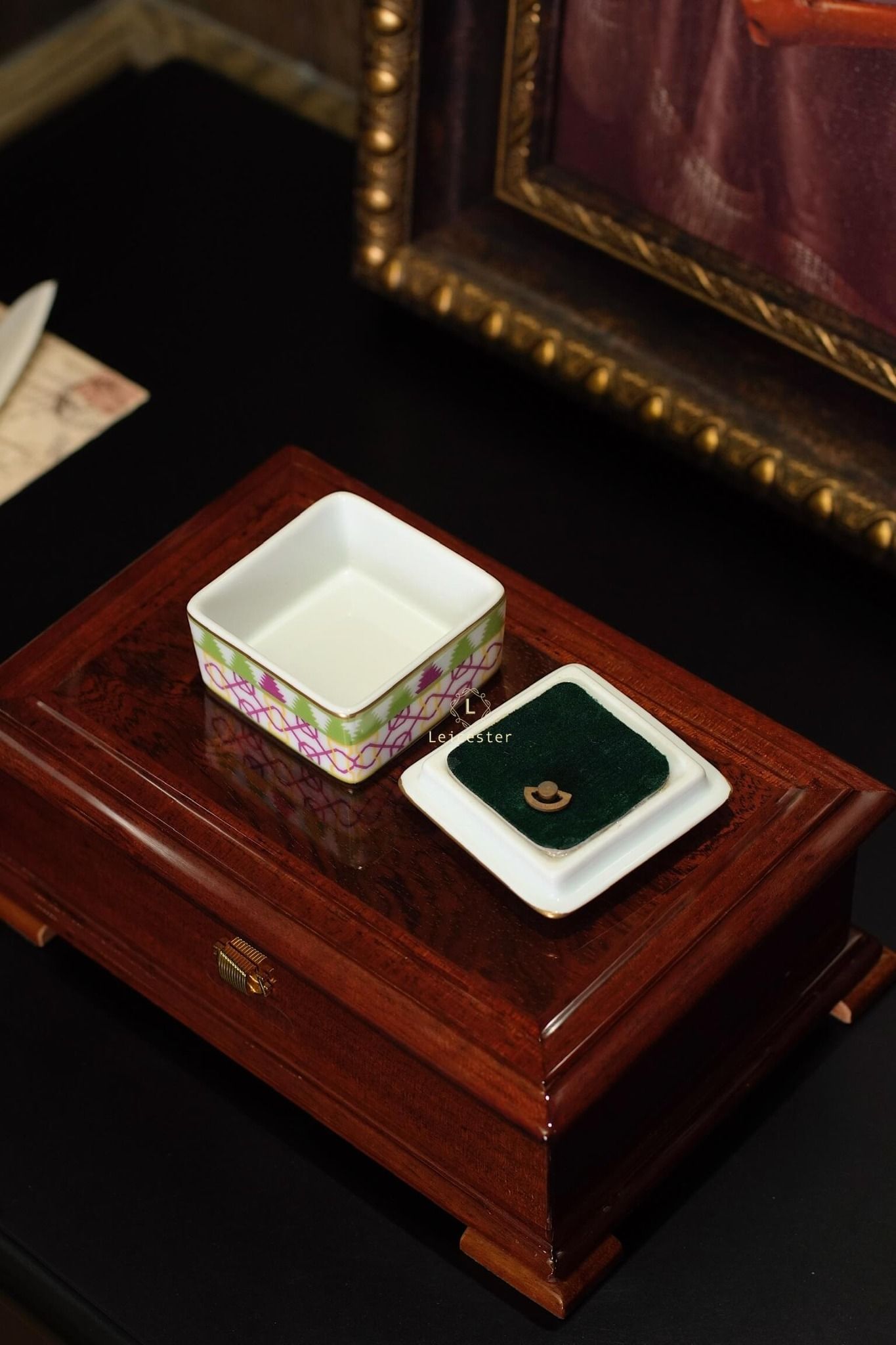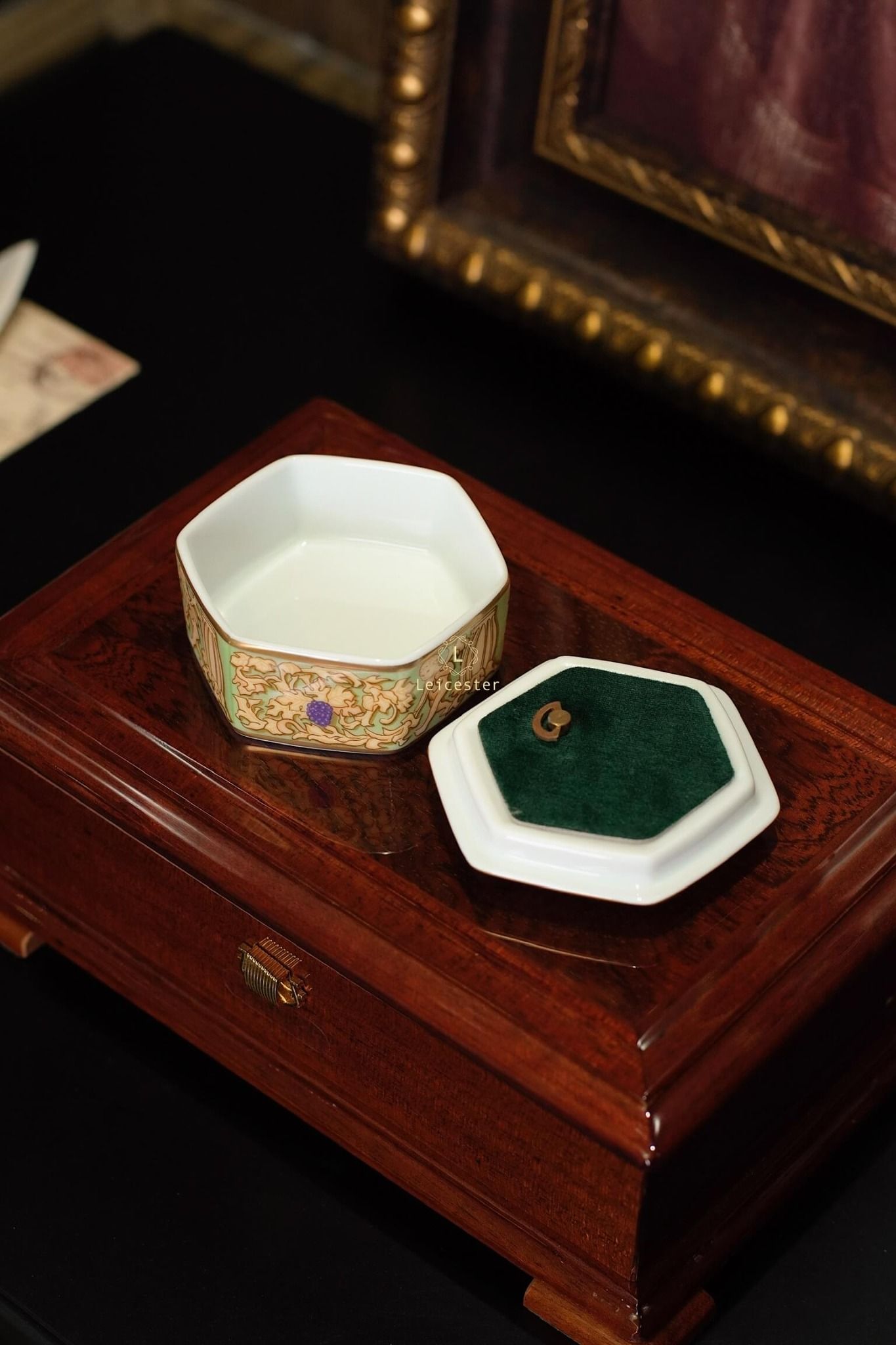 Chất liệu: hộp gỗ, mặt kính, lót nhung, hộp nhạc gốm sứ xương