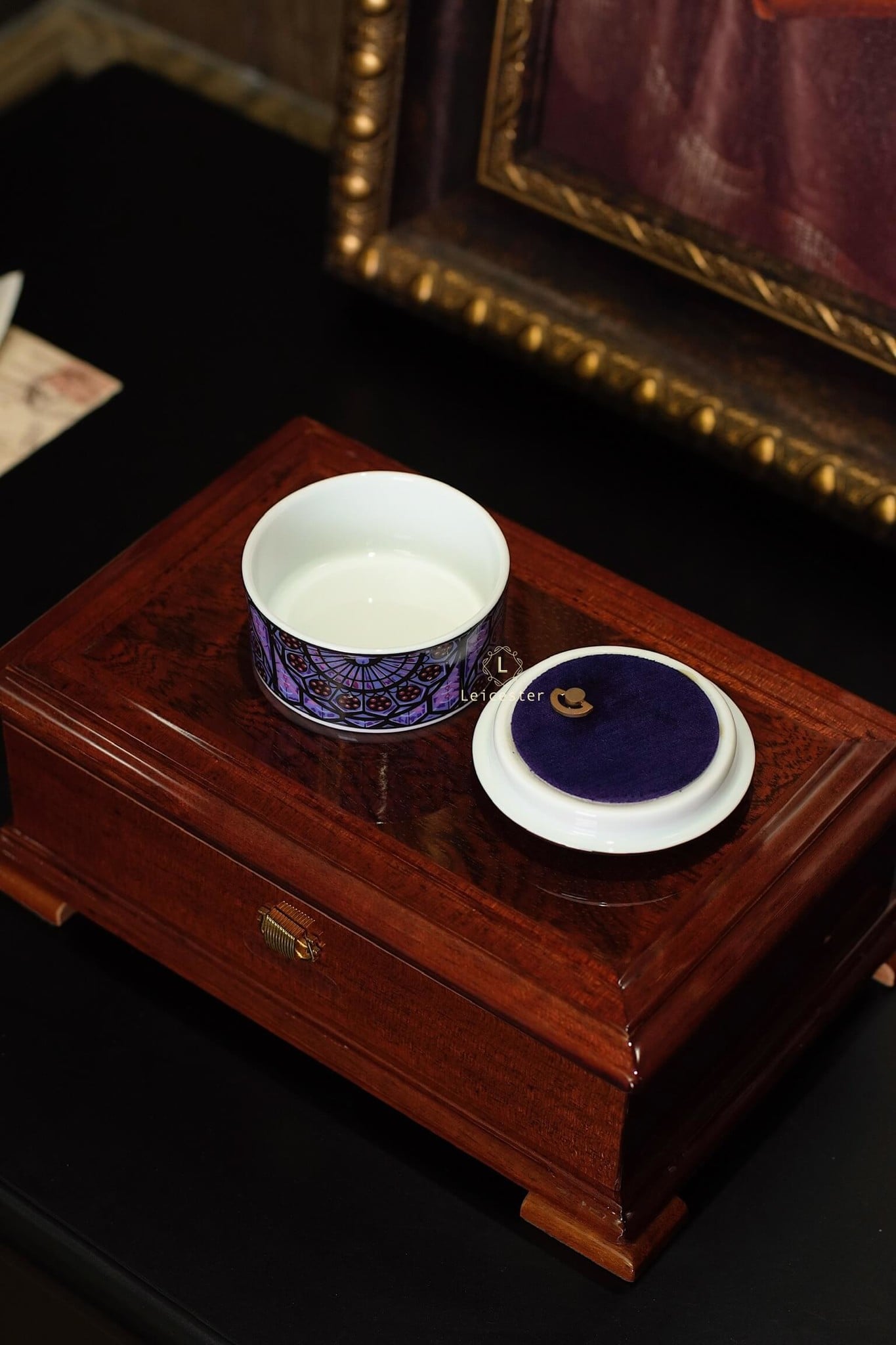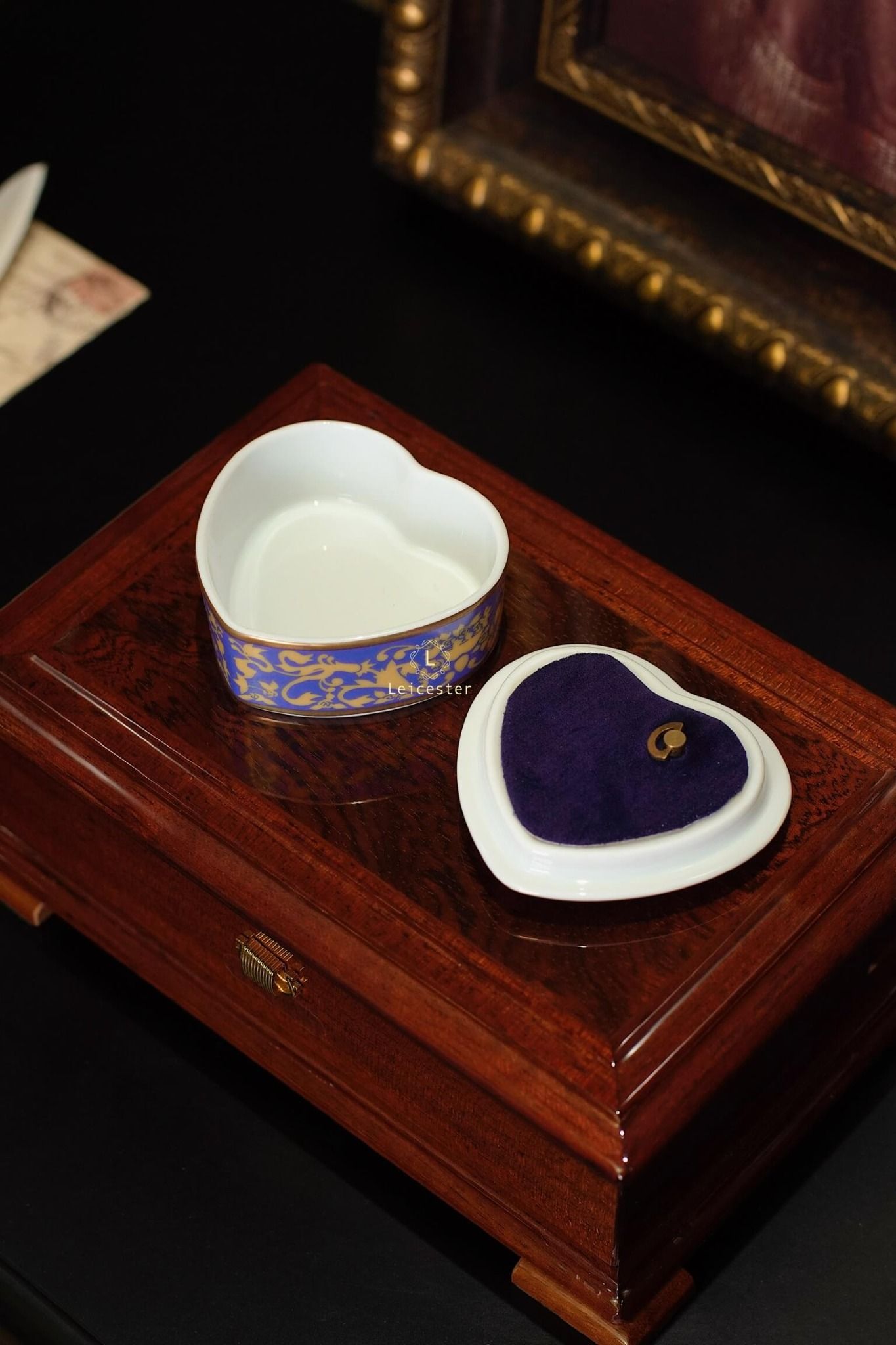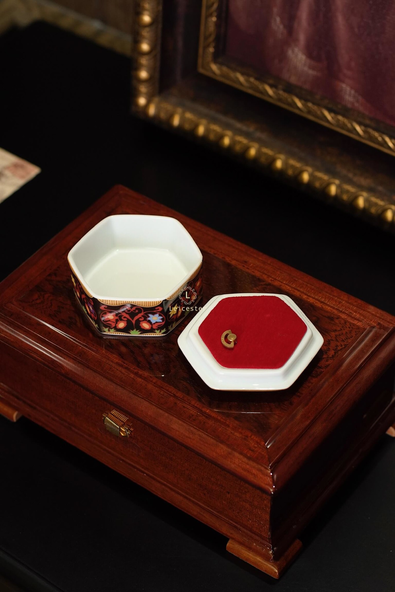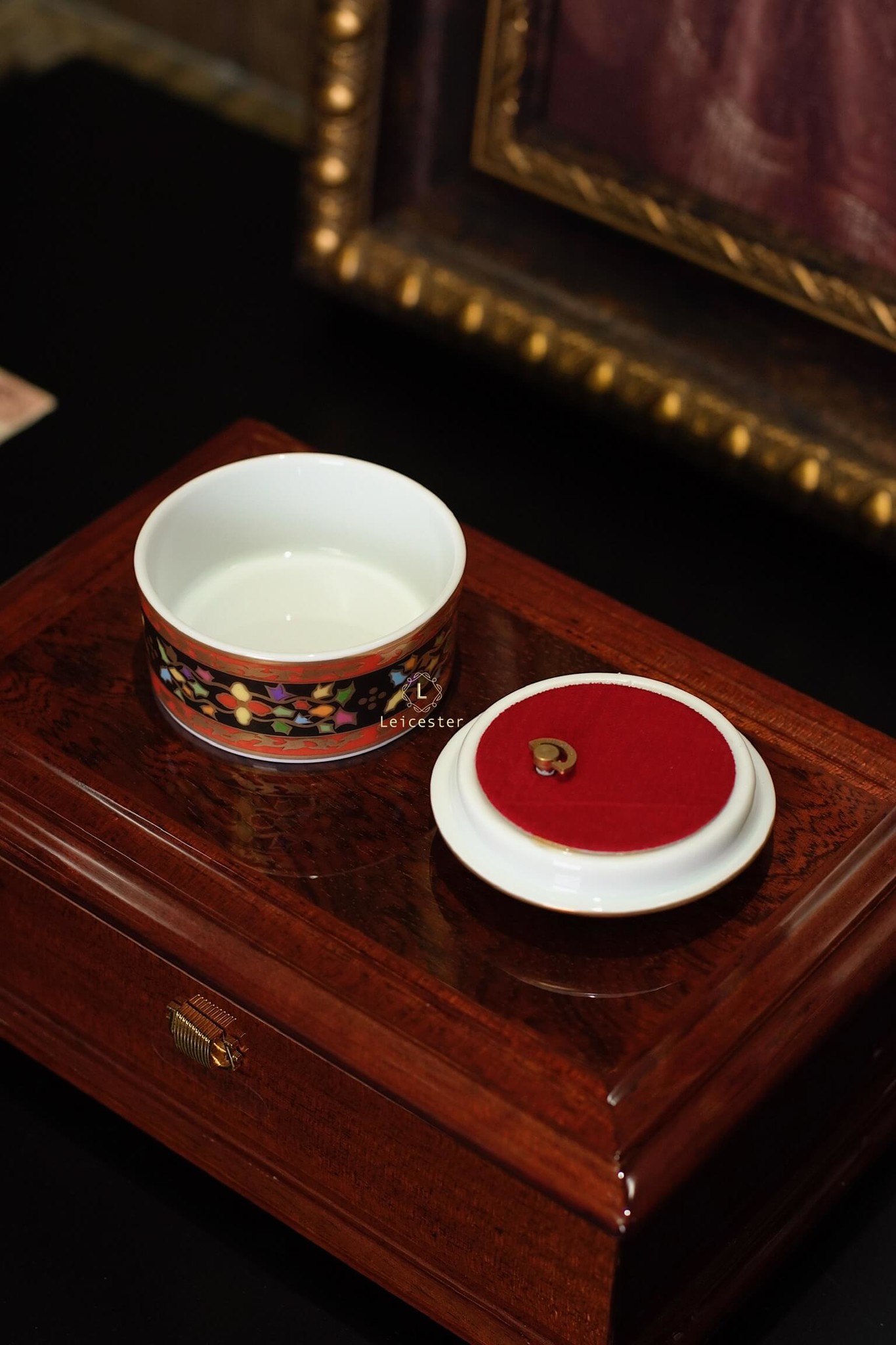 Chất liệu: hộp gỗ, mặt kính, lót nhung, hộp nhạc gốm sứ xương