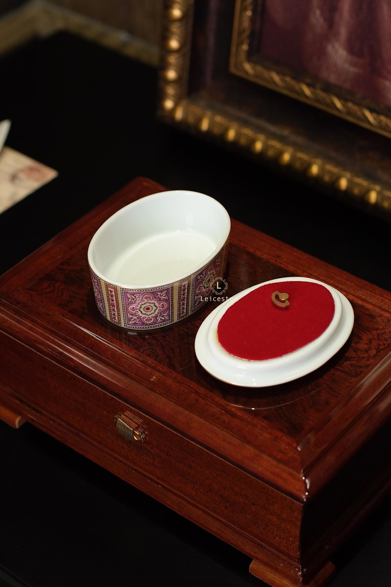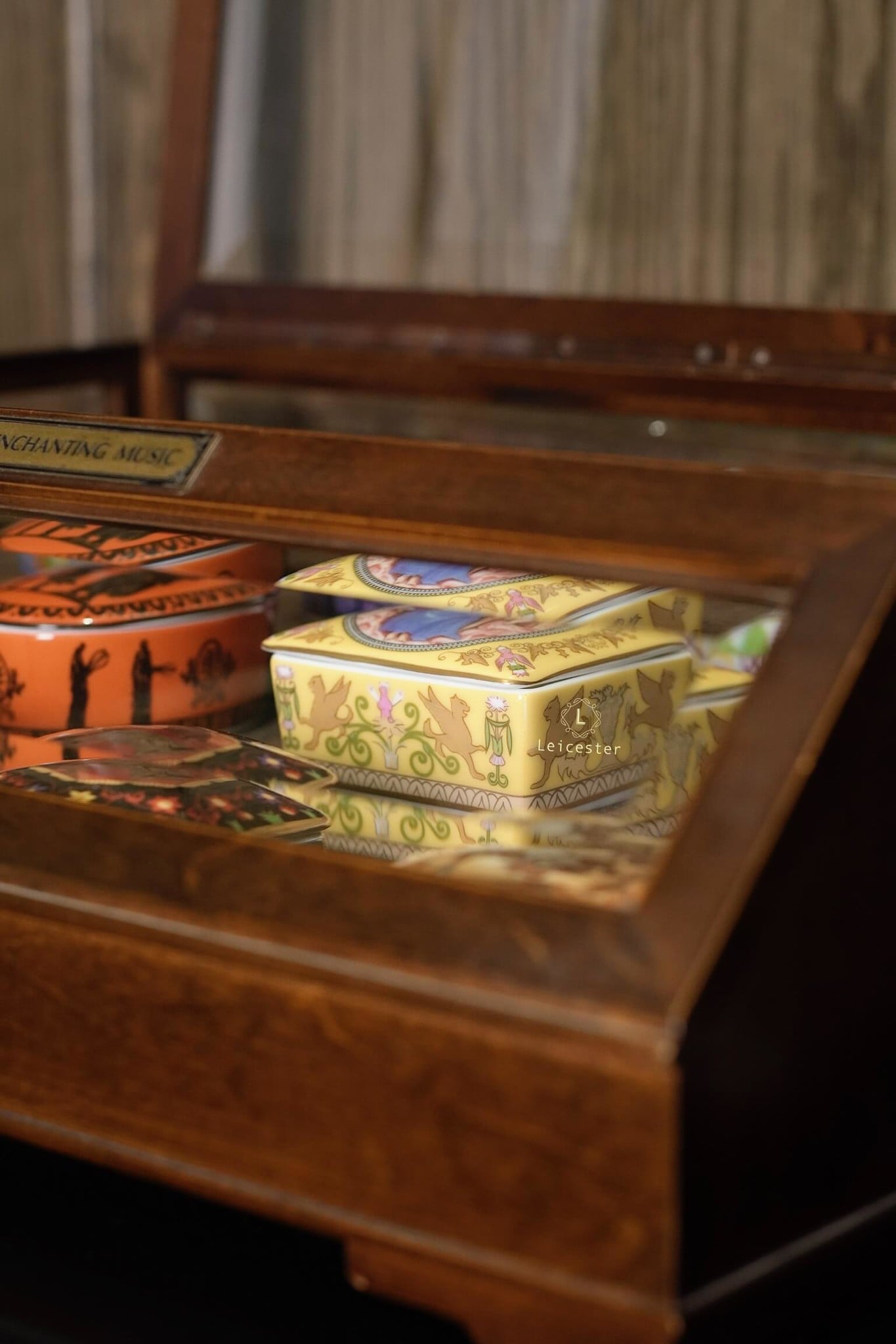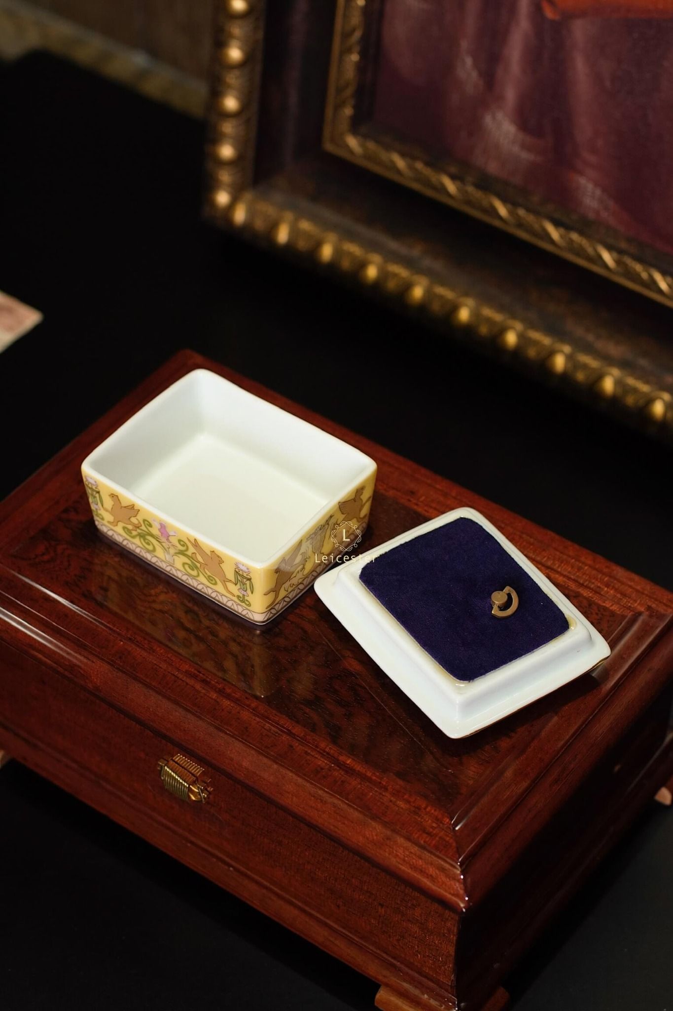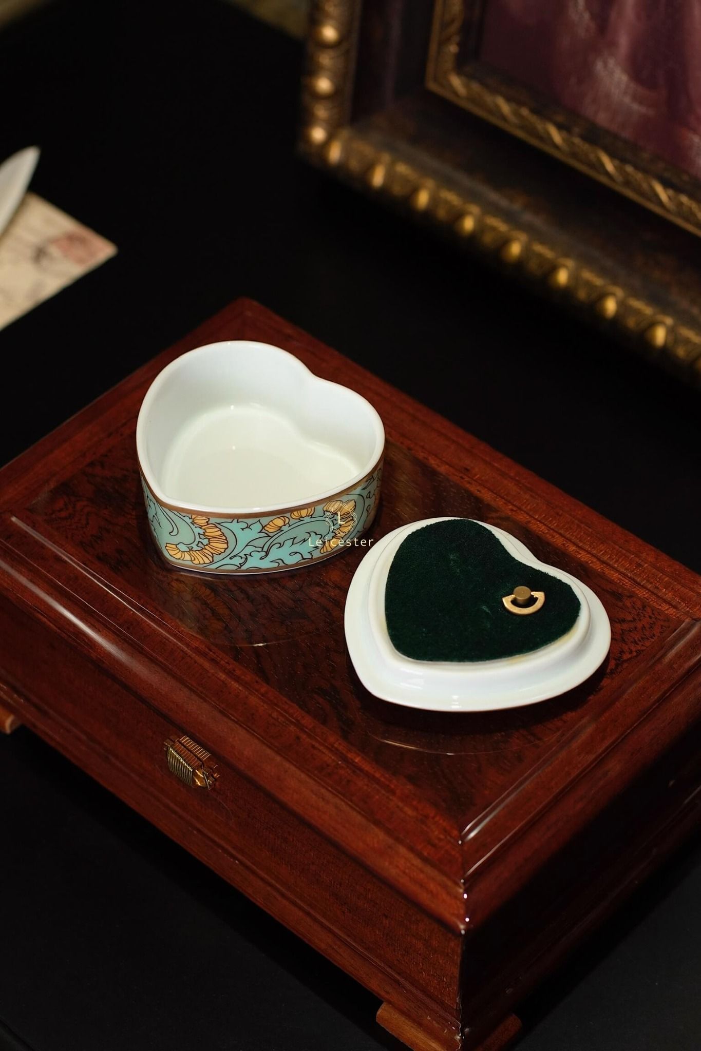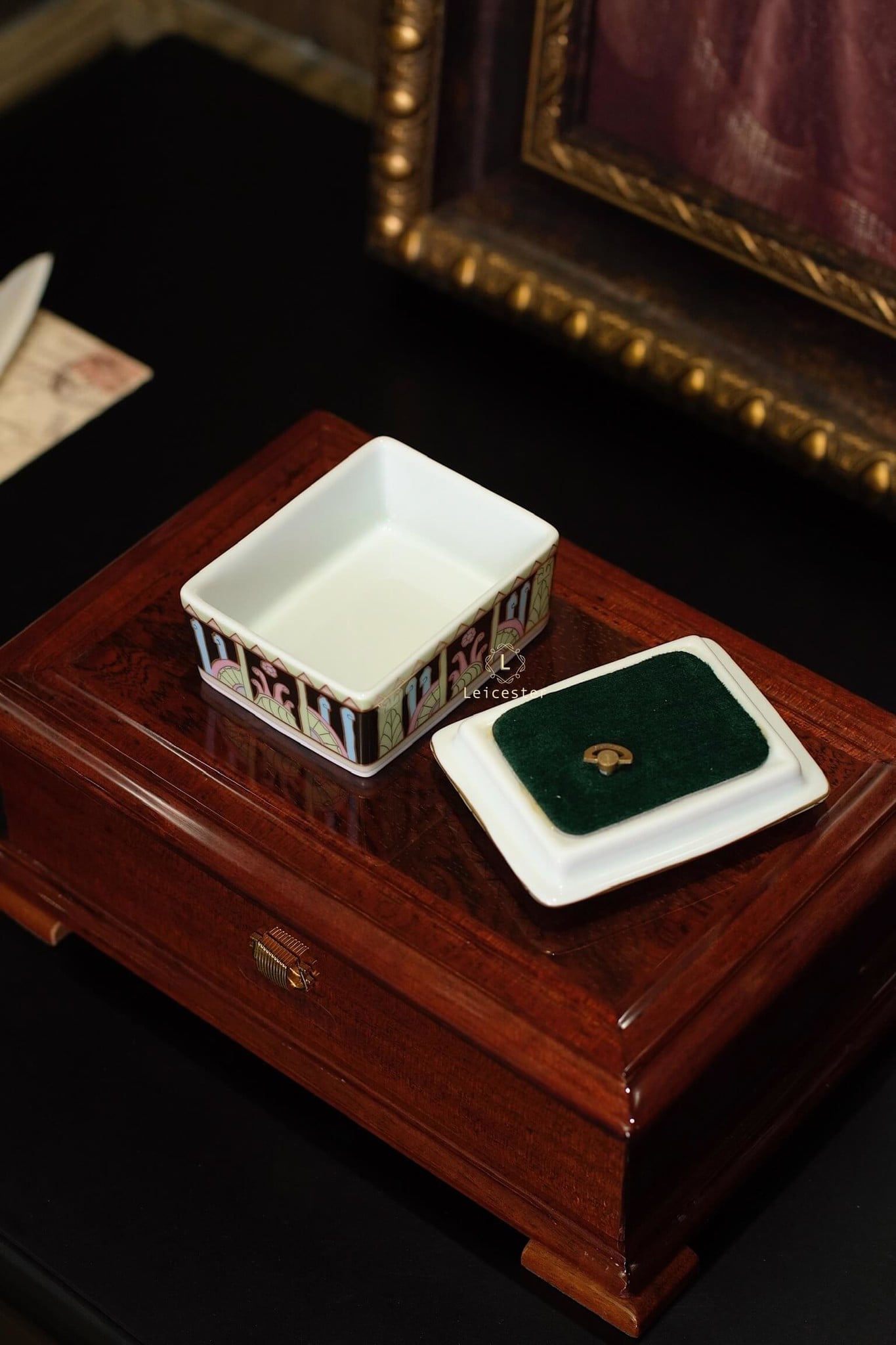 Chất liệu: hộp gỗ, mặt kính, lót nhung, hộp nhạc gốm sứ xương