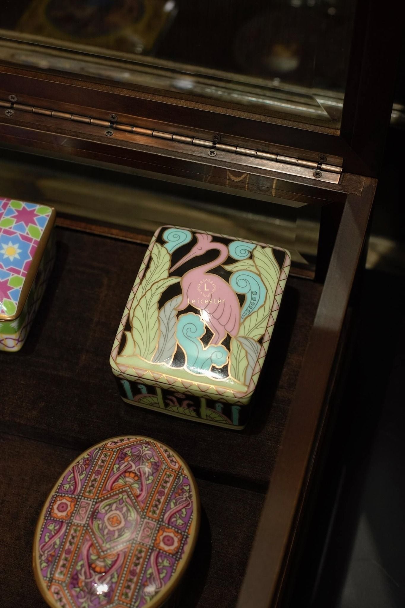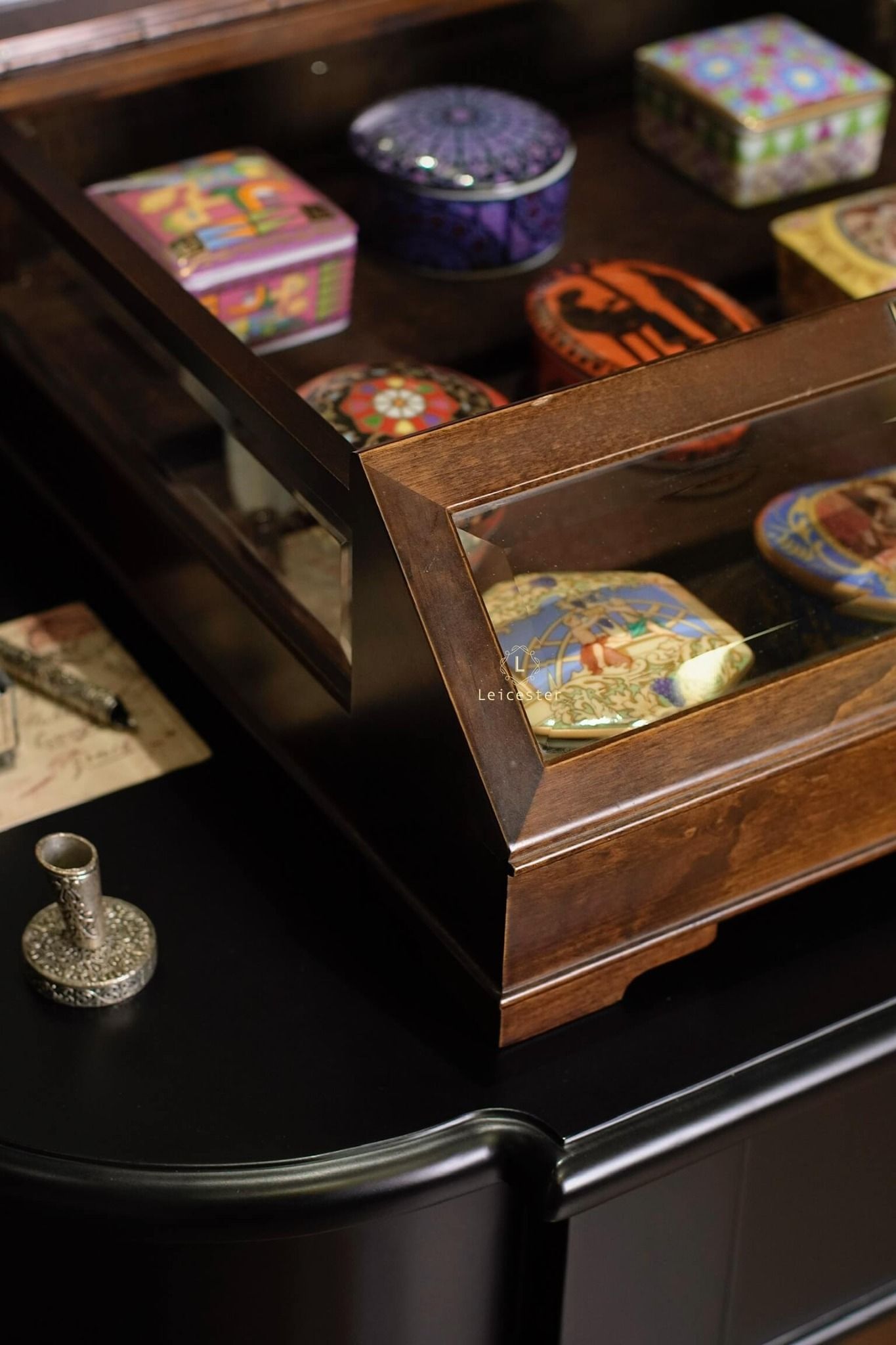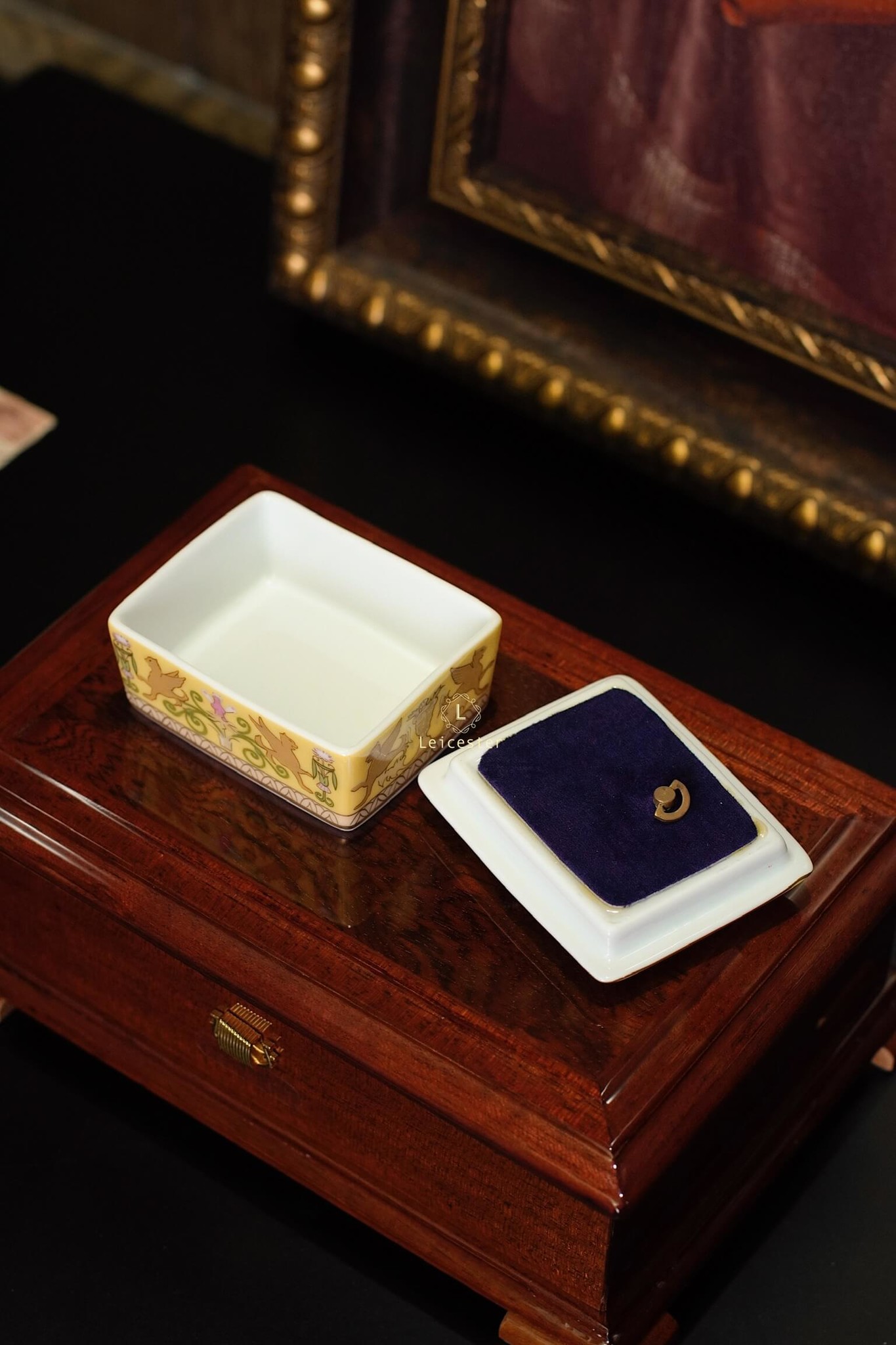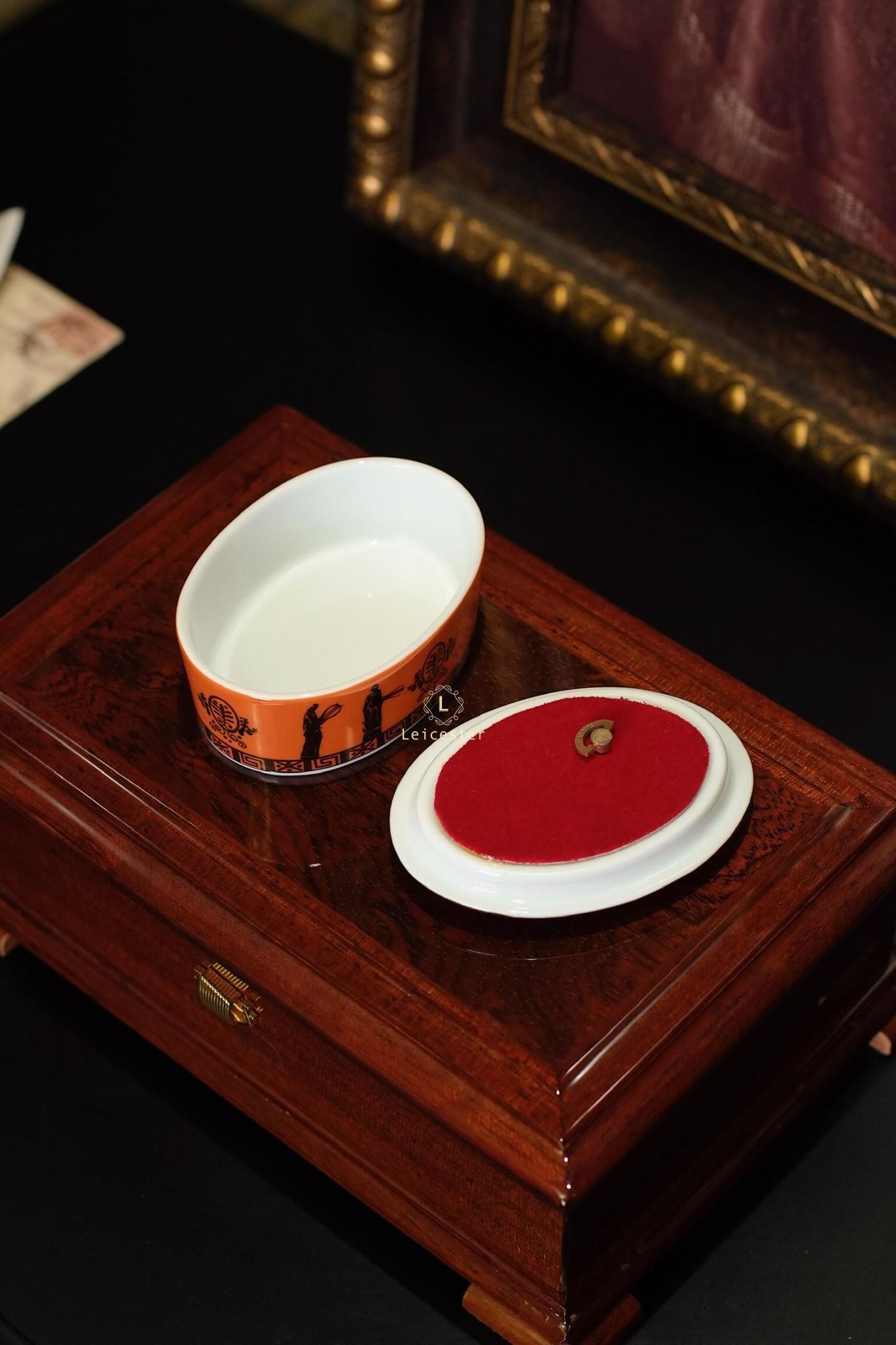 Chất liệu: hộp gỗ, mặt kính, lót nhung, hộp nhạc gốm sứ xương