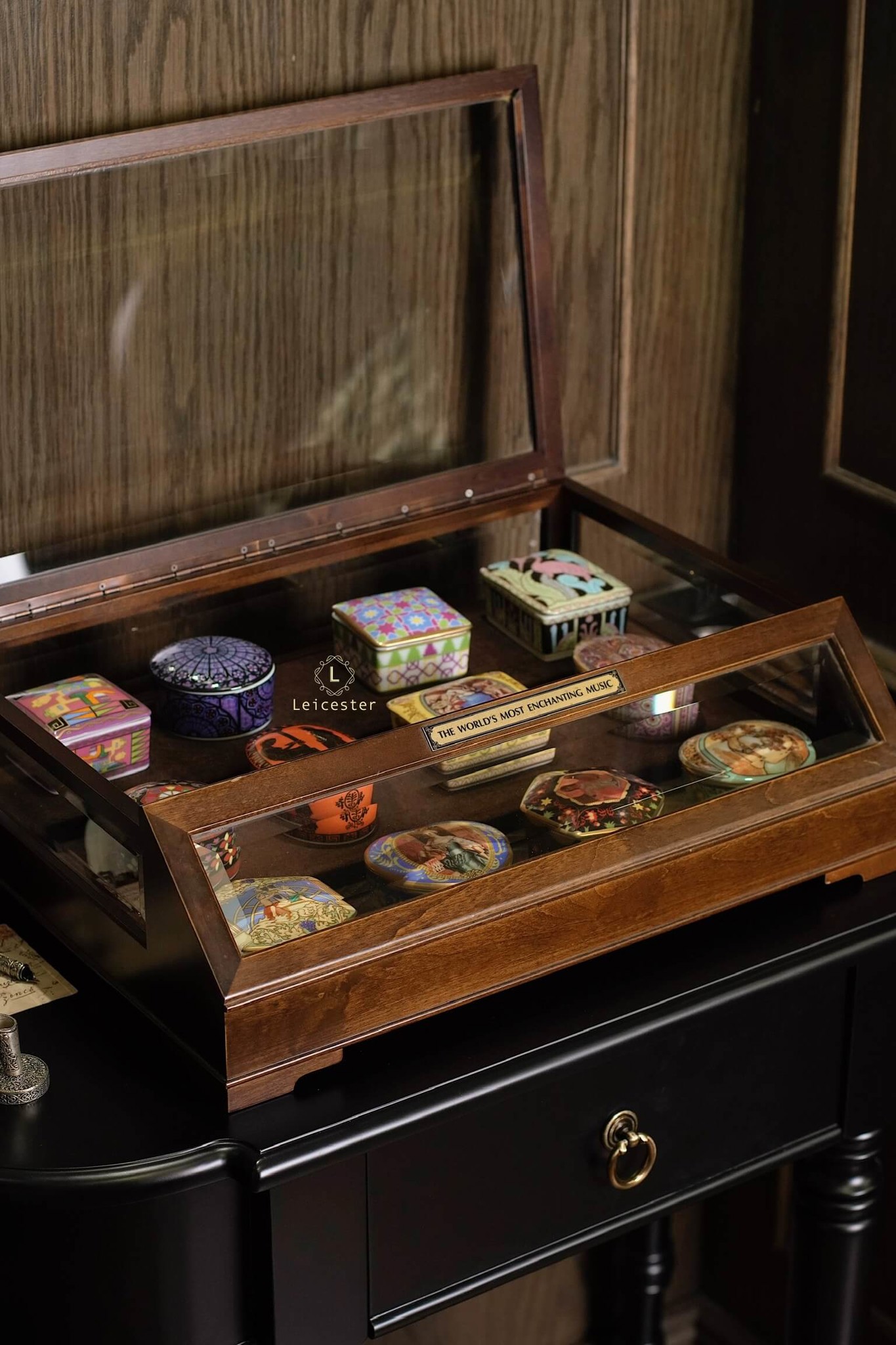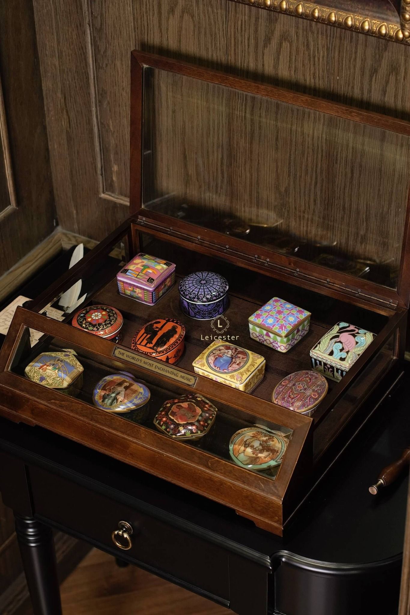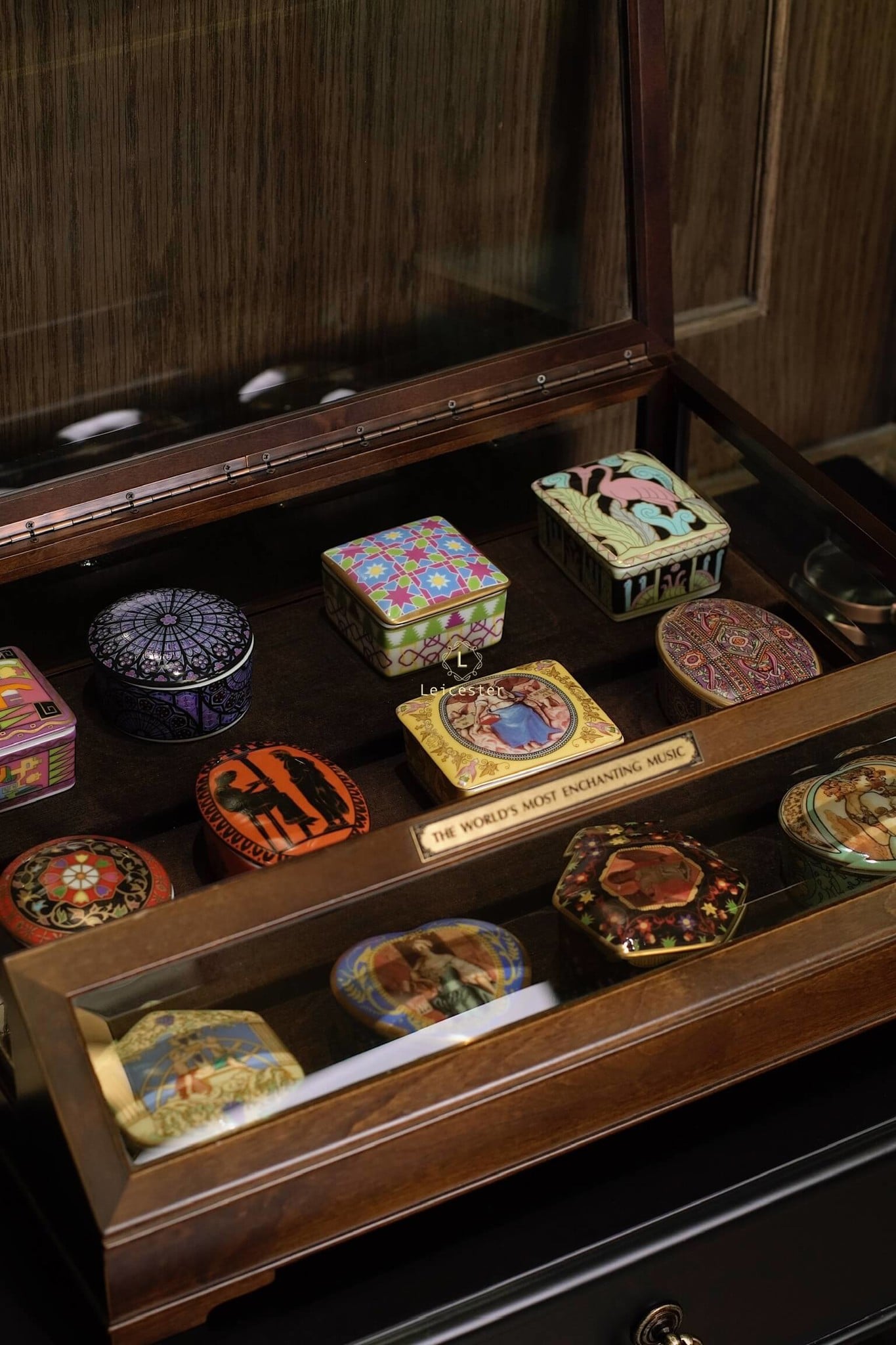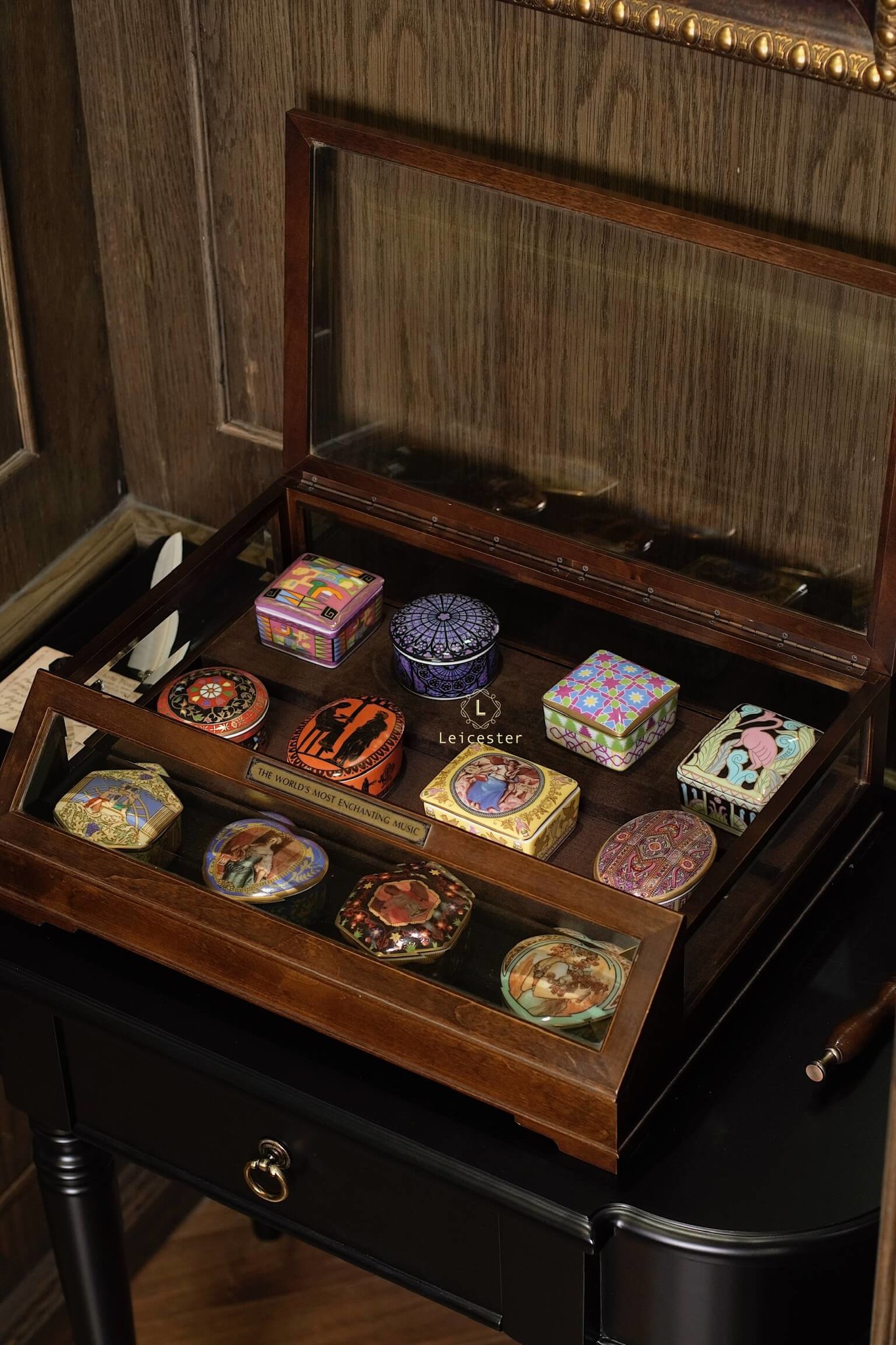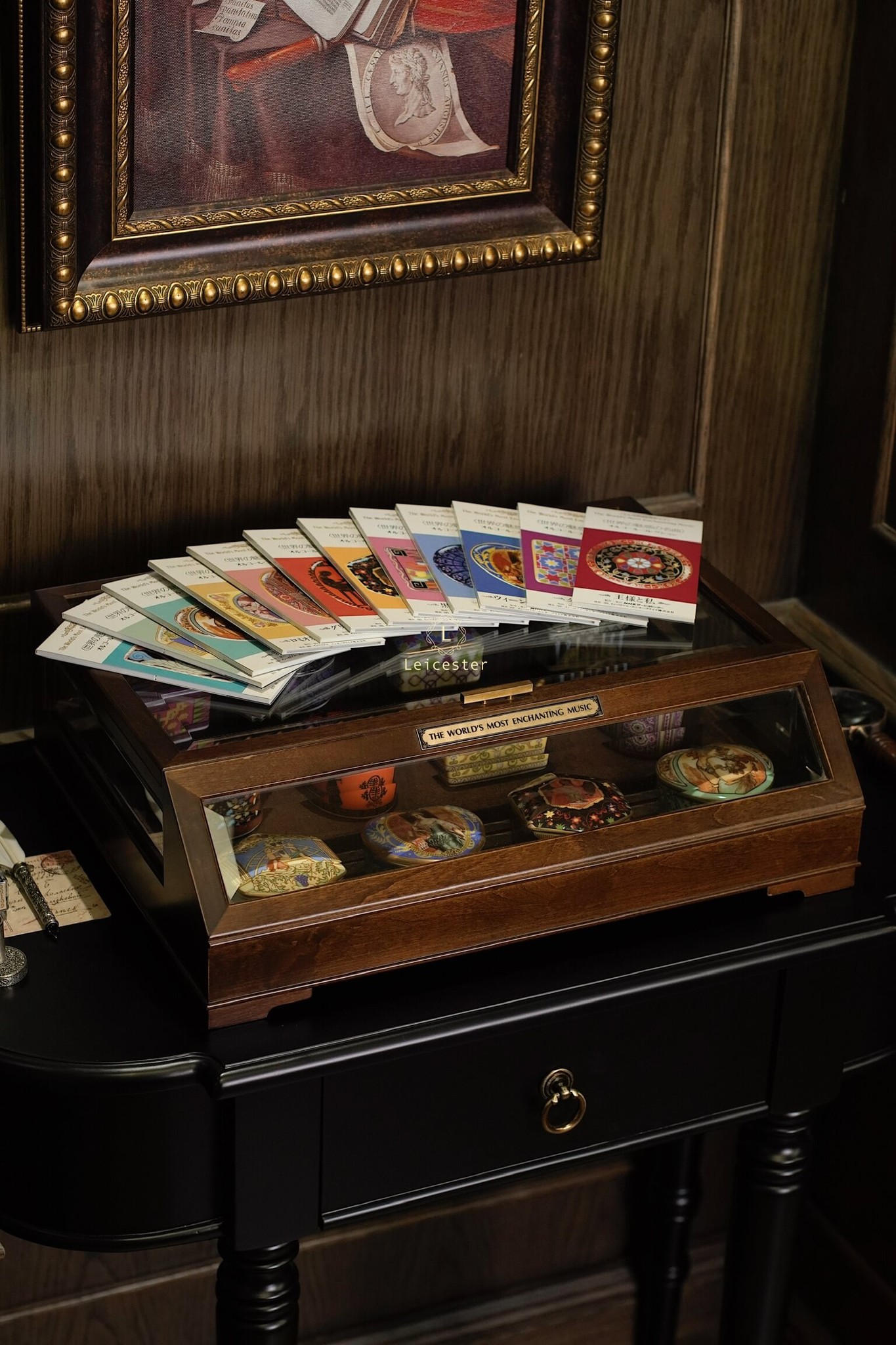 The World’s Most Enchanting Music gồm 12 hộp nhạc được xếp gọn gàng trong một tủ kính, mỗi hộp là 1 bản nhạc kèm theo 12 certificate và đĩa CD của từng bản nhạc đó.