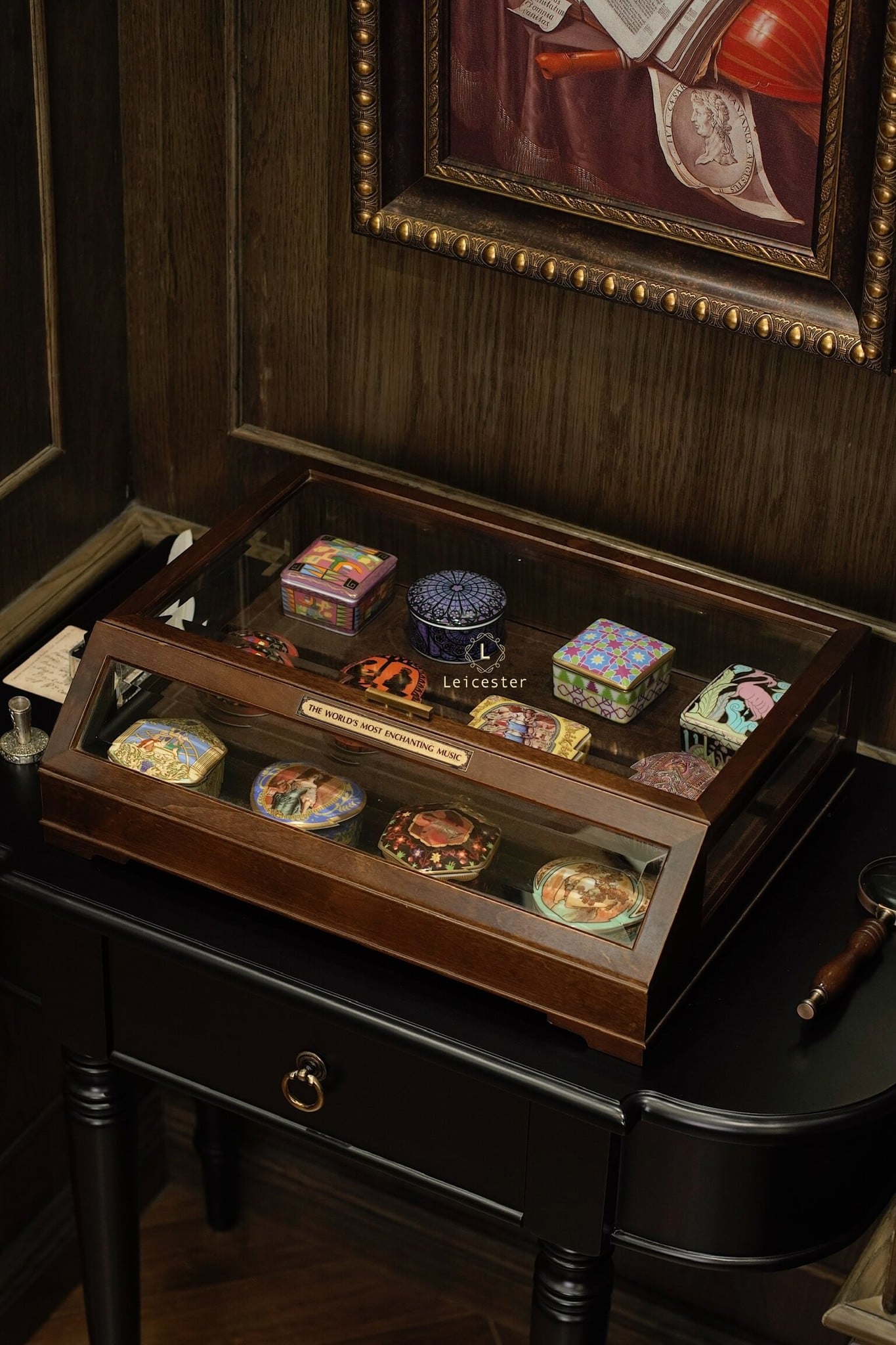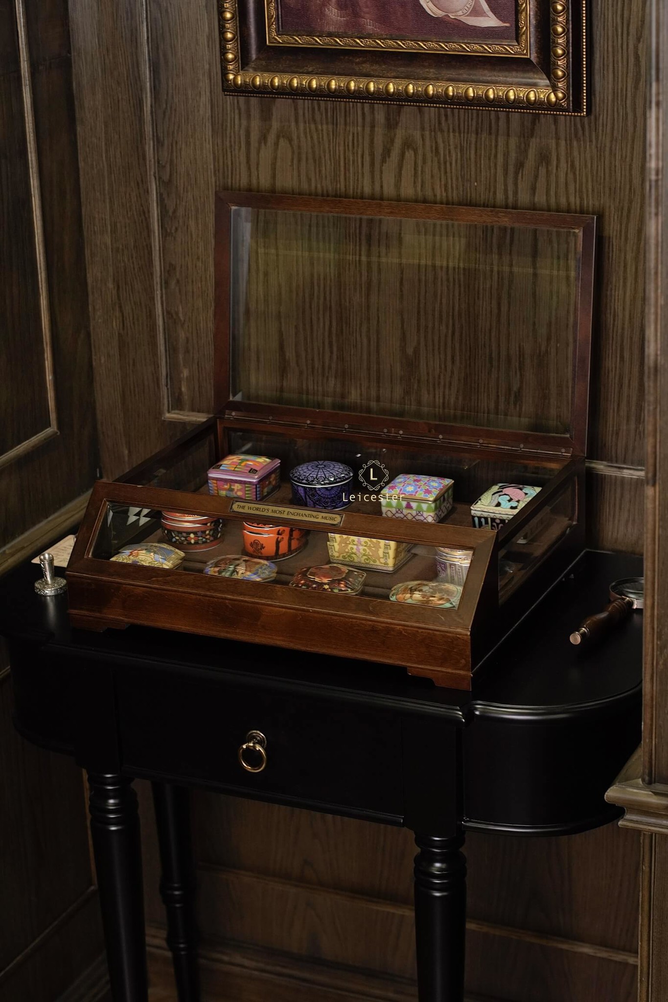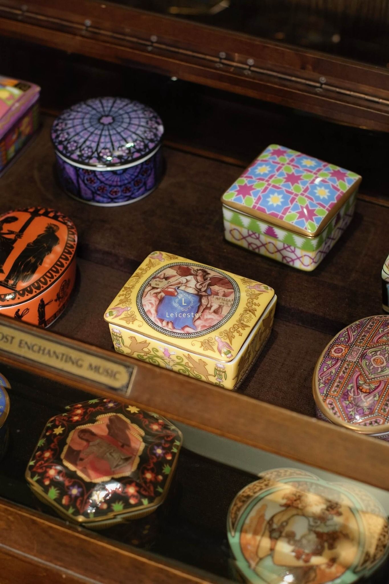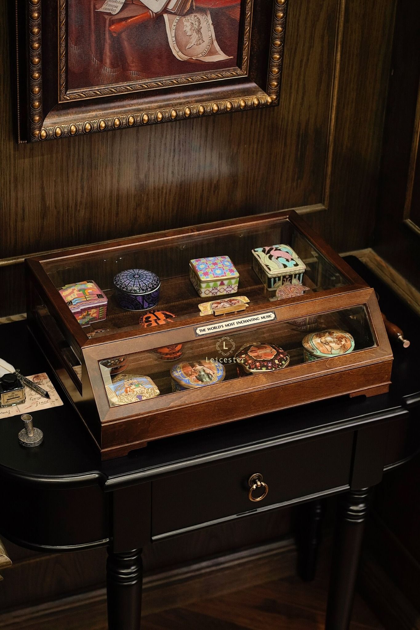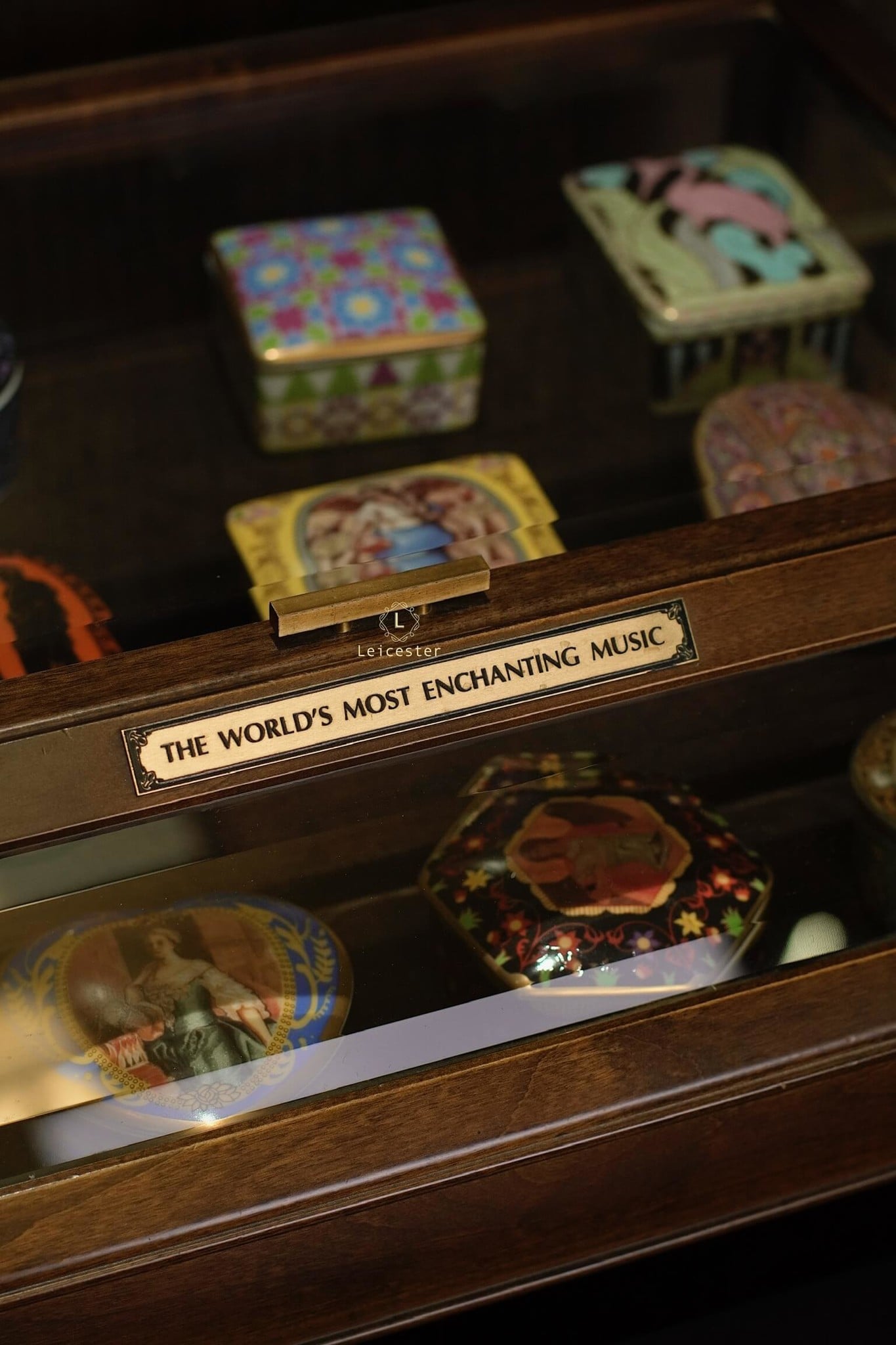 The World’s Most Enchanting Music gồm 12 hộp nhạc được xếp gọn gàng trong một tủ kính, mỗi hộp là 1 bản nhạc kèm theo 12 certificate và đĩa CD của từng bản nhạc đó.