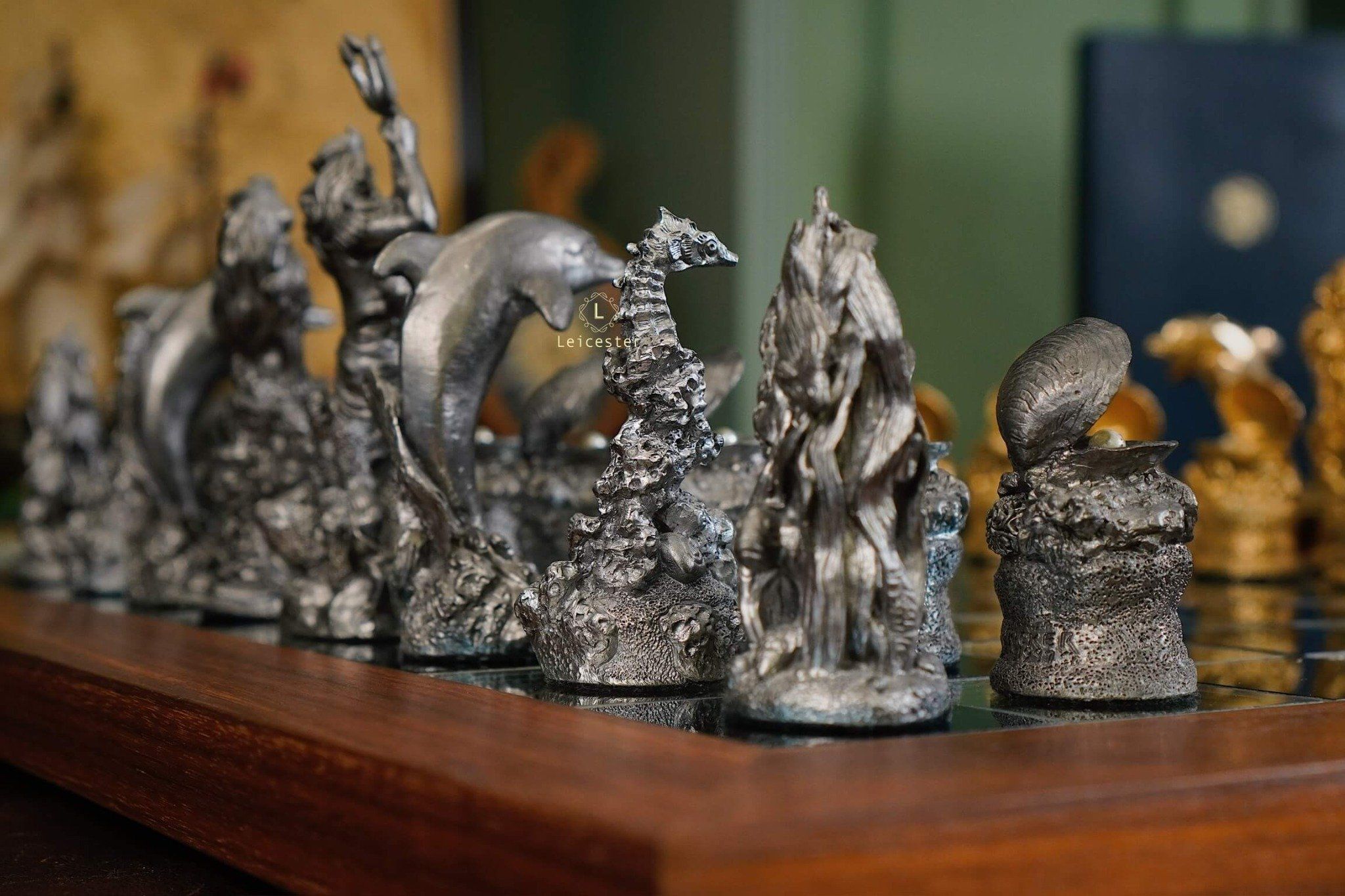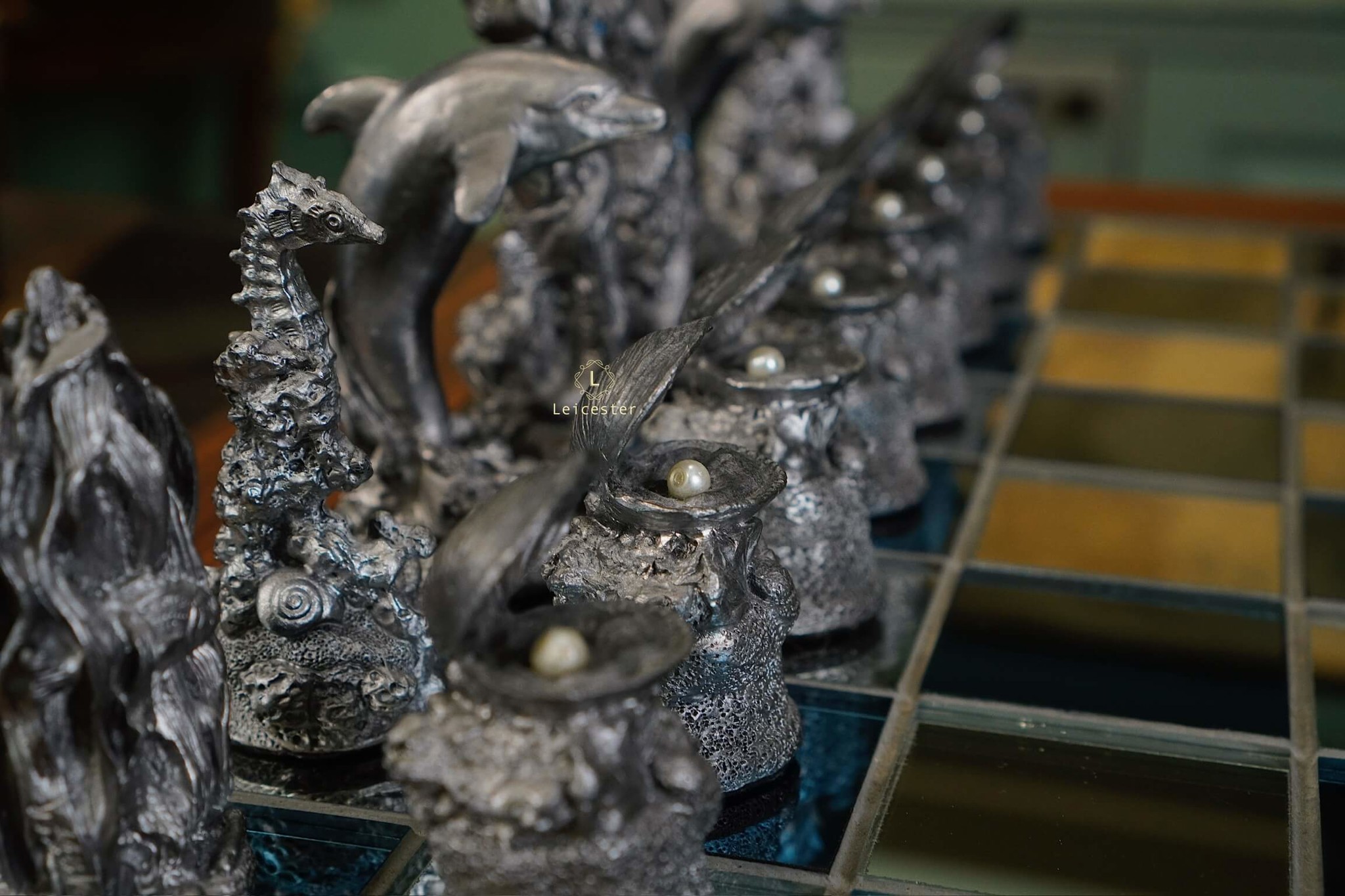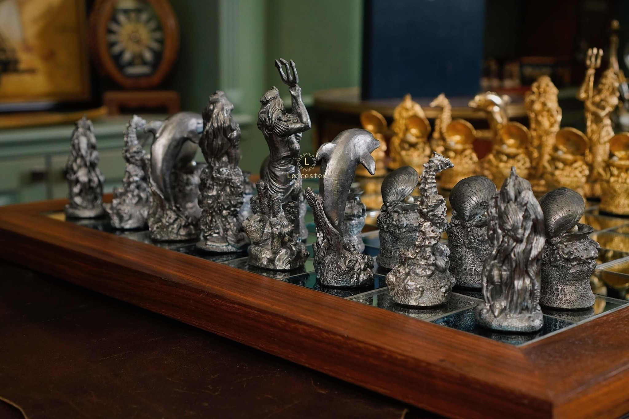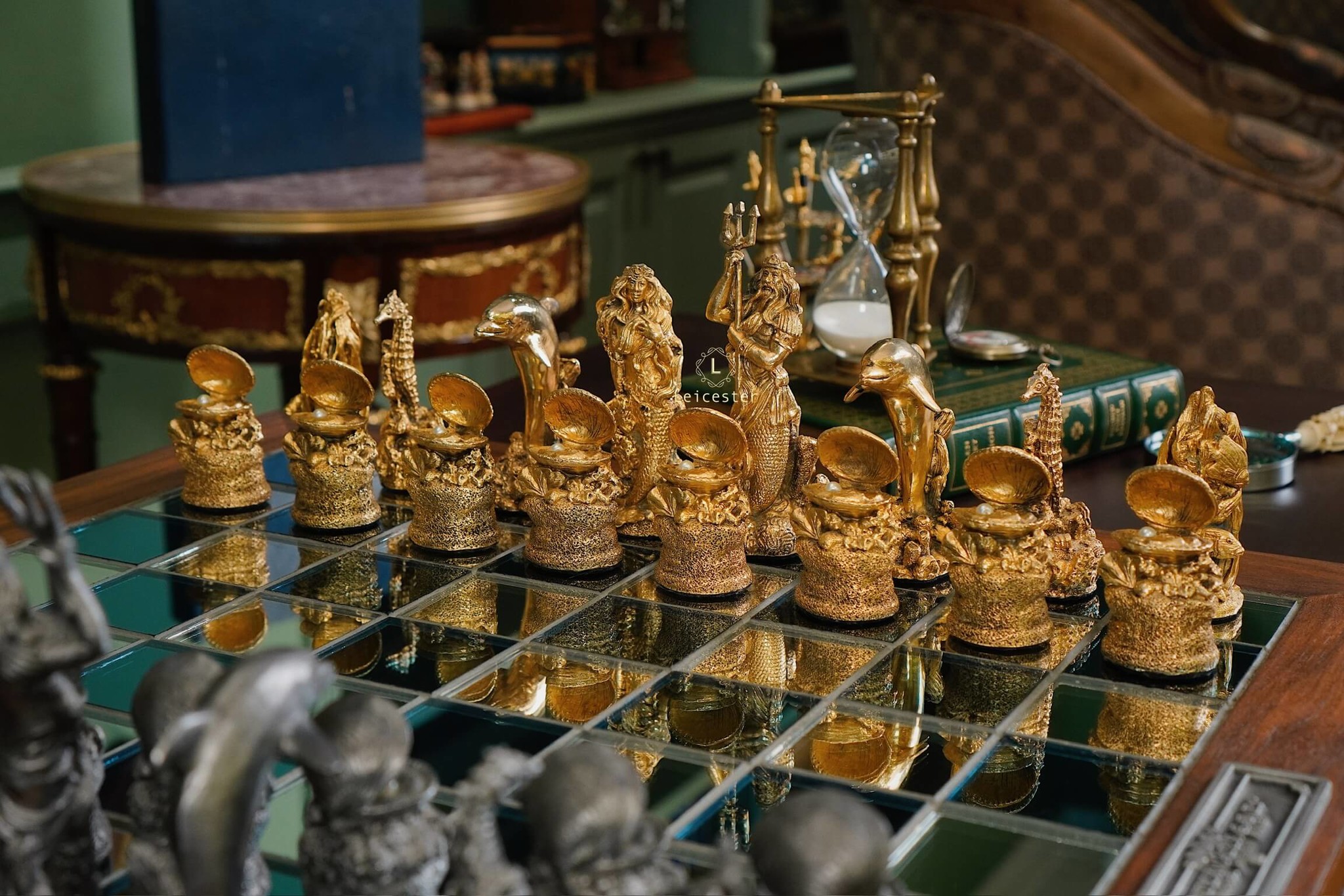 - Quân cờ: thiếc nguyên khối mạ vàng, đính đá, ngọc trai