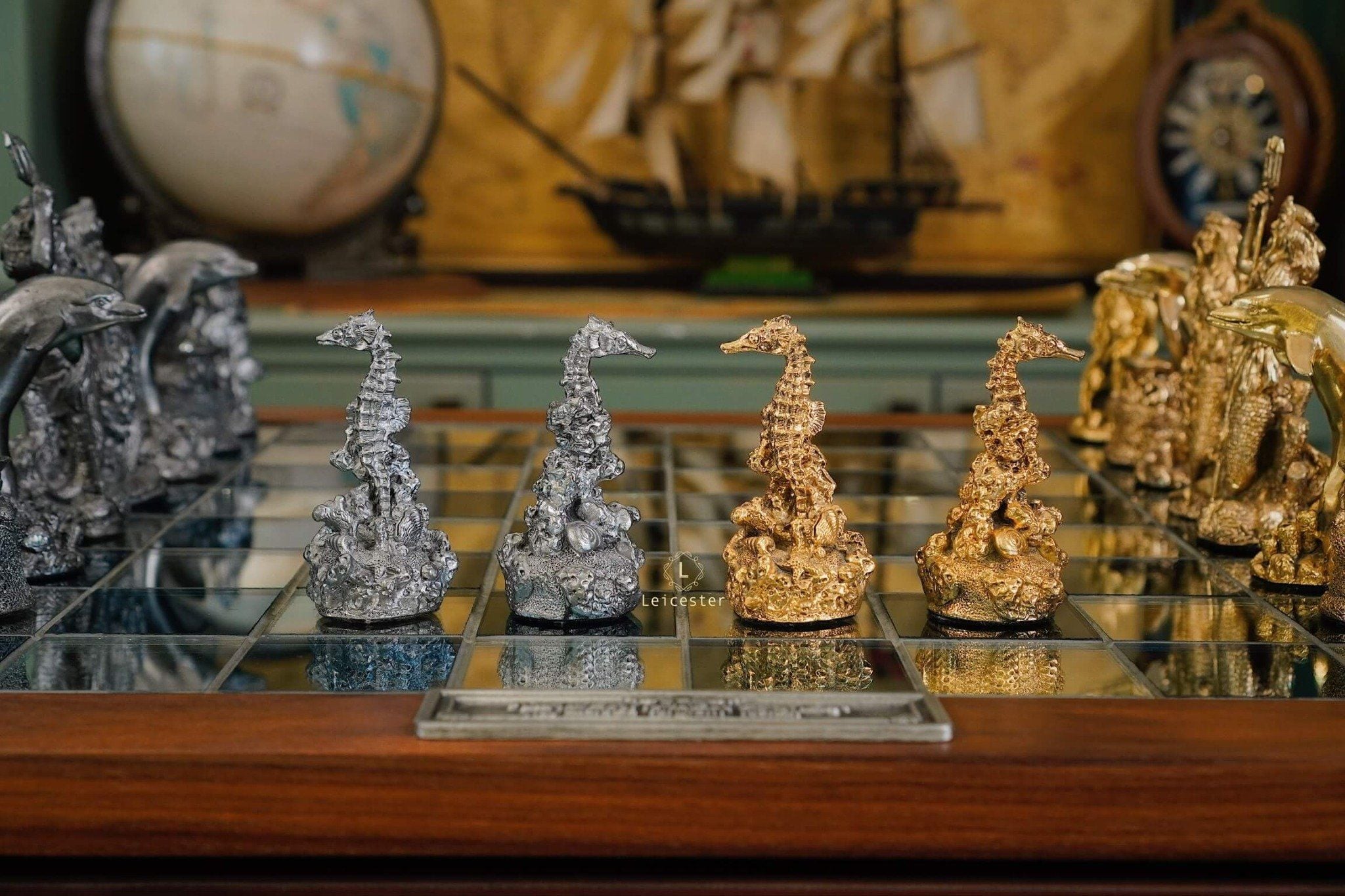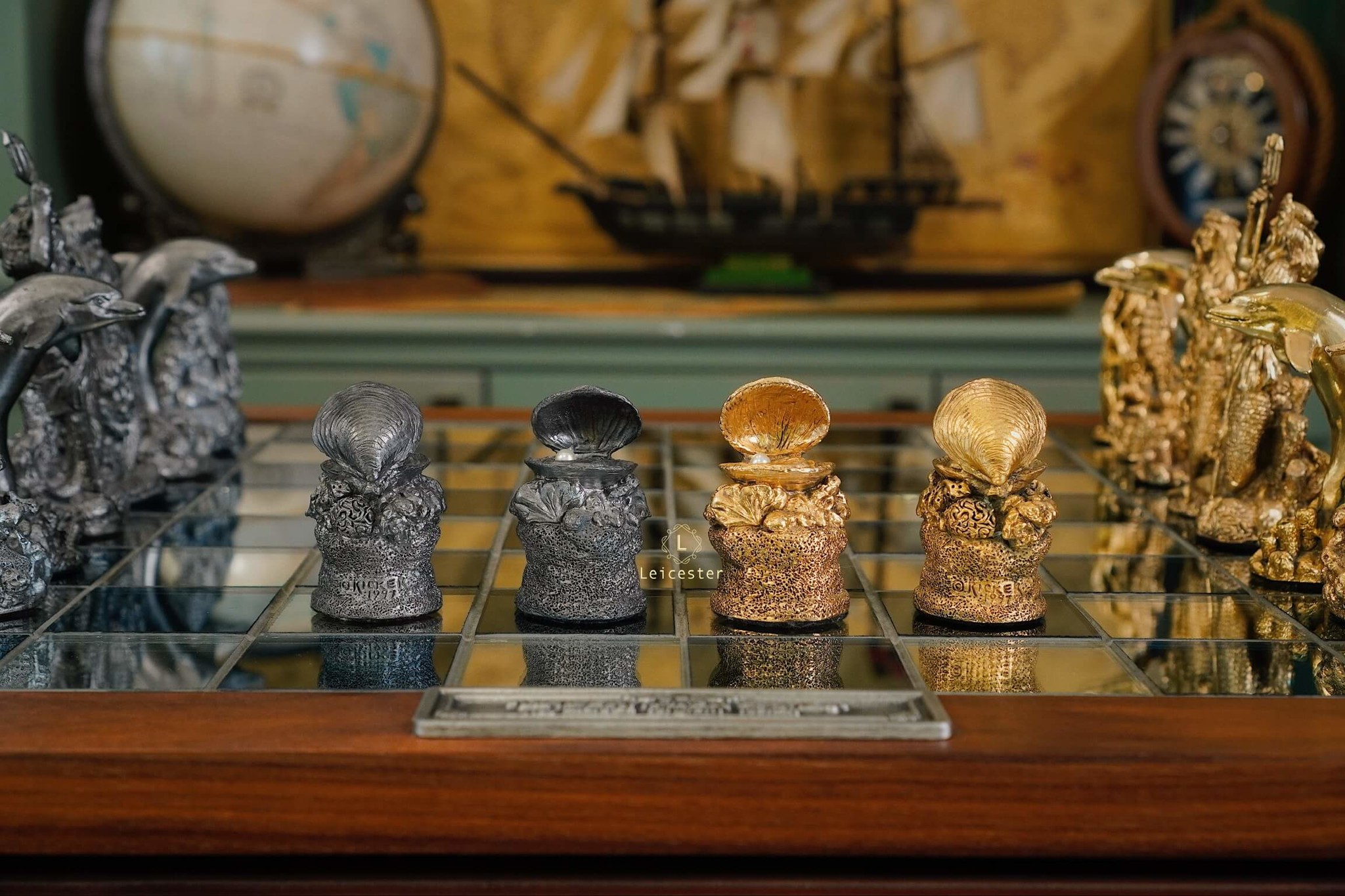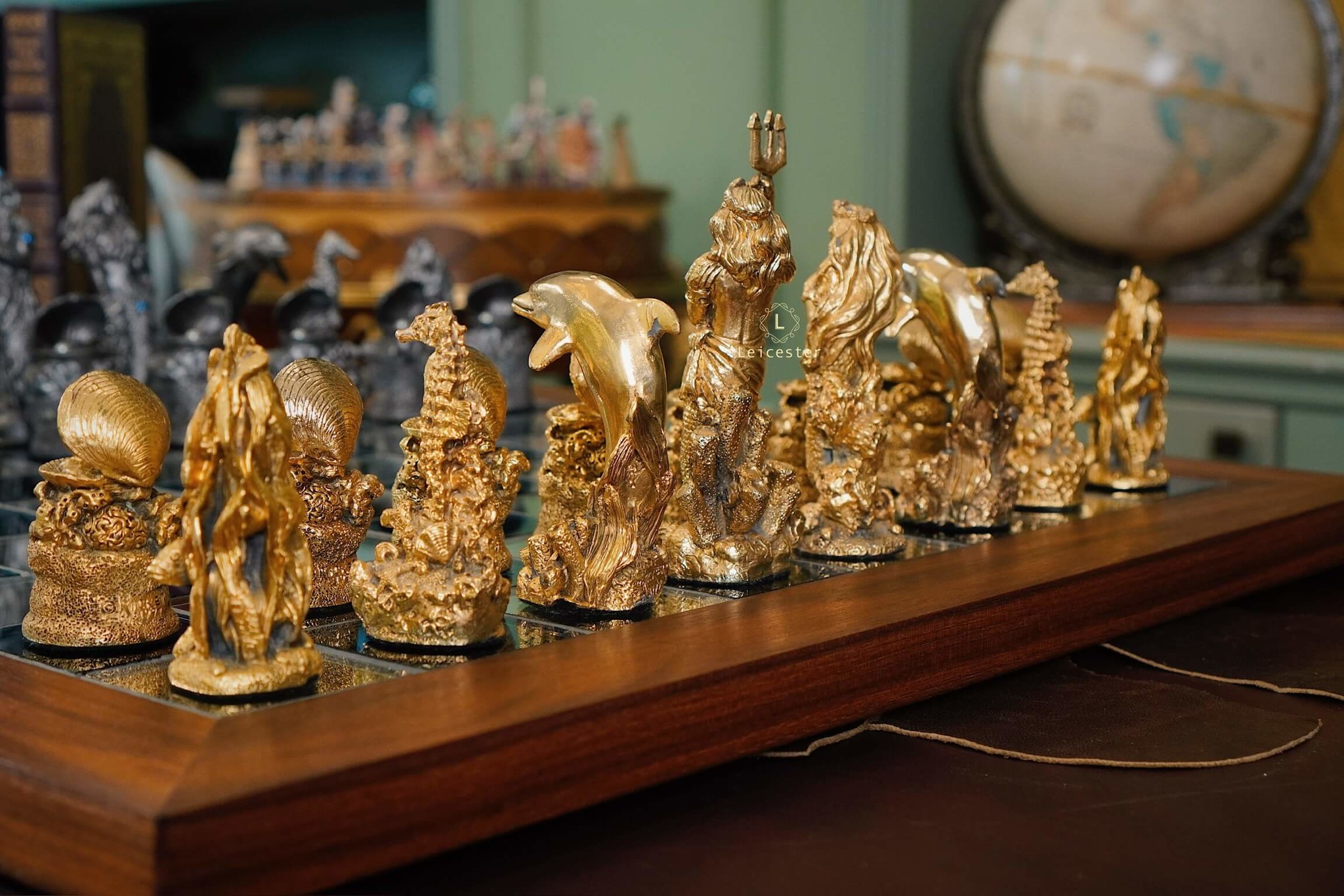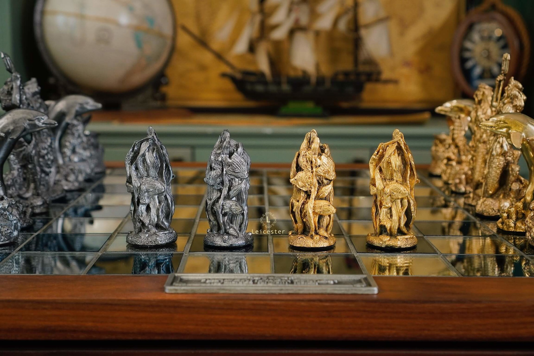 - Quân cờ: thiếc nguyên khối mạ vàng, đính đá, ngọc trai
