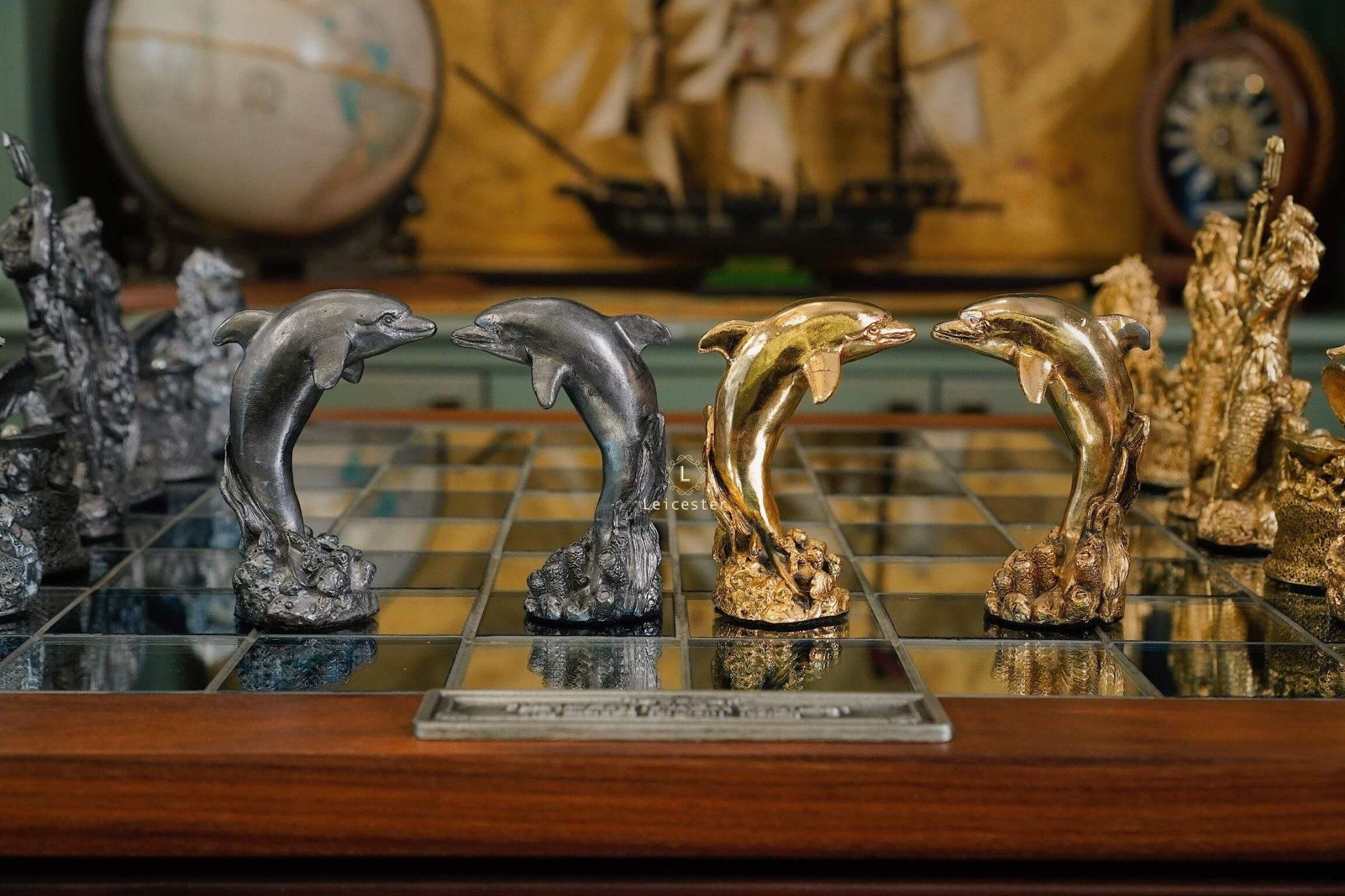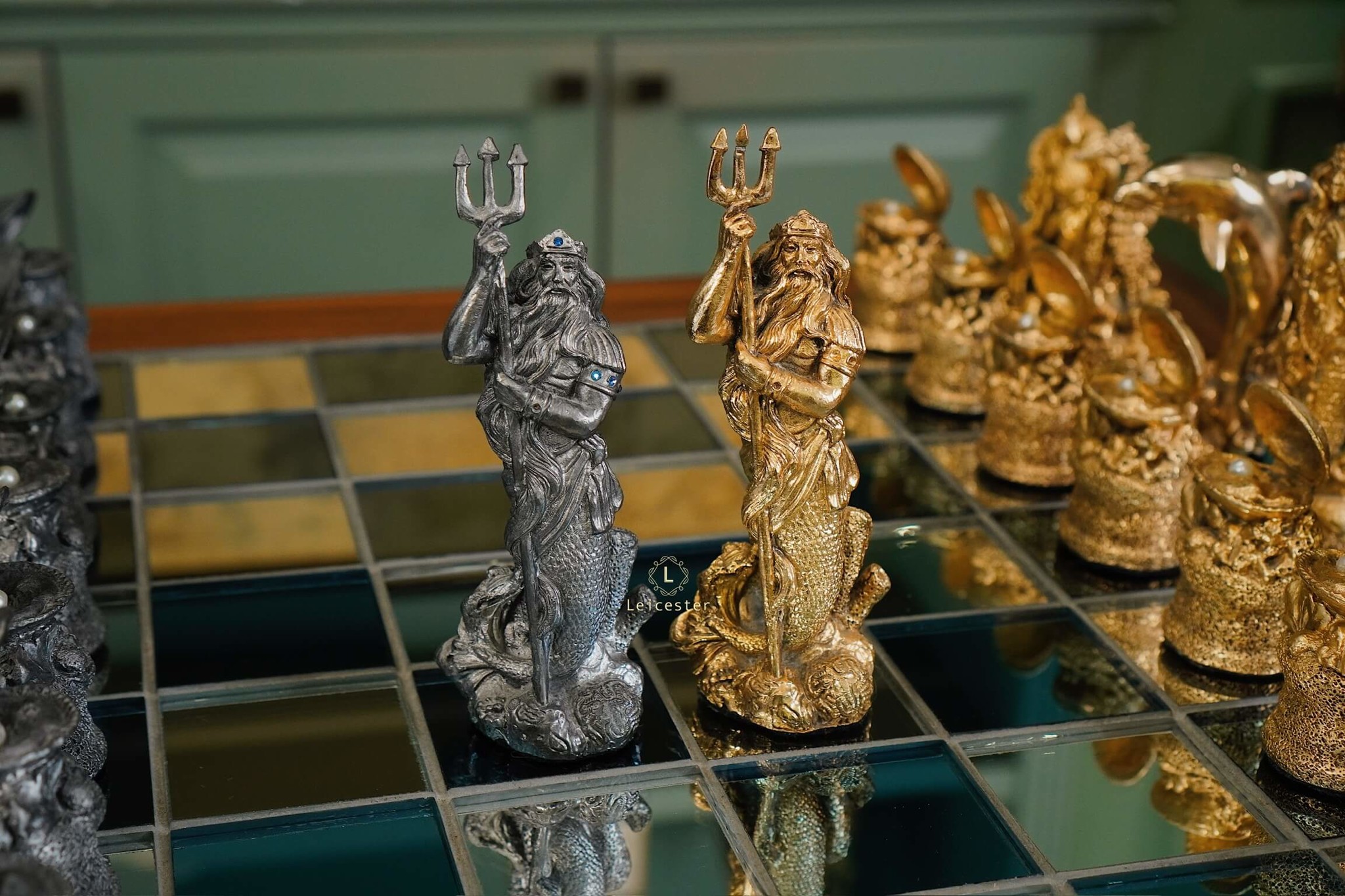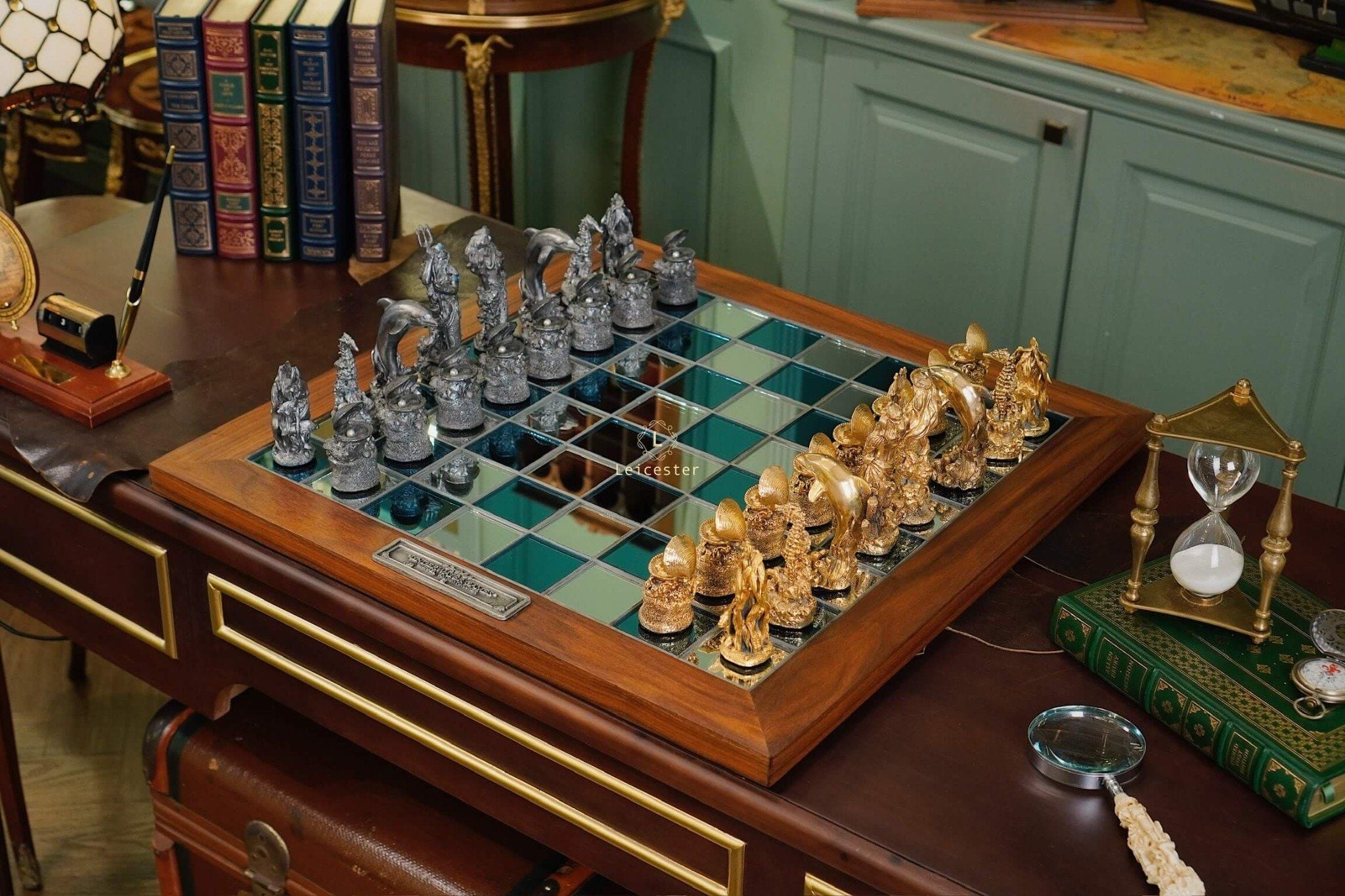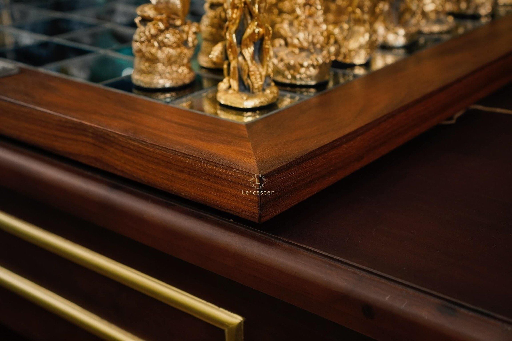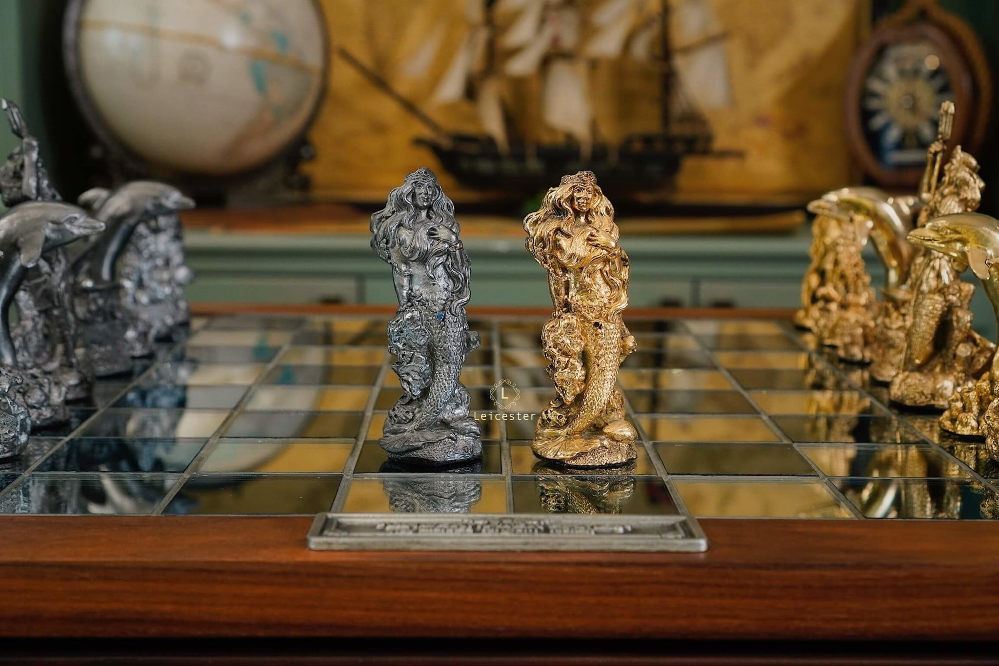 - Quân cờ: thiếc nguyên khối mạ vàng, đính đá, ngọc trai