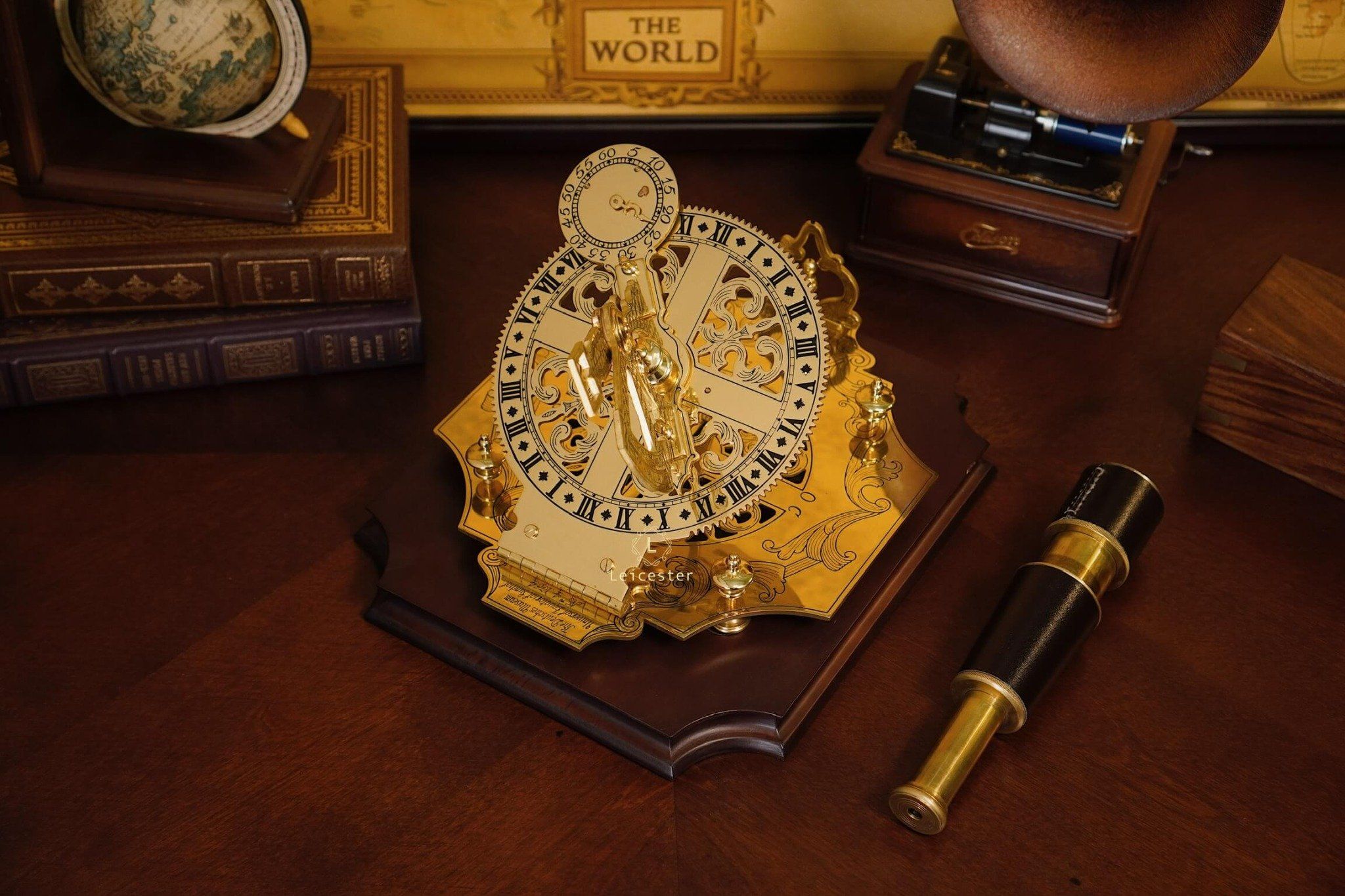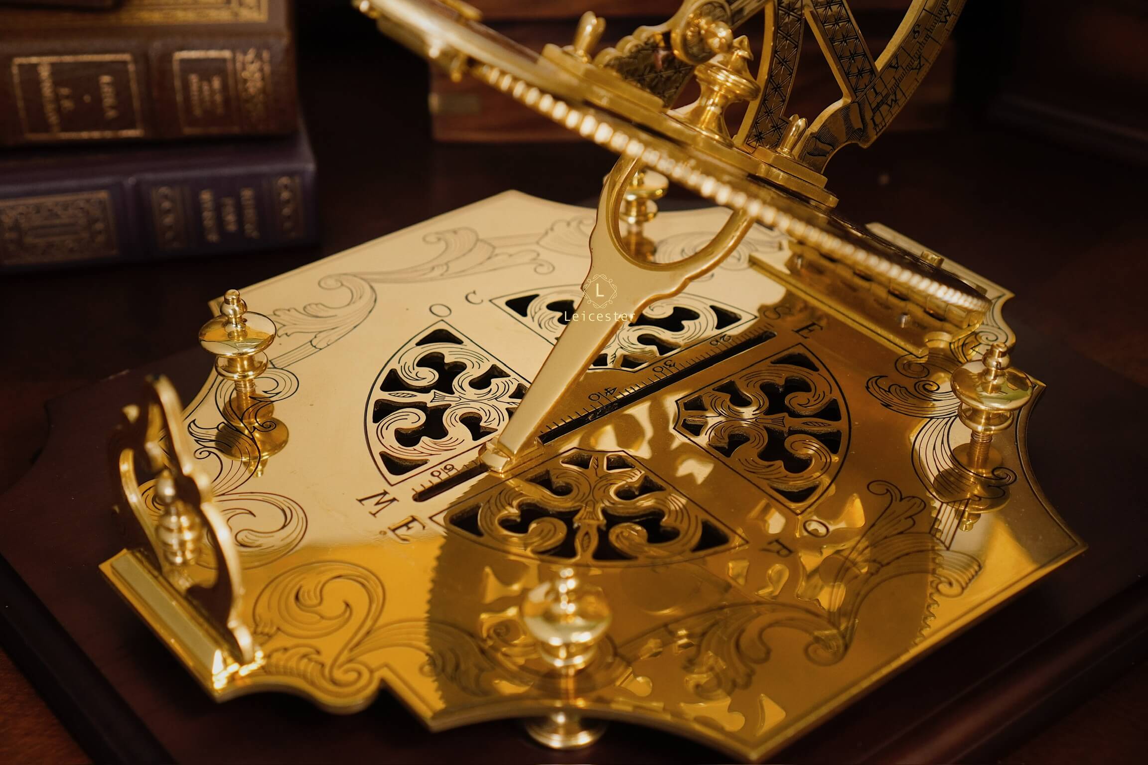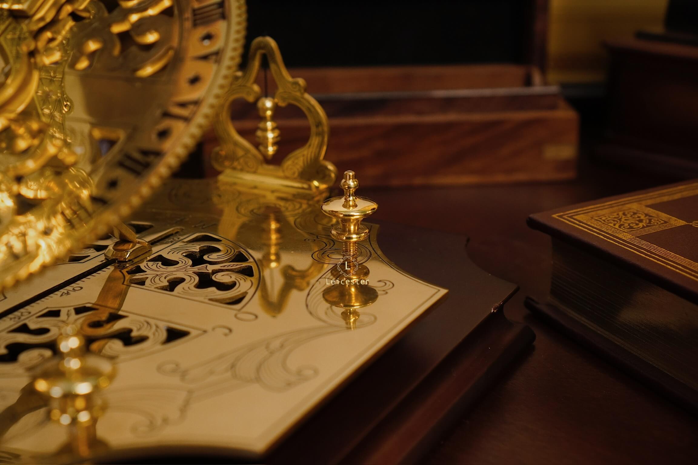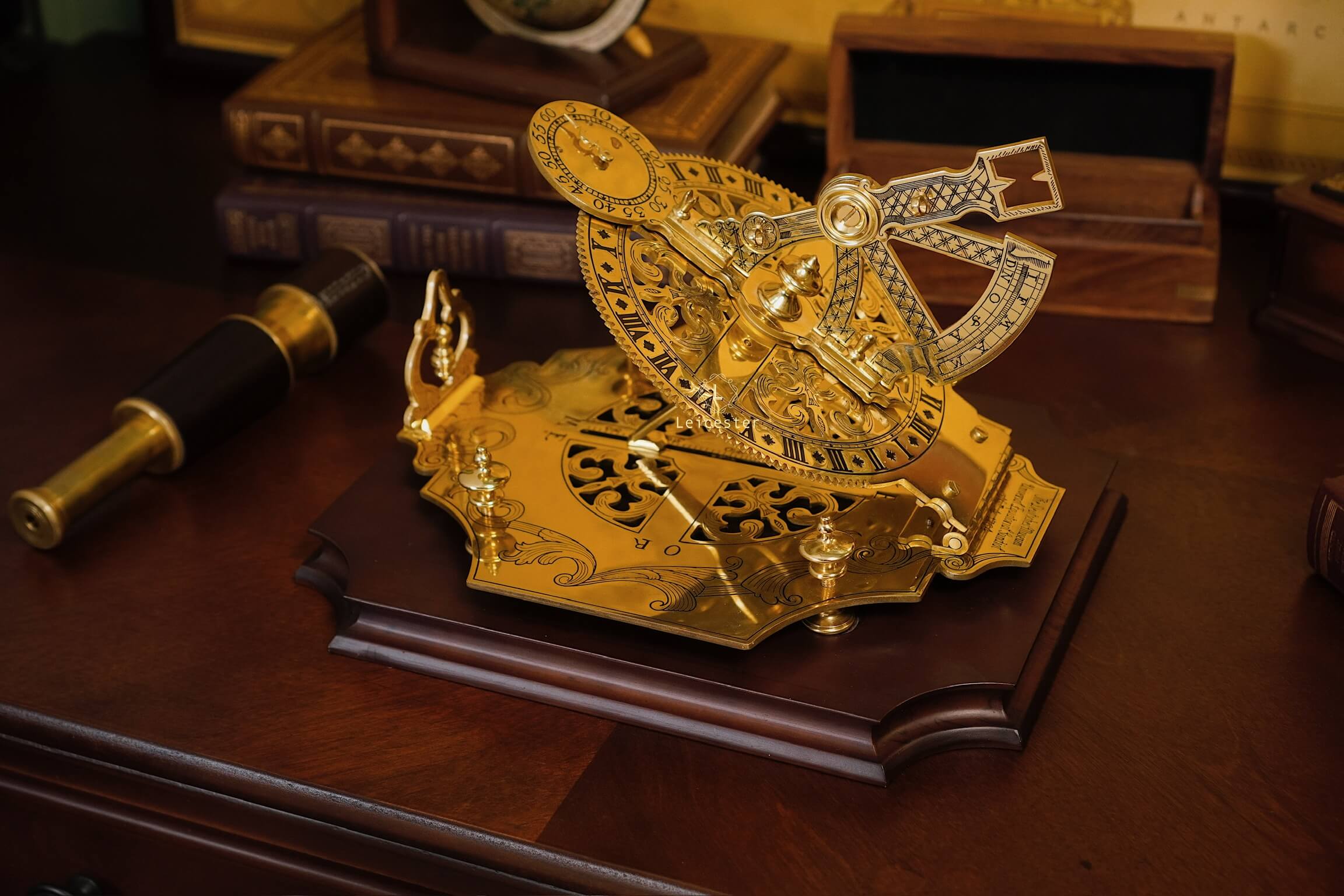 Với các chi tiết phức tạp và sự khéo léo chính xác, bản sao đồng hồ xích đạo này nắm bắt được bản chất nguyên bản lịch sử của nó. Tấm quay số được tạo ra một cách kỳ công, cho phép ánh sáng mặt trời đổ bóng và chỉ ra thời gian chính xác. Đồng hồ bao gồm một gnomon có bản lề và cụm ngắm và vít cân bằng để căn chỉnh chính xác cho phần đế.