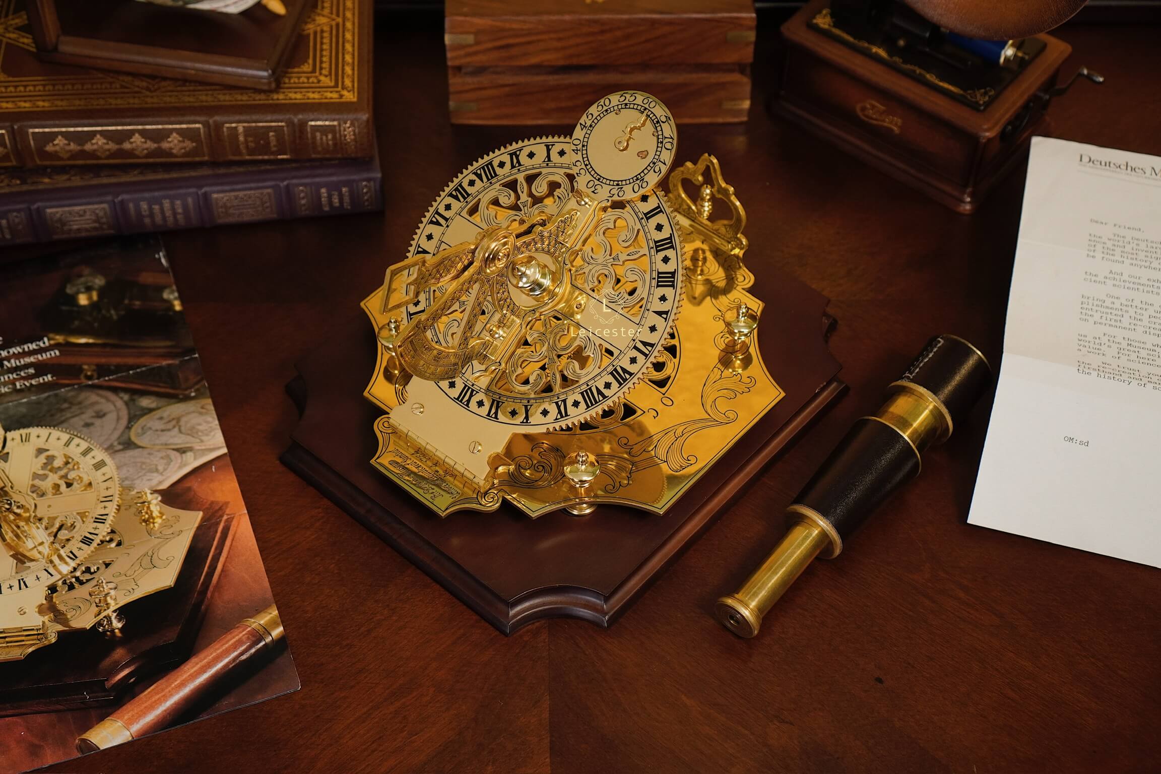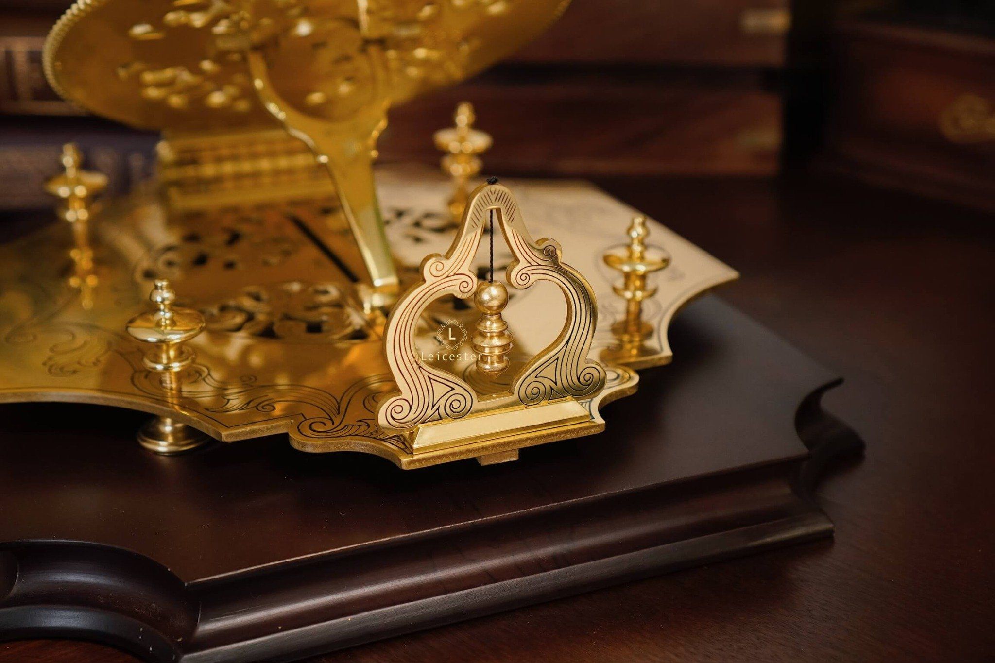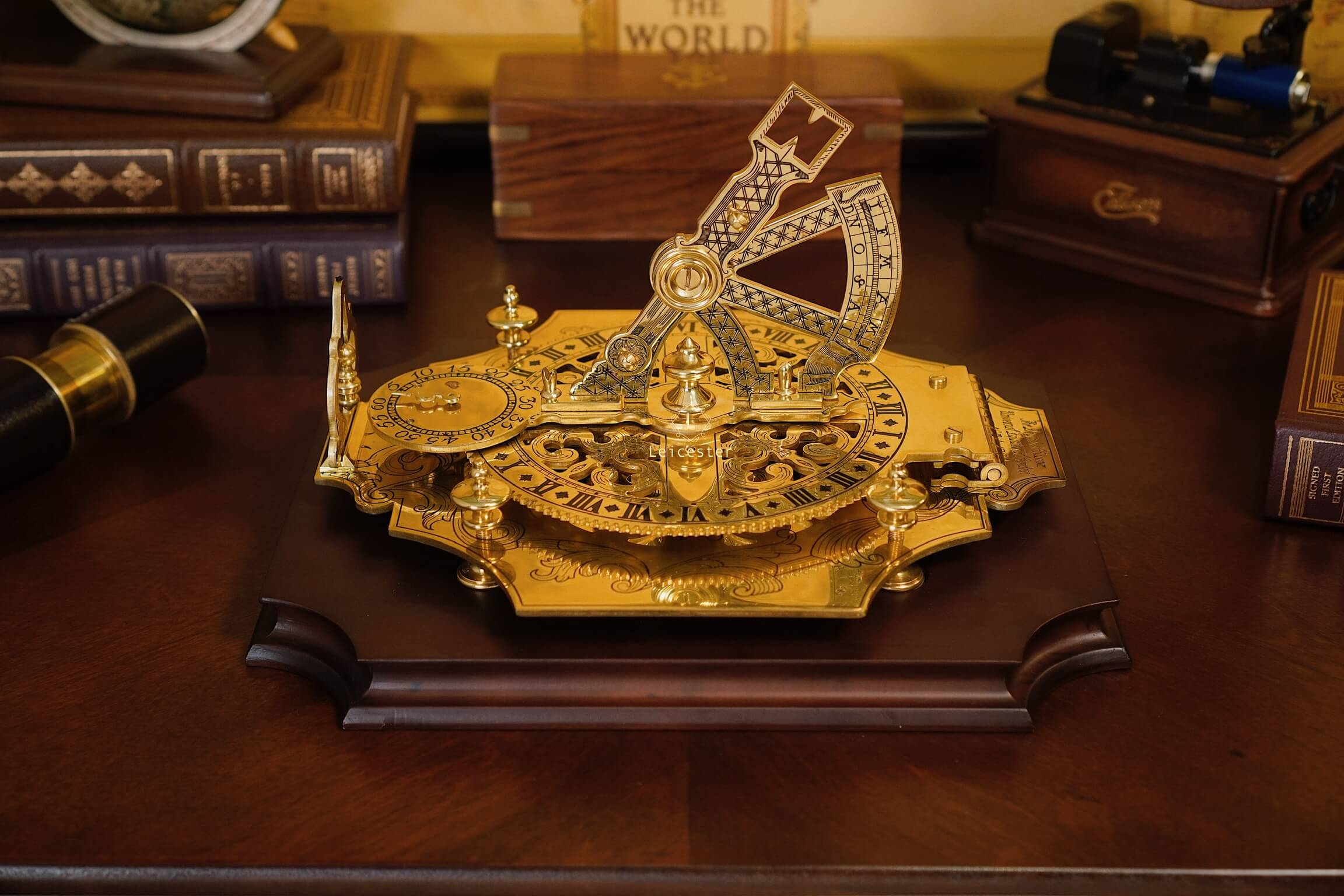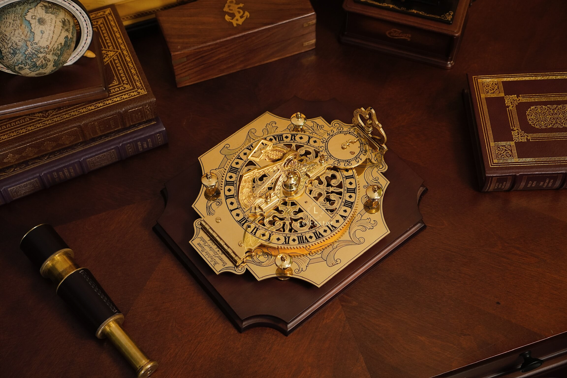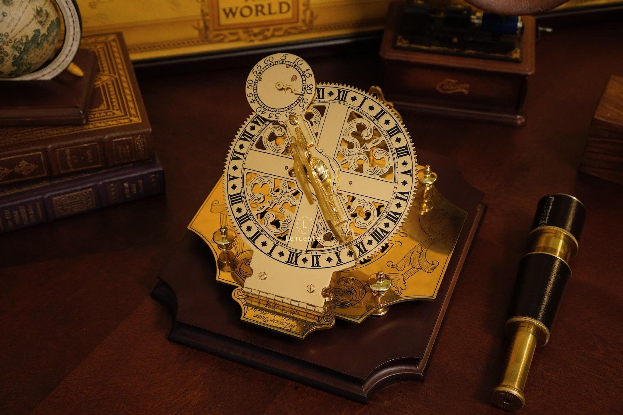 Với các chi tiết phức tạp và sự khéo léo chính xác, bản sao đồng hồ xích đạo này nắm bắt được bản chất nguyên bản lịch sử của nó. Tấm quay số được tạo ra một cách kỳ công, cho phép ánh sáng mặt trời đổ bóng và chỉ ra thời gian chính xác. Đồng hồ bao gồm một gnomon có bản lề và cụm ngắm và vít cân bằng để căn chỉnh chính xác cho phần đế.