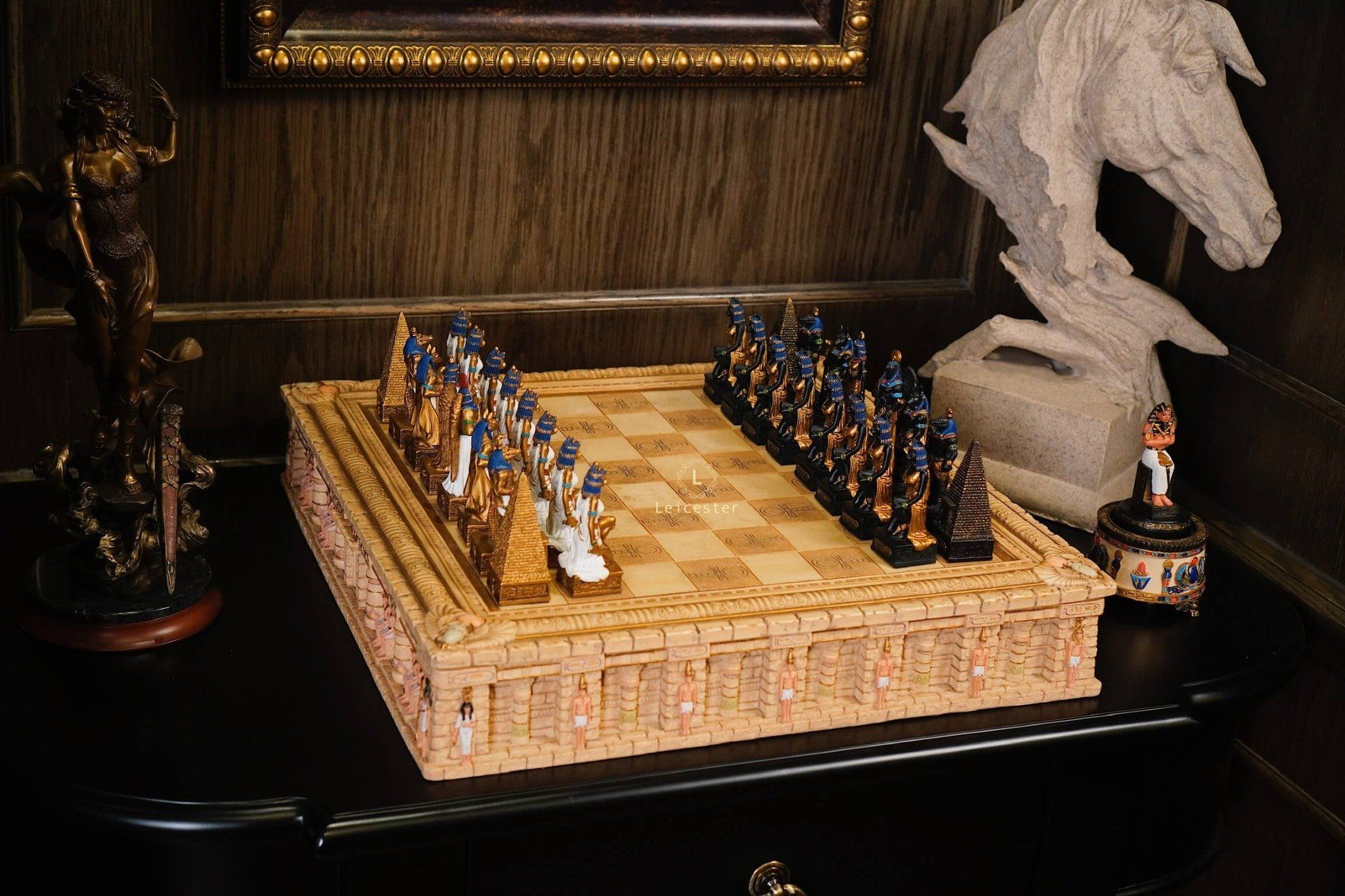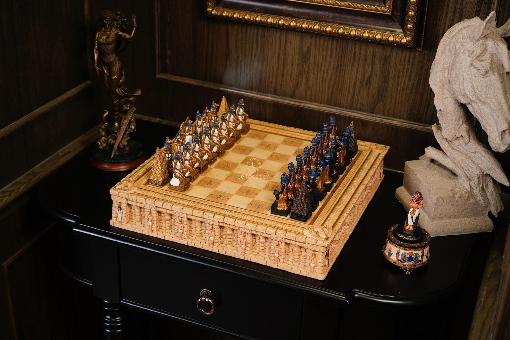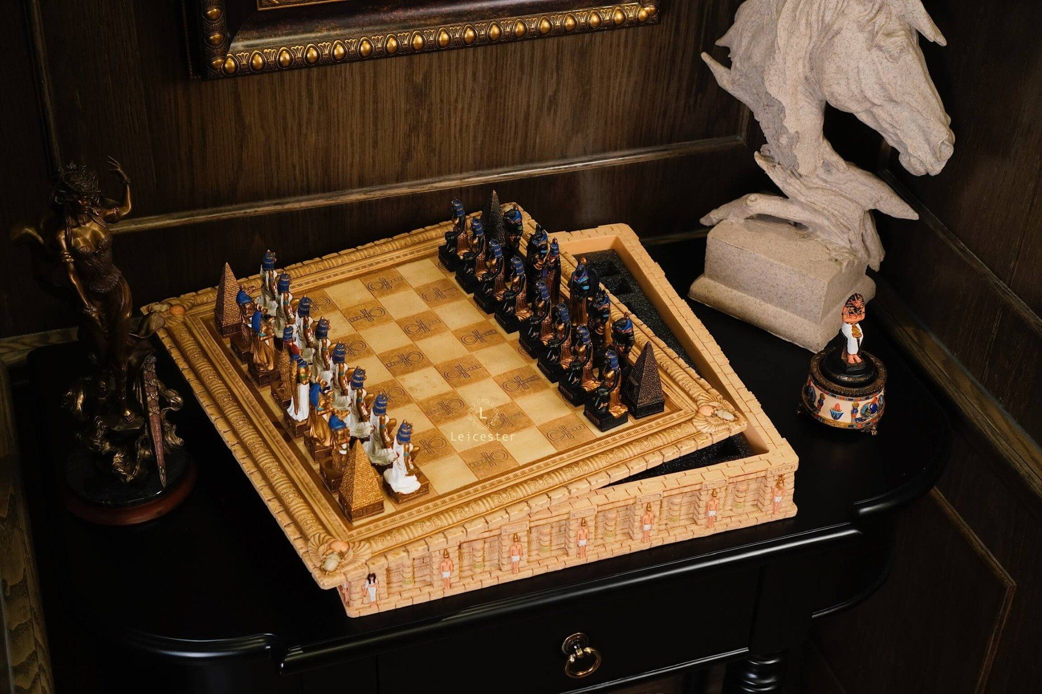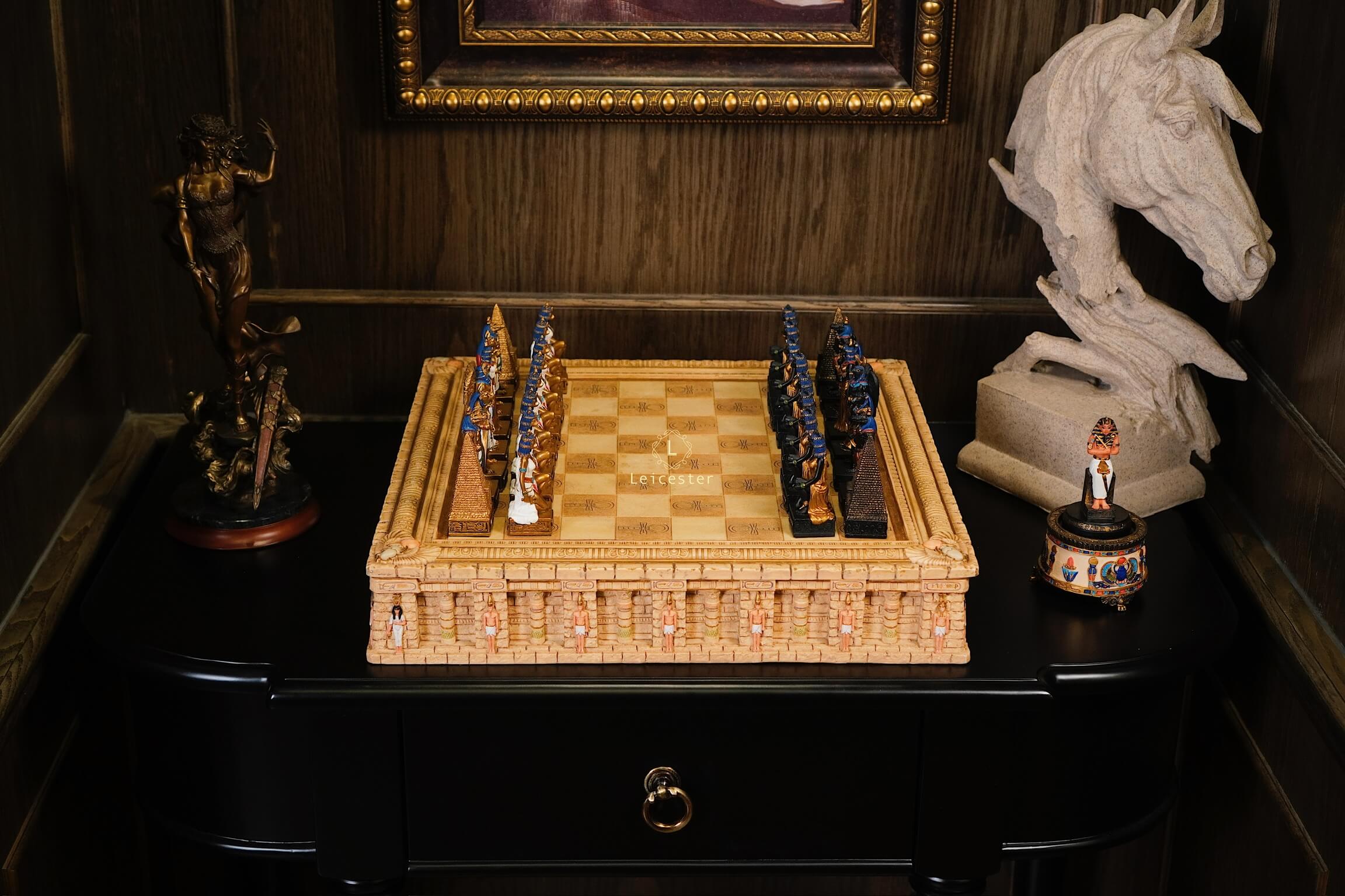 Là bộ cờ vua thủ công cao cấp lấy cảm hứng từ thần thoại Ai Cập của Veronese Design - một thương hiệu nổi tiếng toàn cầu chuyên sản xuất các tác phẩm nghệ thuật trang trí mang phong cách thần thoại, cổ đại và tôn giáo.