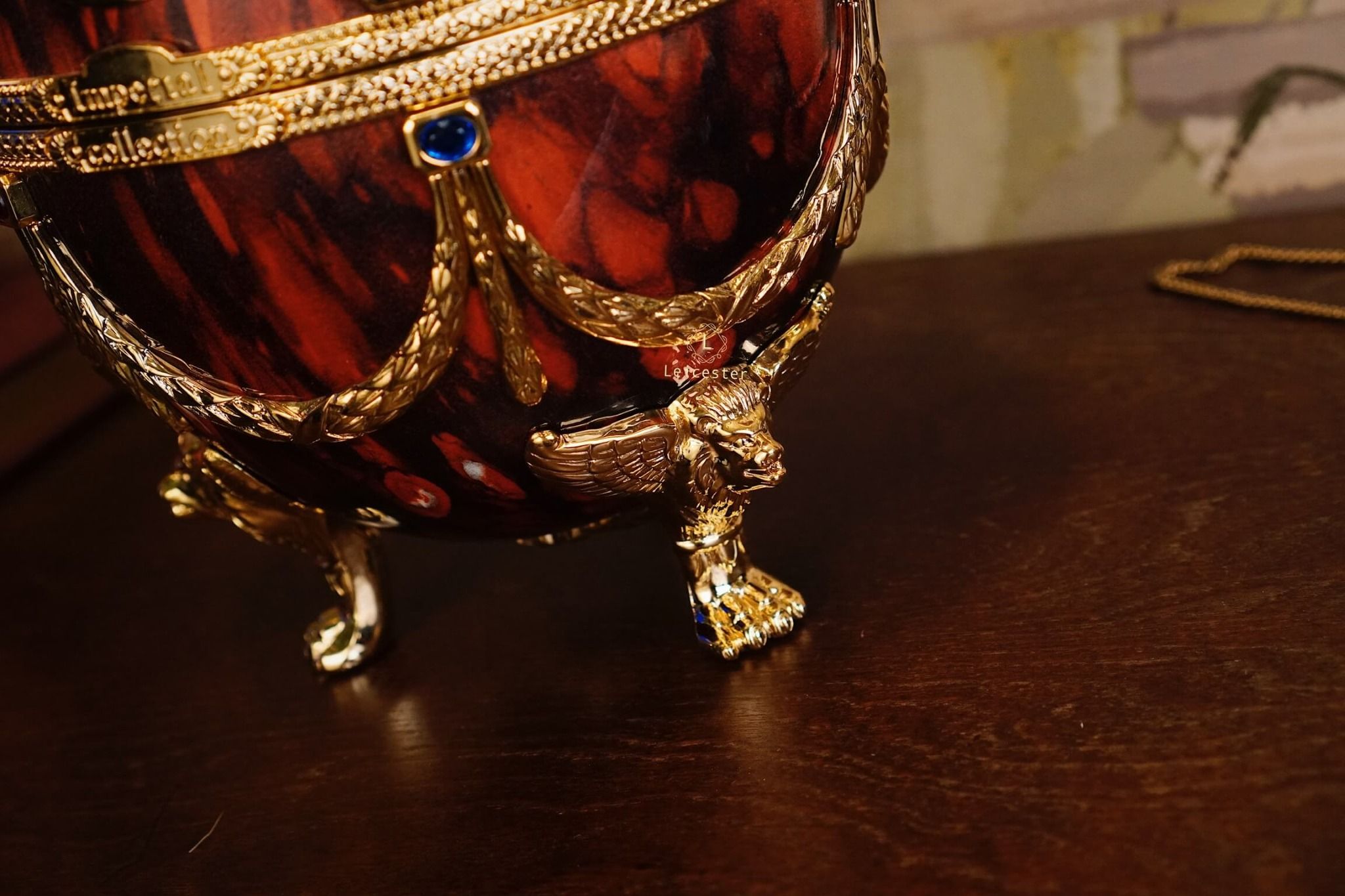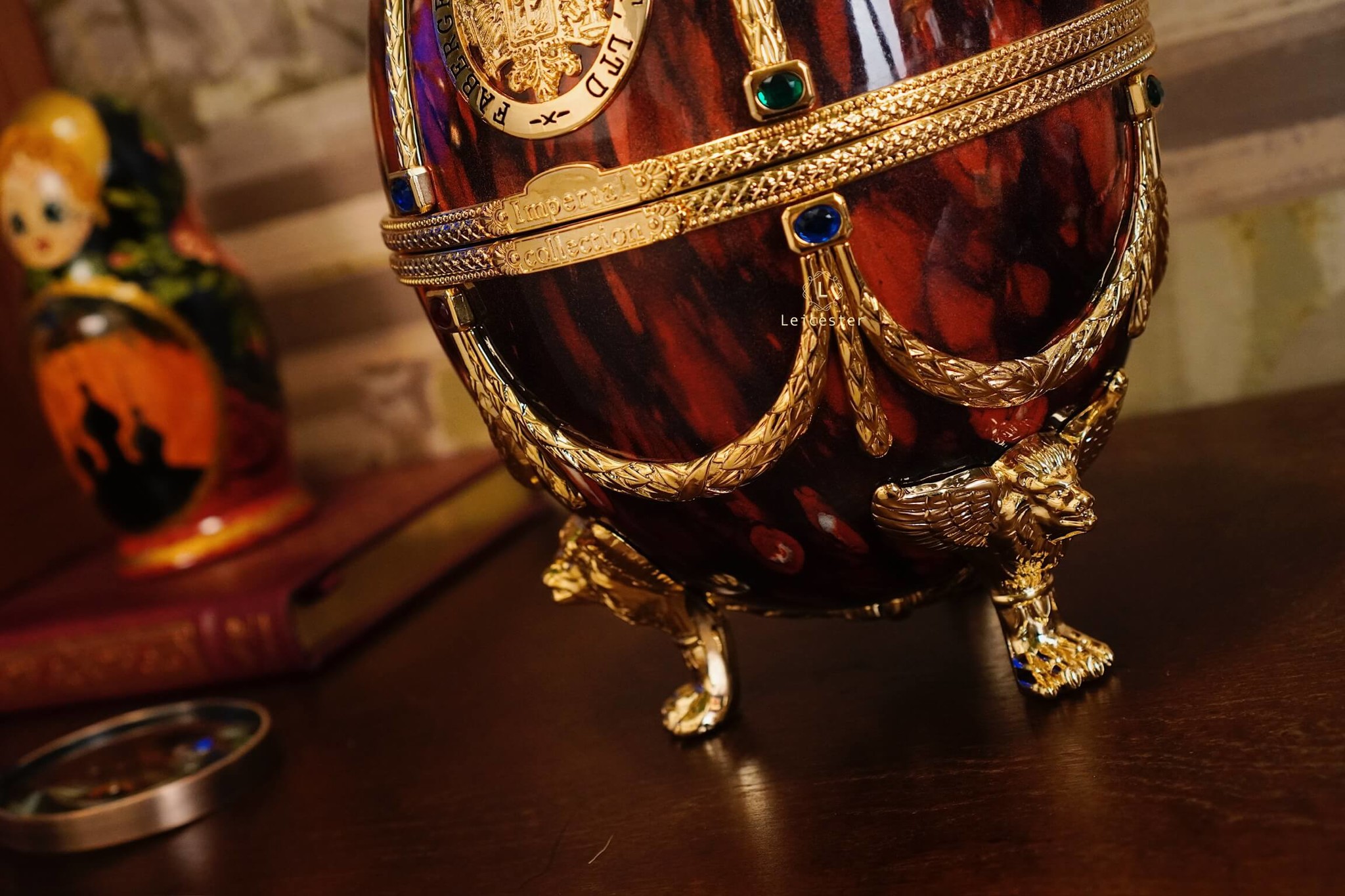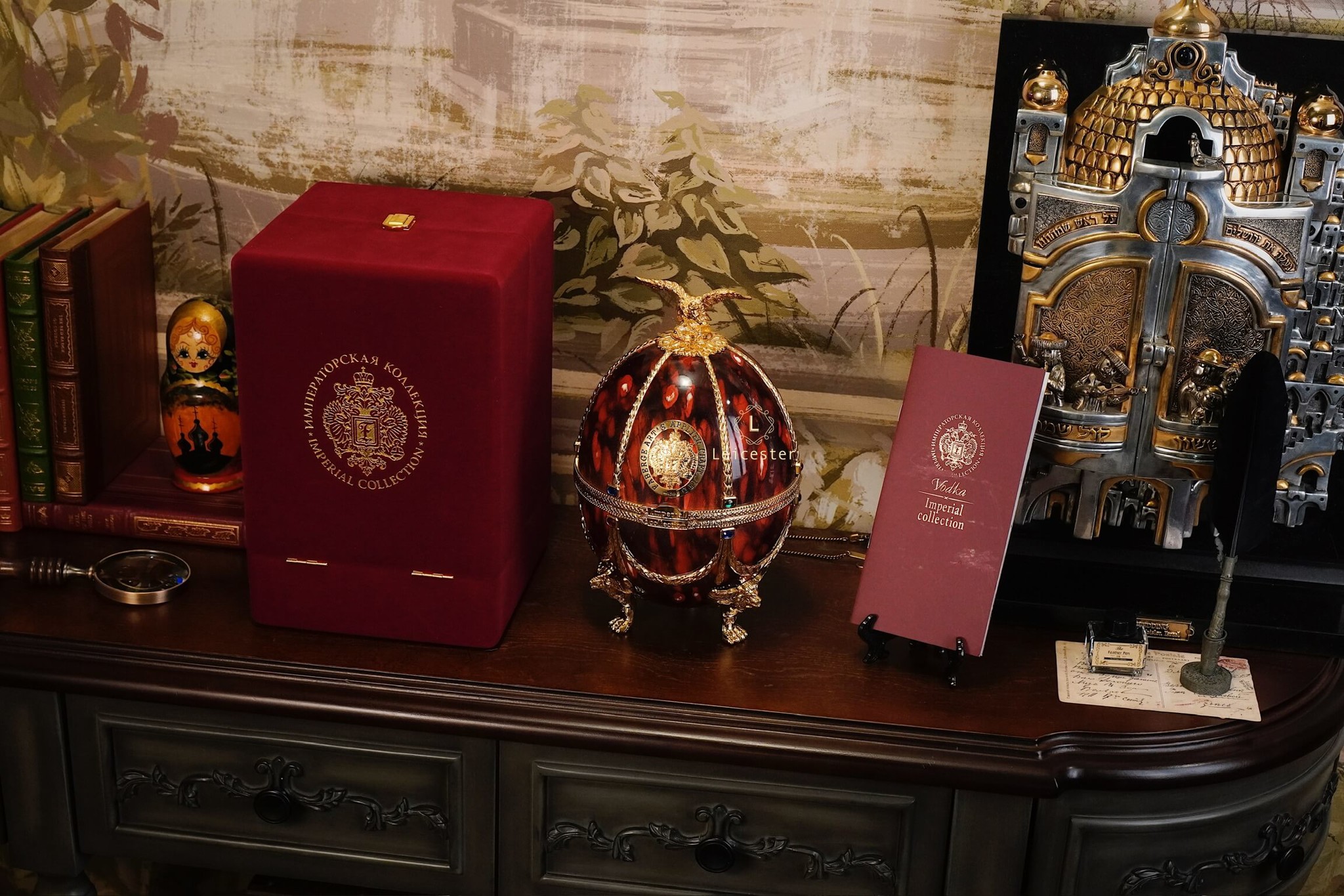 Vodka Imperial Faberge bao gồm bình đựng rượu có dung tích 0,75L và bốn ly được làm bằng thủy tinh Venice, nắp bình được đính pha lê Swarovski đỏ ở trên cùng kết hợp với giá đỡ ly. Hộp đựng dưới dạng trứng Phục sinh Faberge được làm bằng kim loại tráng men màu và được trang trí bằng các chi tiết mạ vàng có đính đá quý tự nhiên. Trên đỉnh quả trứng là 1 chú đại bàng, đầu đội vương miện thể hiện sự uy quyền và thống lĩnh, xung quanh phần đáy là những Winged Lion King.
